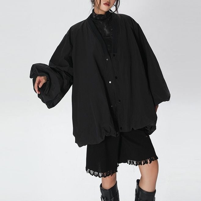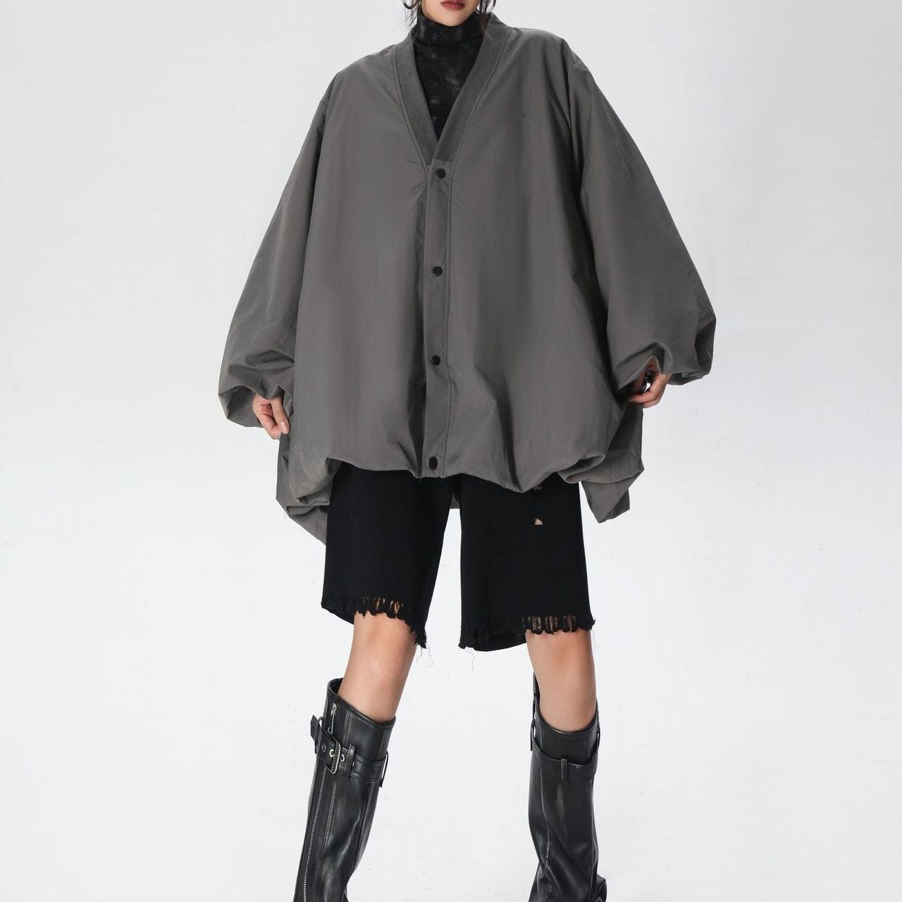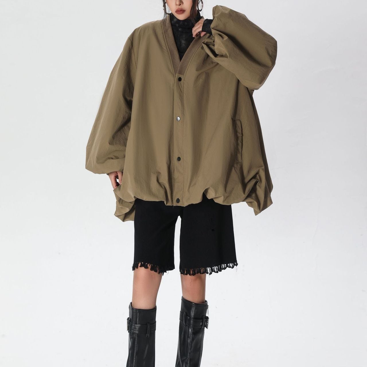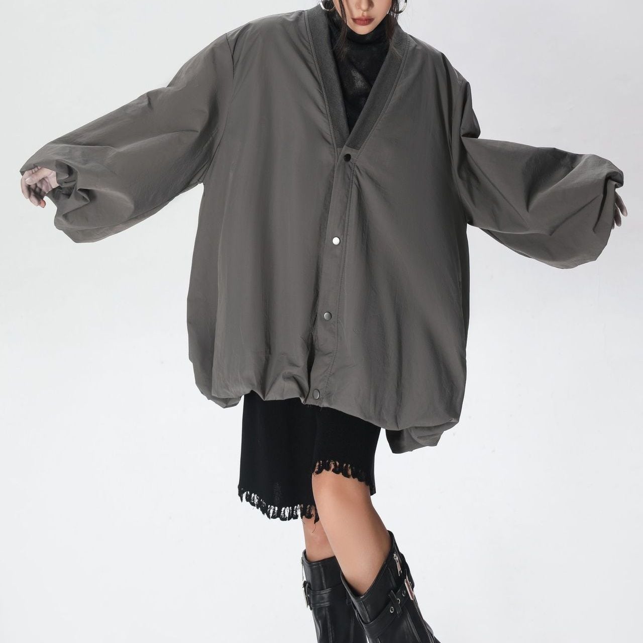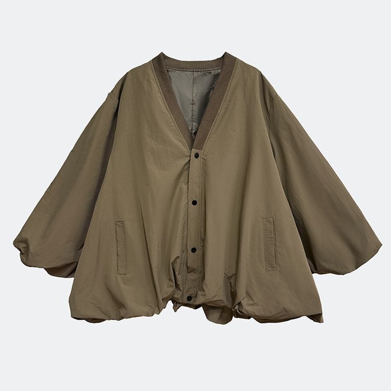 バルーンのように膨らんだ袖口や裾のシルエットがキュートな、Vネック・長袖・デザインジャケットです。リブ加工されたネック部分がアクセントになった、単色のオーバーサイズで合わせやすいアイテムです。色は3色から選べます。