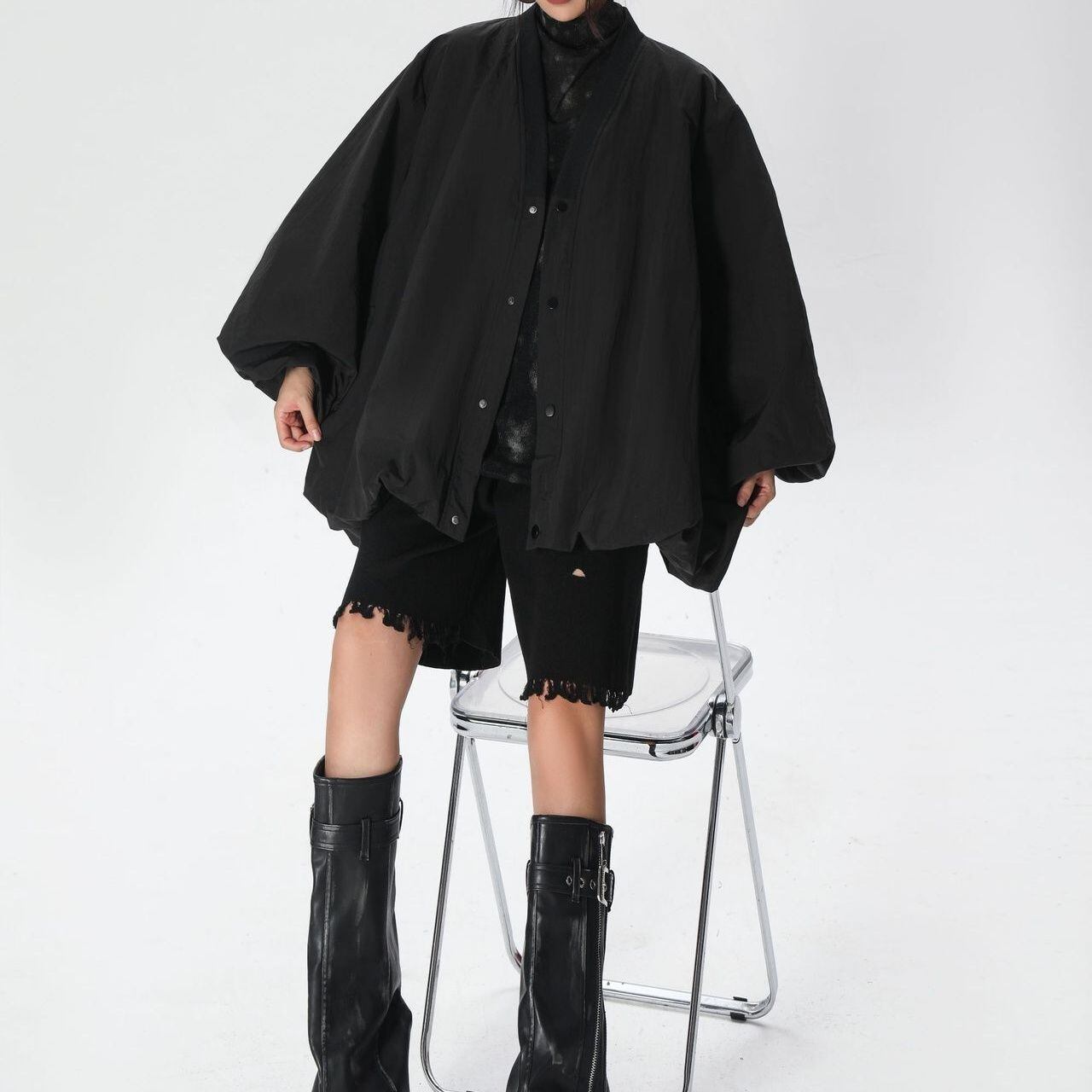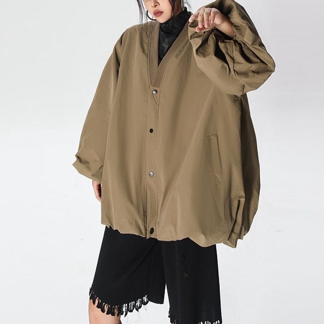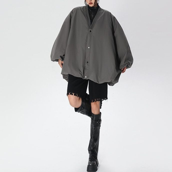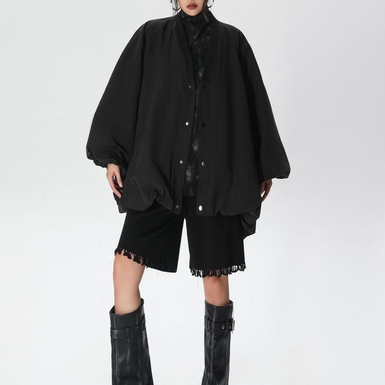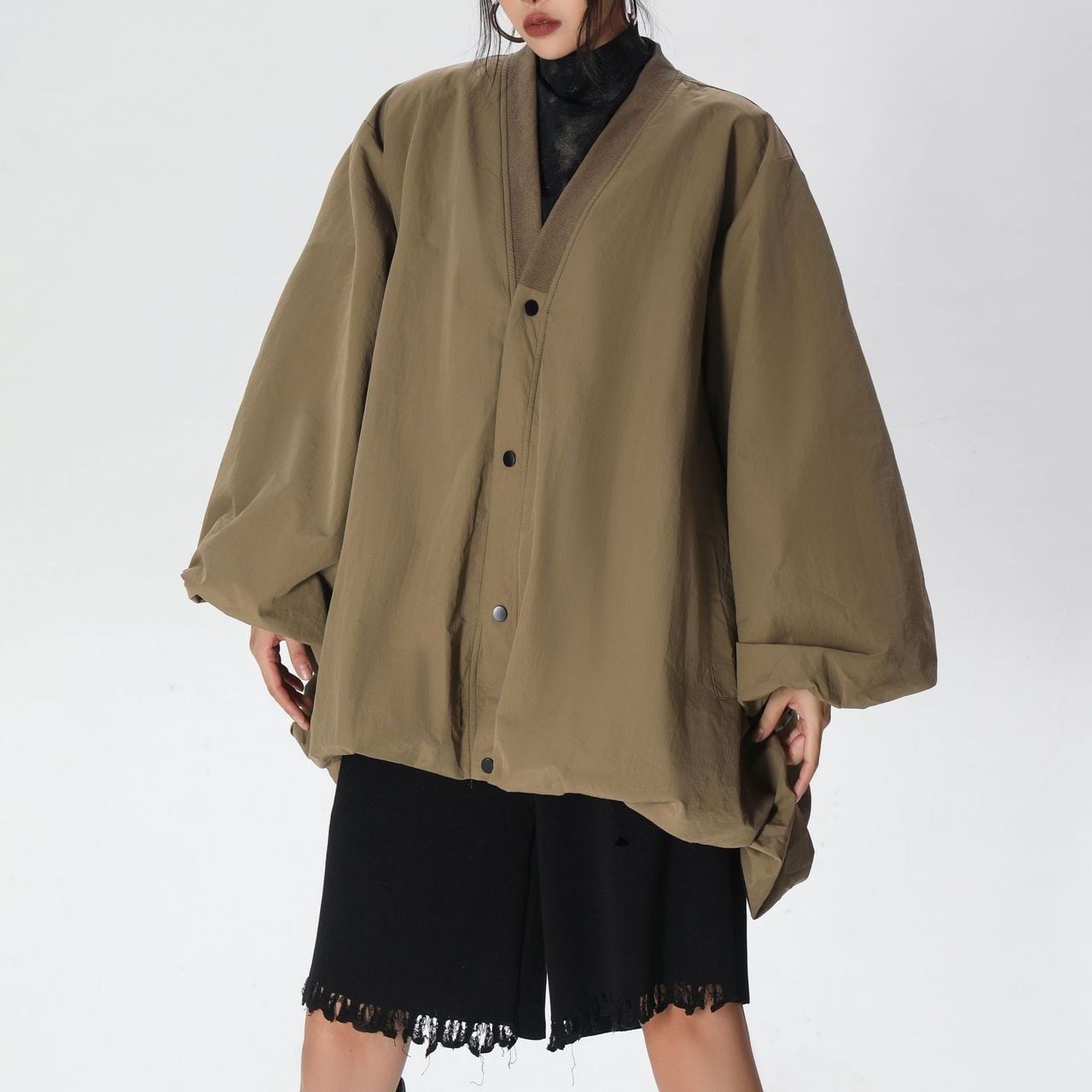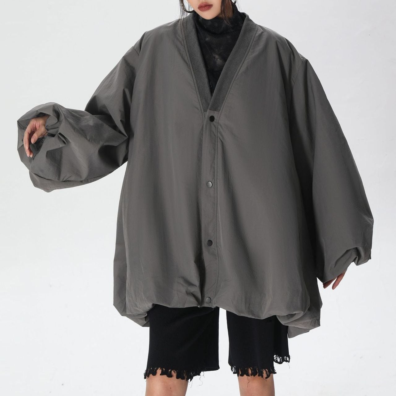 バルーンのように膨らんだ袖口や裾のシルエットがキュートな、Vネック・長袖・デザインジャケットです。リブ加工されたネック部分がアクセントになった、単色のオーバーサイズで合わせやすいアイテムです。色は3色から選べます。