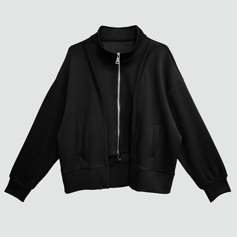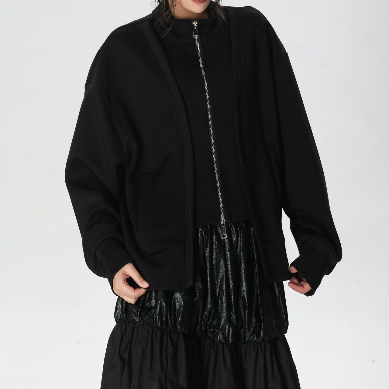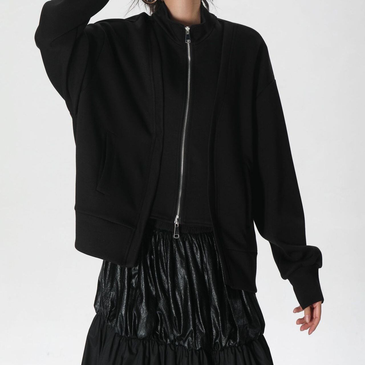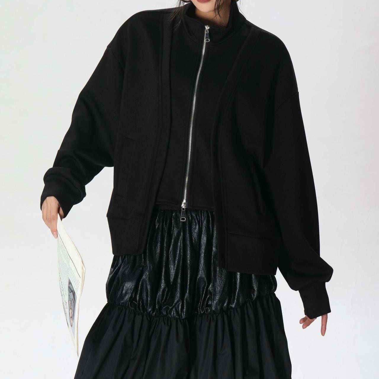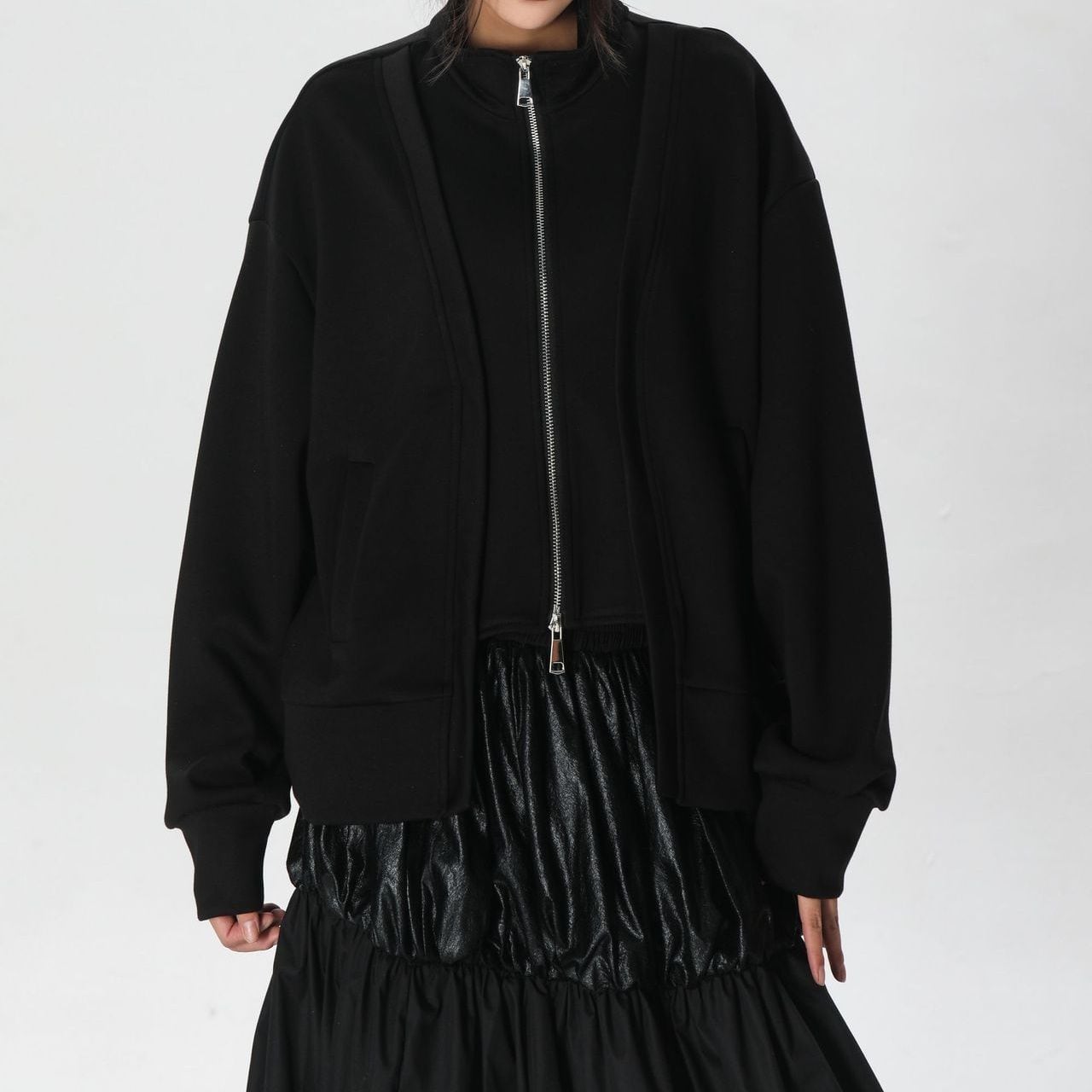 ブラックのスウェット素材でできた、スタンドカラー・長袖・フルジップのカジュアルジャケットです。丈の異なるフェイクツーピースデザインがお洒落な、クールな印象の合わせやすいアイテムです。
