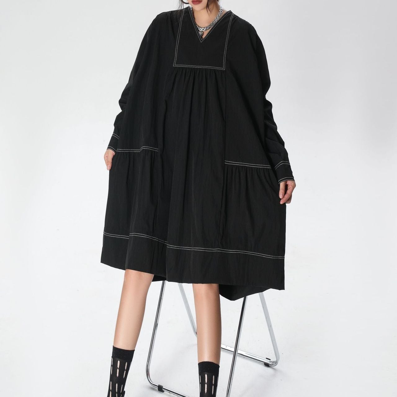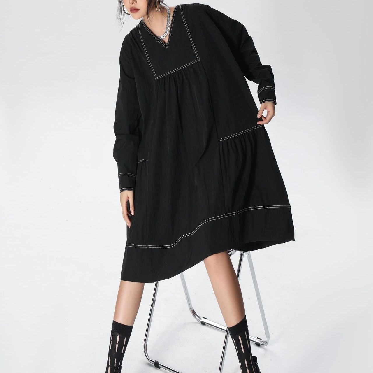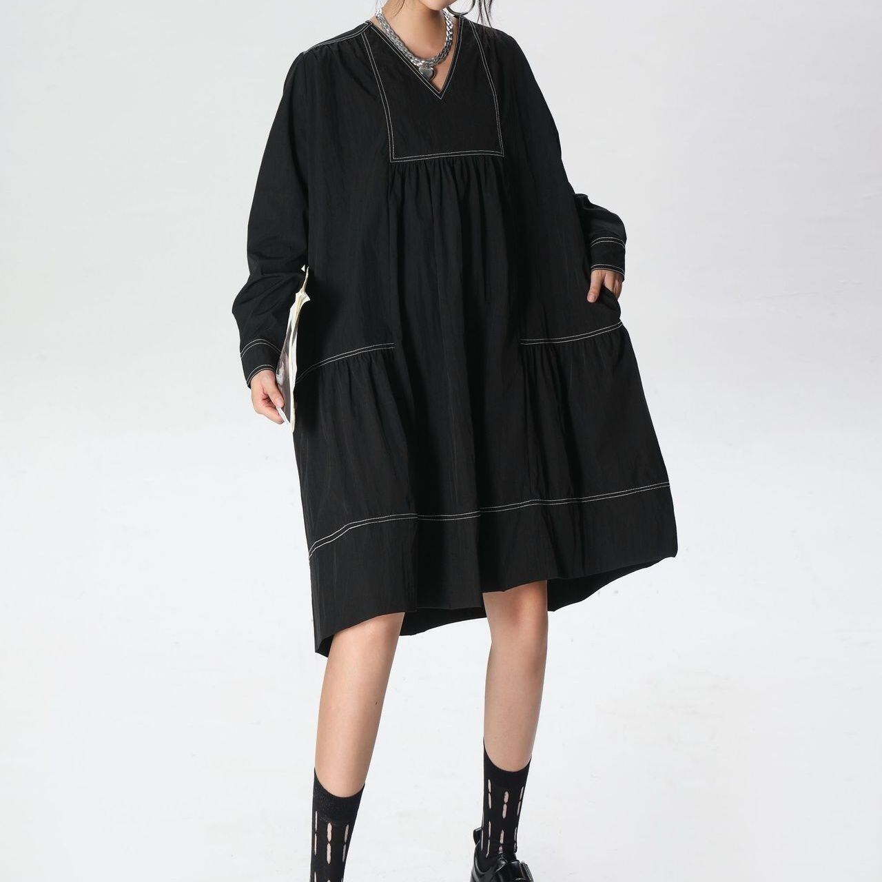 ブラック地に白いスティッチラインがキュートな、Vネック・長袖・膝丈のプルオーバーシャツワンピースです。ゆったりとしたワイド幅のAラインで、リラックスした印象のカジュアルアイテムです。