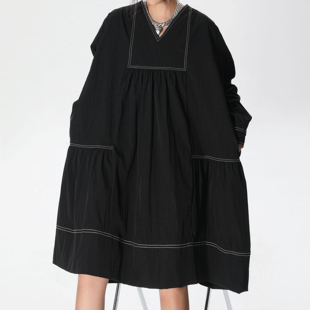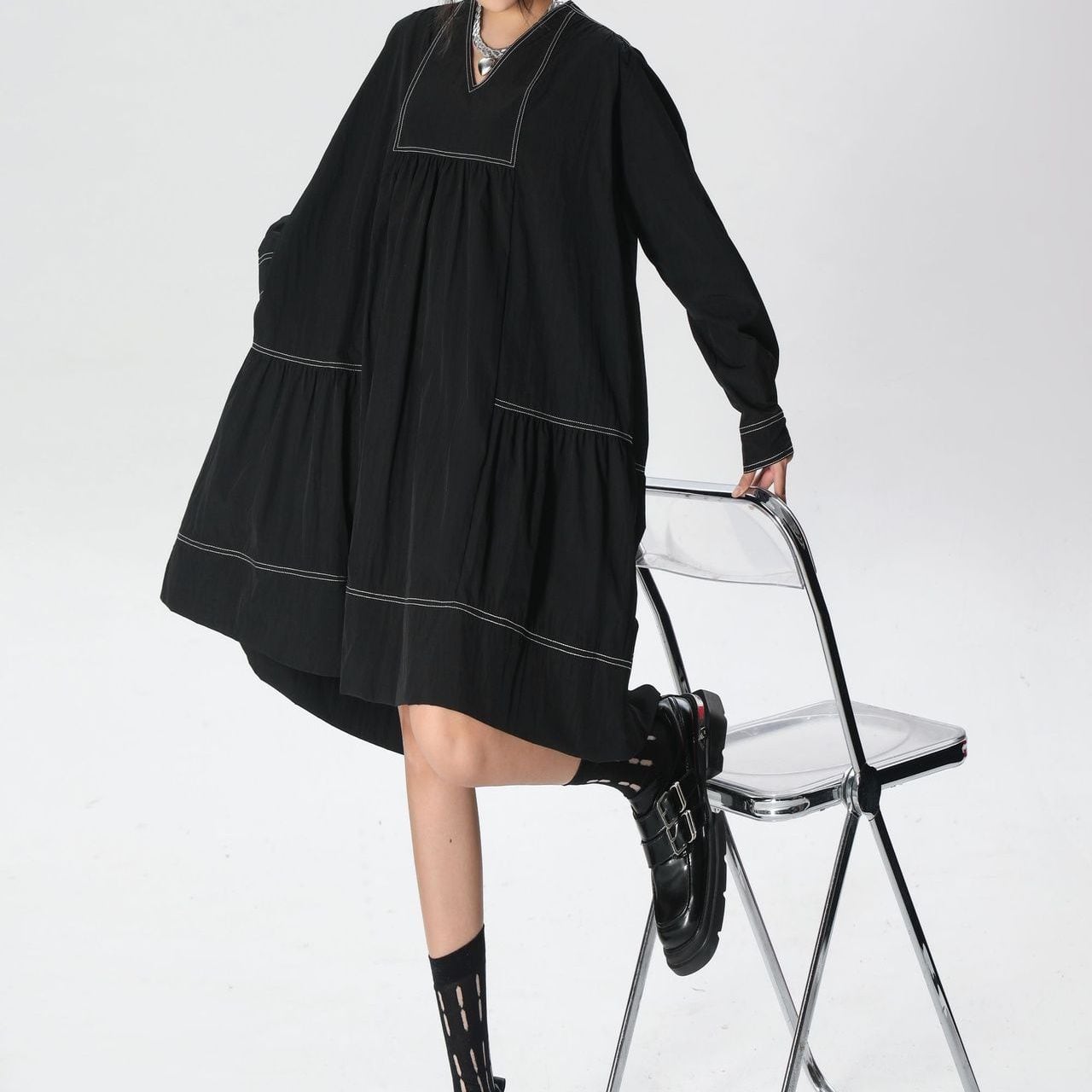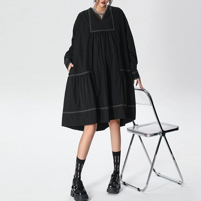 ブラック地に白いスティッチラインがキュートな、Vネック・長袖・膝丈のプルオーバーシャツワンピースです。ゆったりとしたワイド幅のAラインで、リラックスした印象のカジュアルアイテムです。
