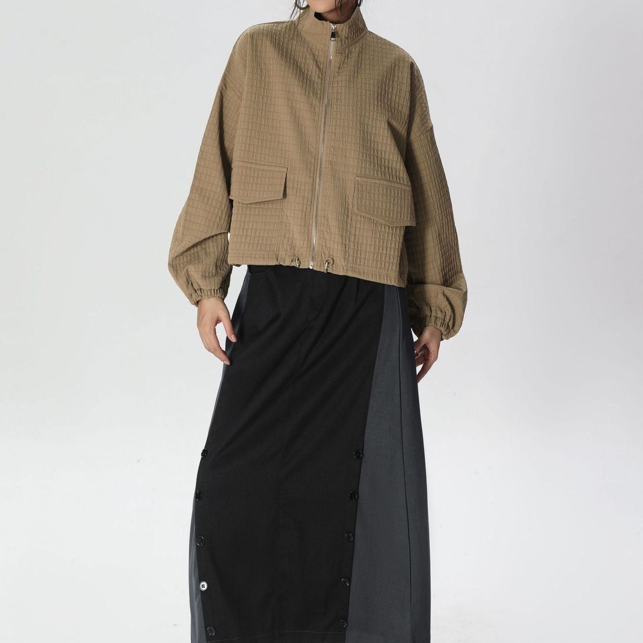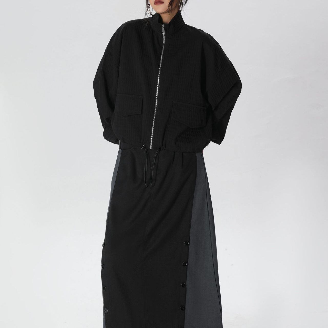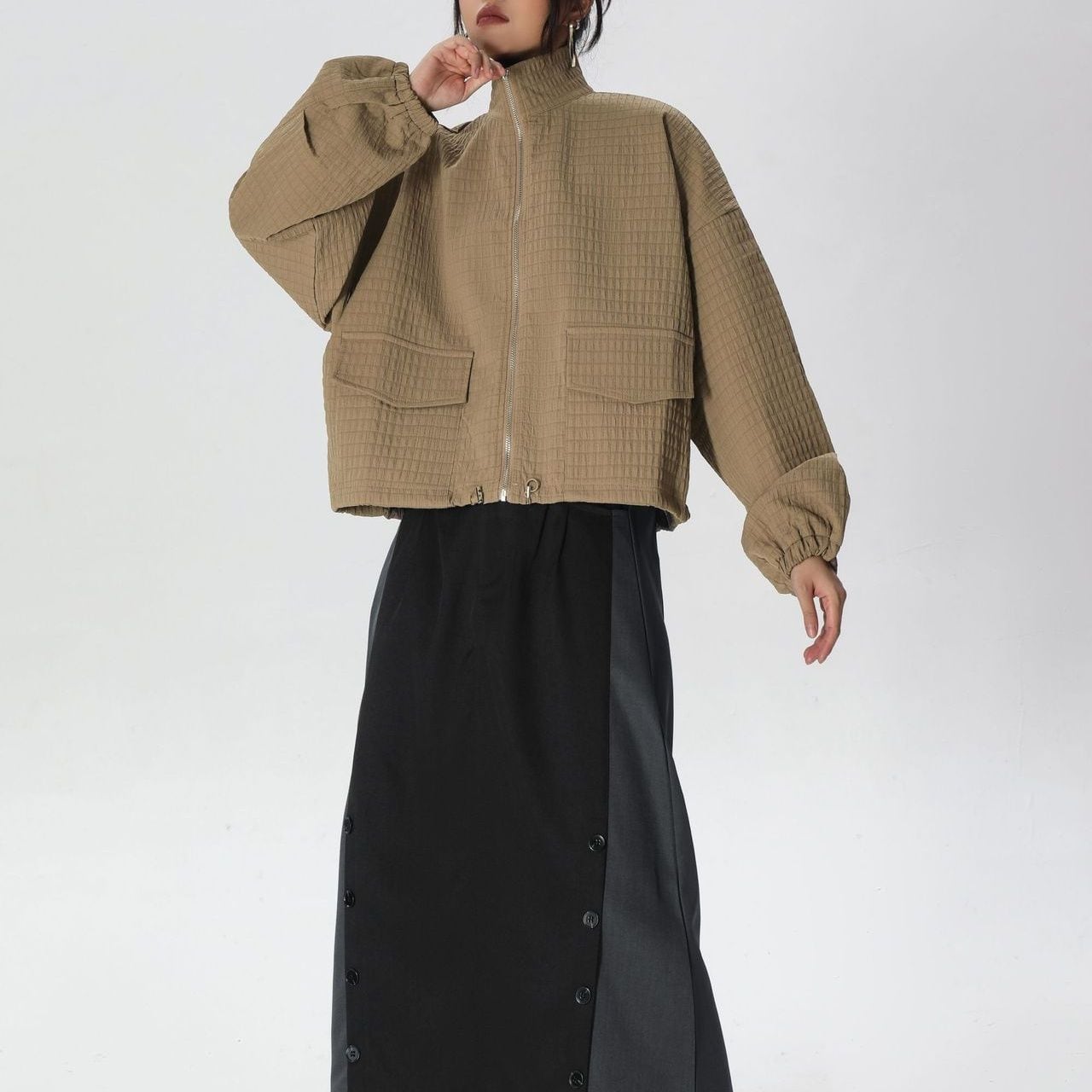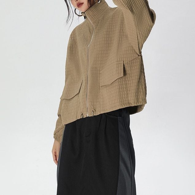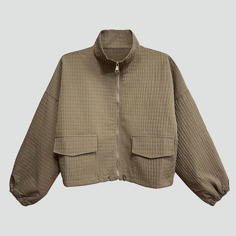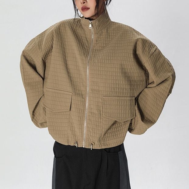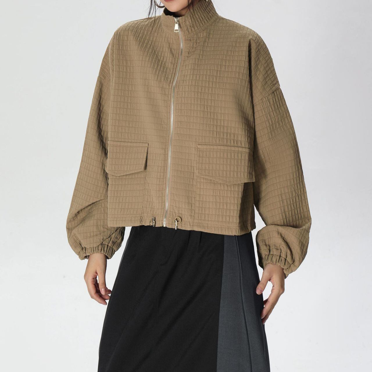 凹凸柄の単色素材がお洒落な、スタンドカラー・長袖・ショート丈のフルジップジャケットです。ゴム加工された袖口やドローコードが付いた裾のシルエットがクールな、コーディネートしやすいアイテムです。ブラックとカーキの2色から選べます。