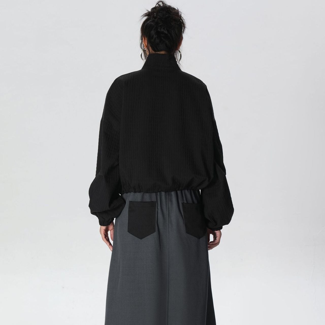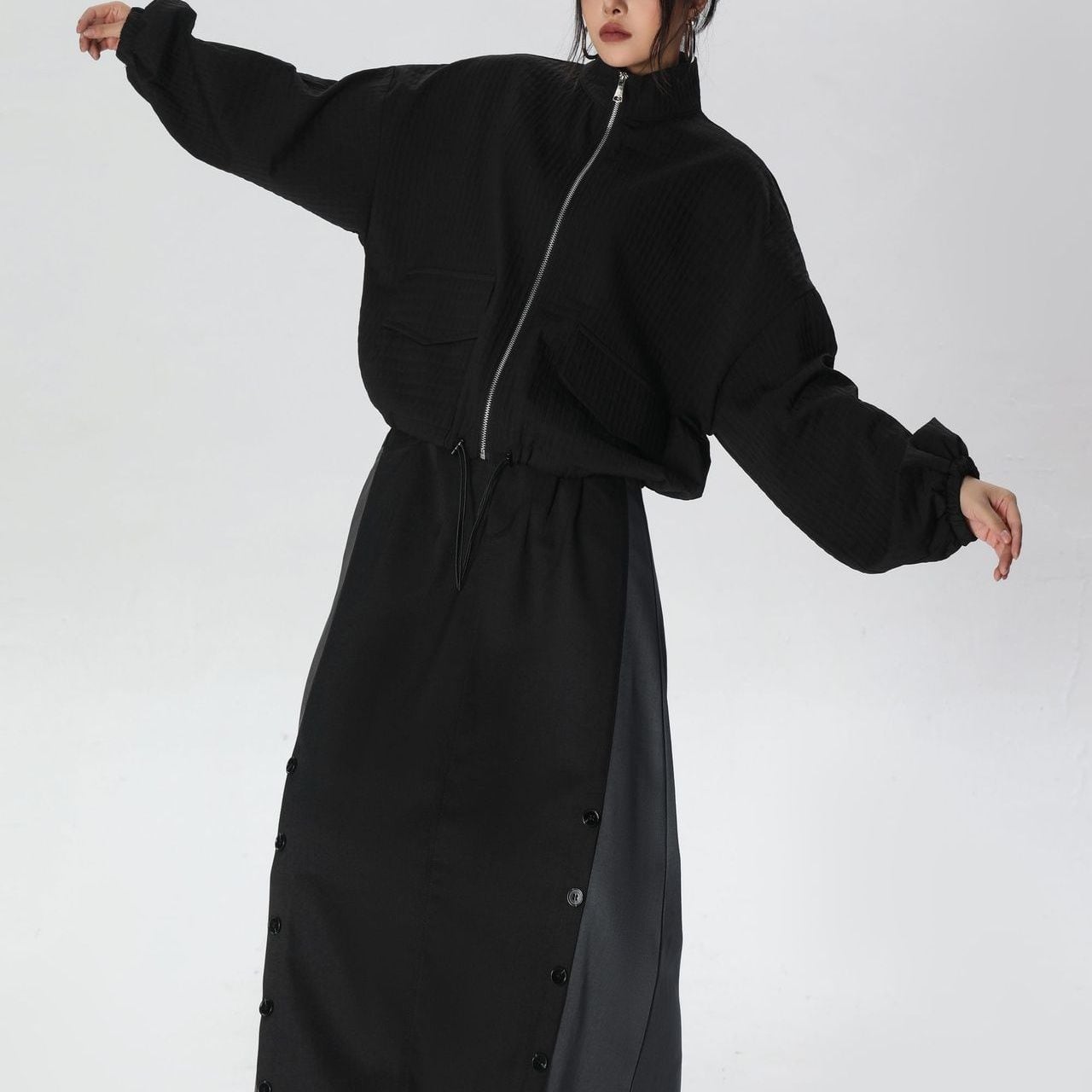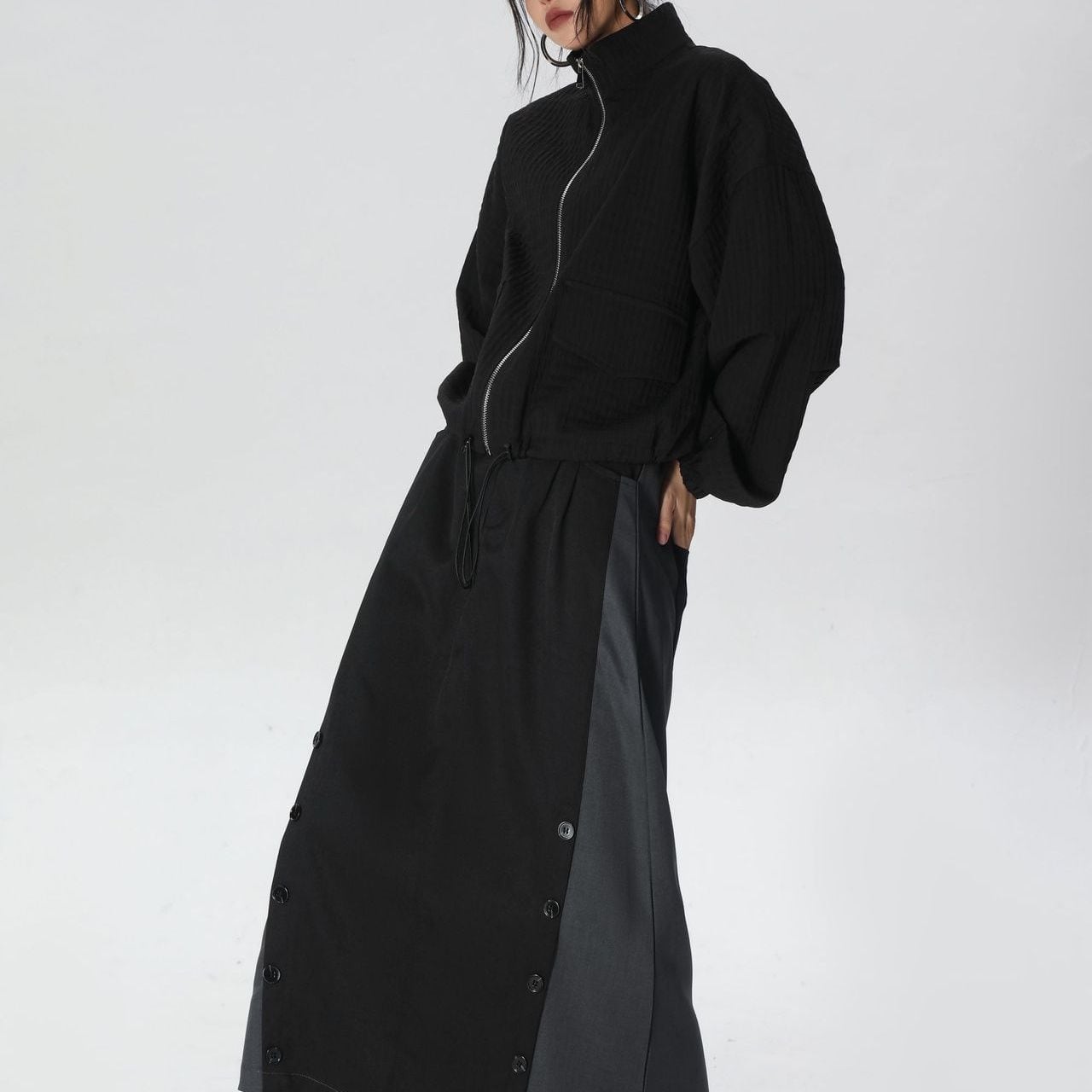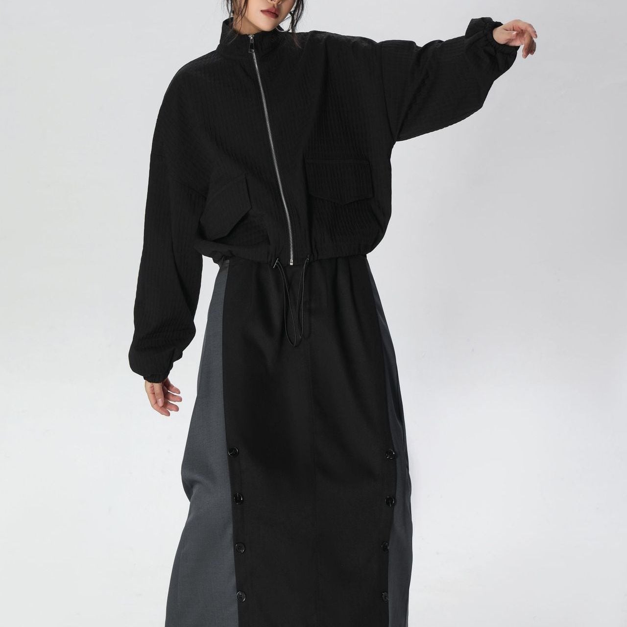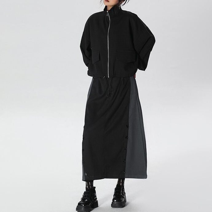凹凸柄の単色素材がお洒落な、スタンドカラー・長袖・ショート丈のフルジップジャケットです。ゴム加工された袖口やドローコードが付いた裾のシルエットがクールな、コーディネートしやすいアイテムです。ブラックとカーキの2色から選べます。