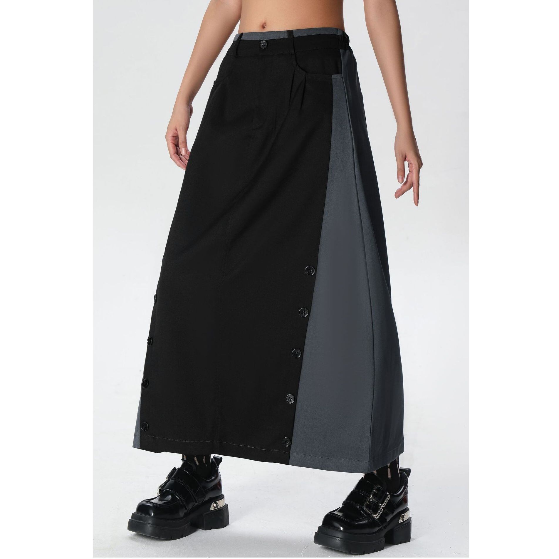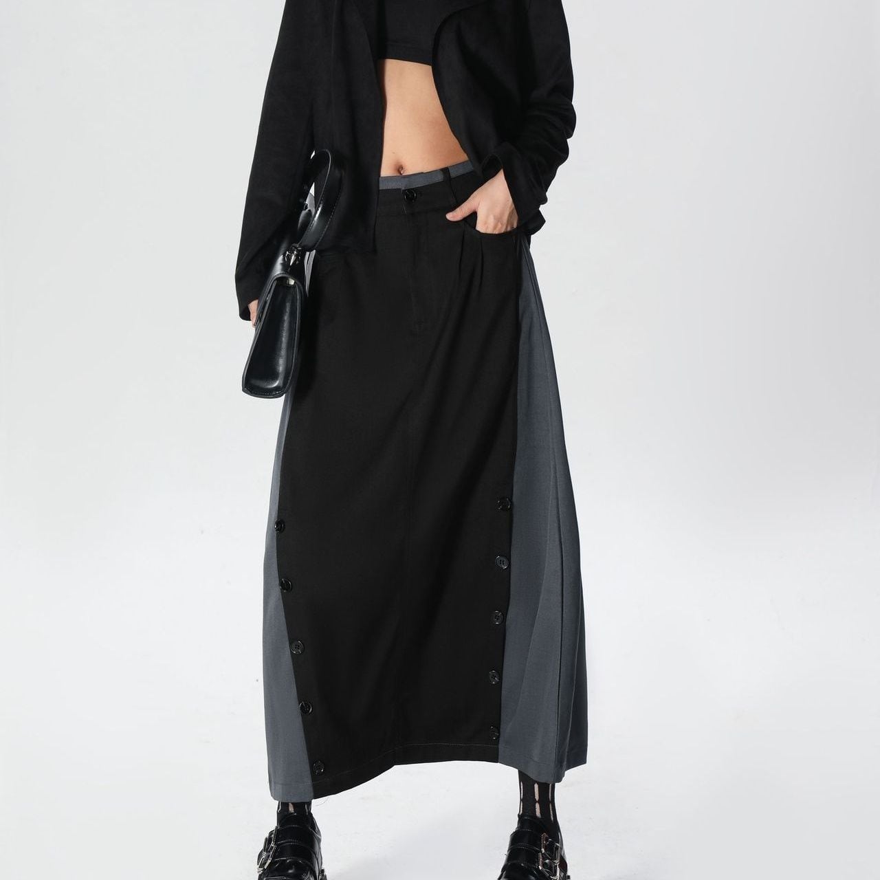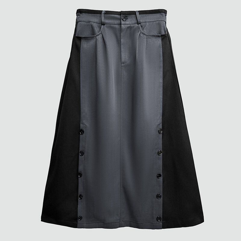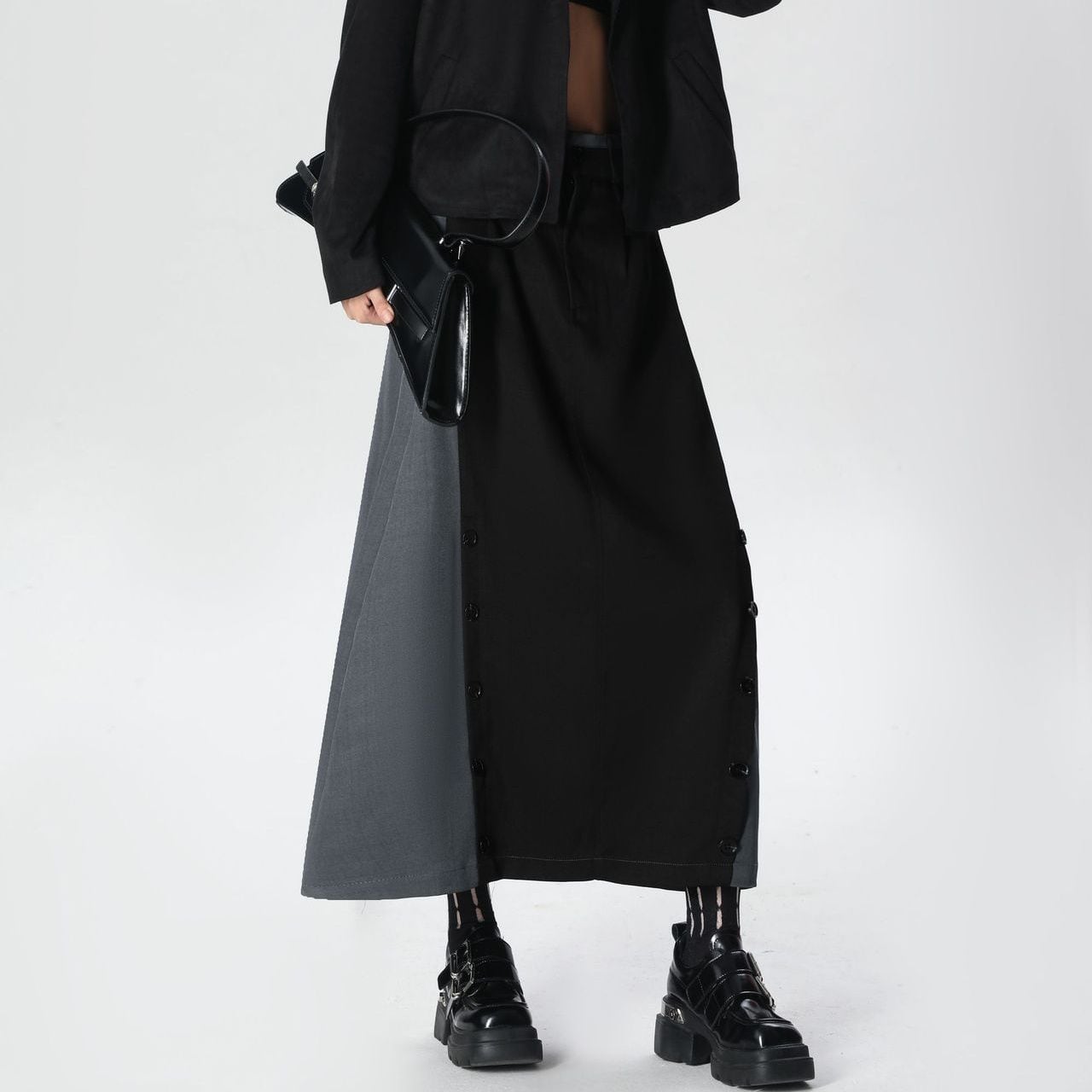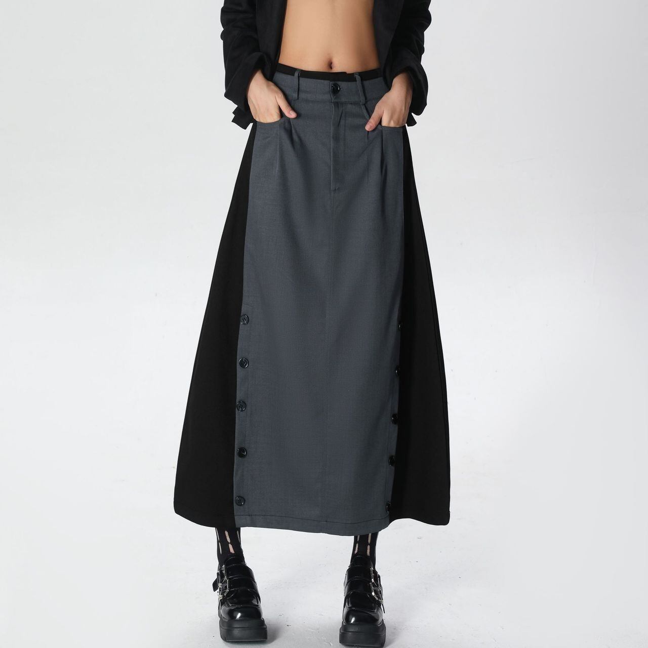 ブラックとグレーのコントラストスティッチがお洒落な、ロング丈のデザインスカートです。スリム目なAラインのシルエットがクールな、都会的な雰囲気のアイテムです。色は2色から選べます。