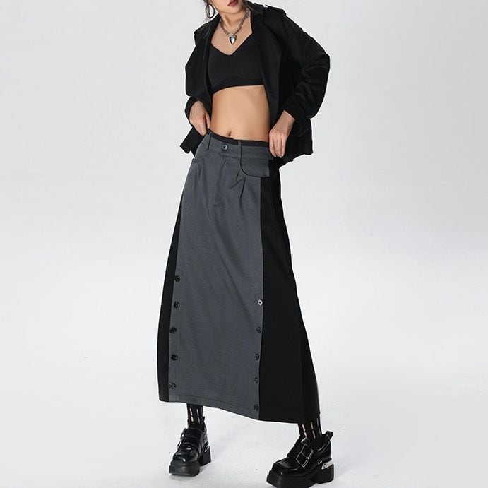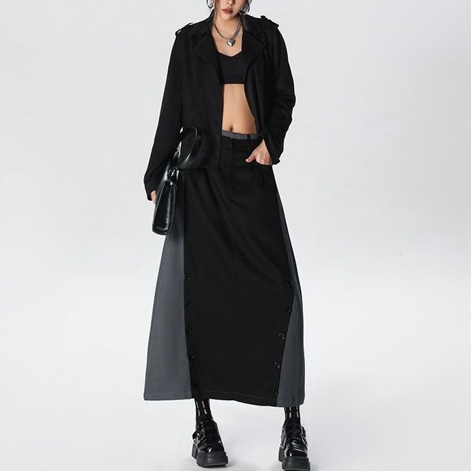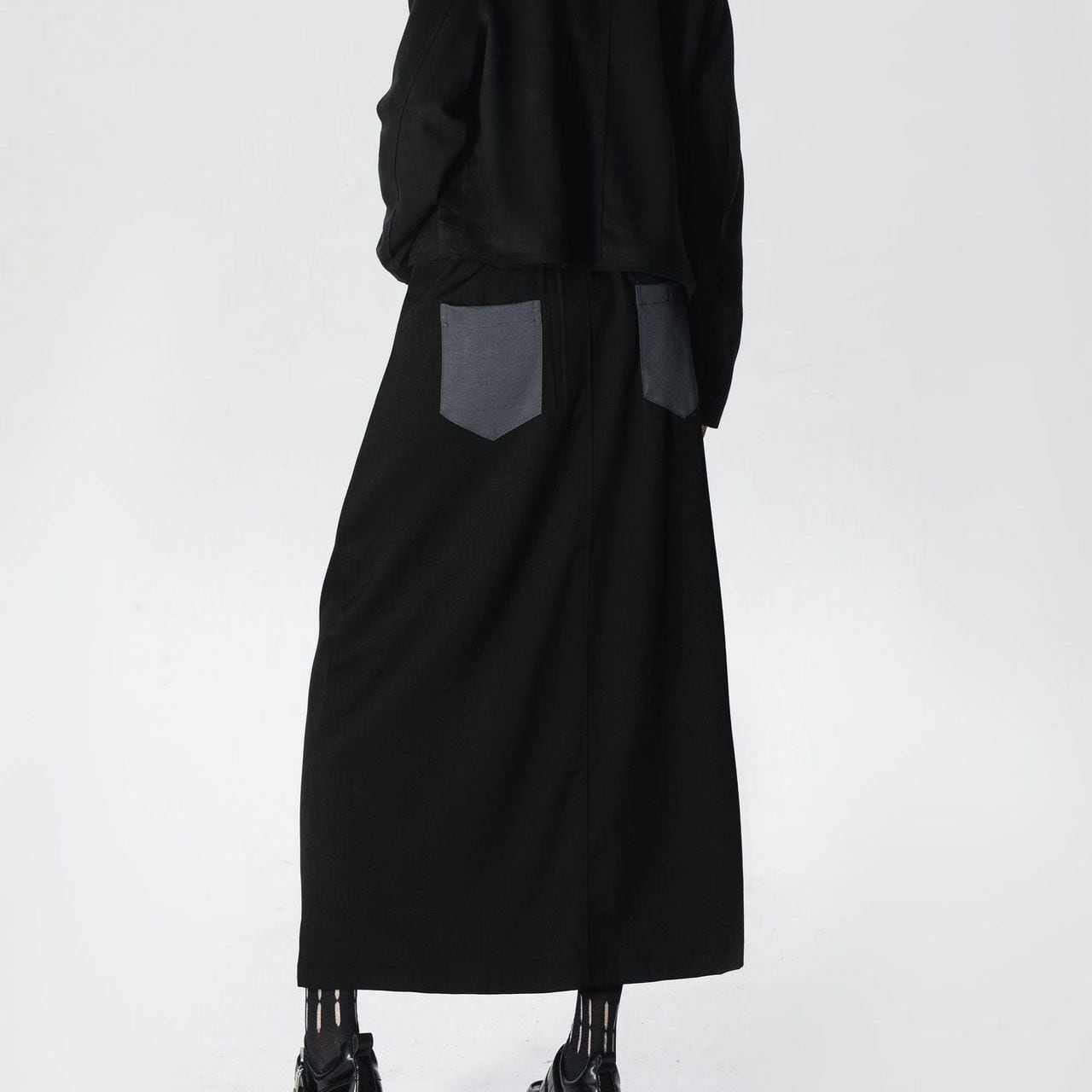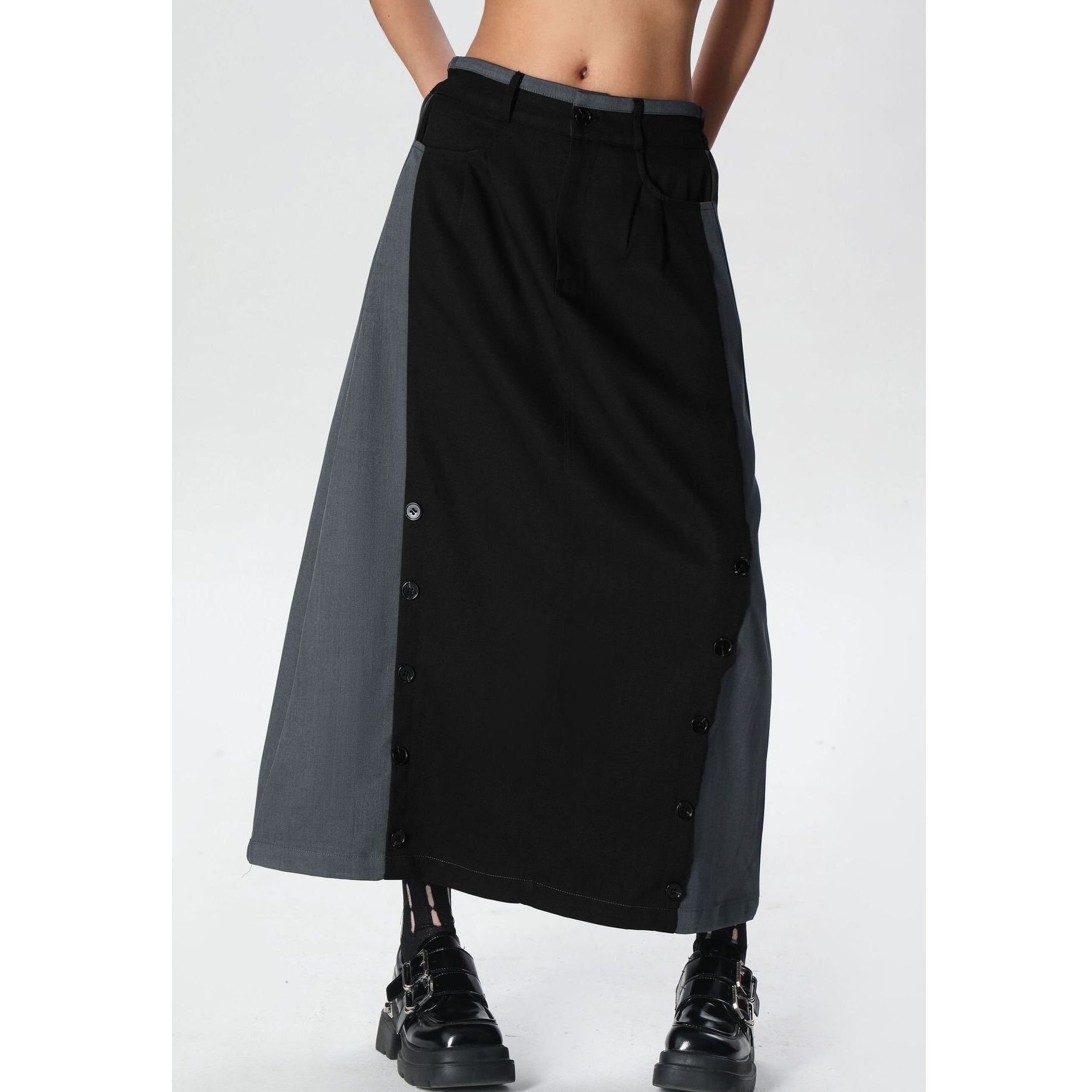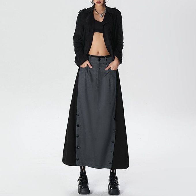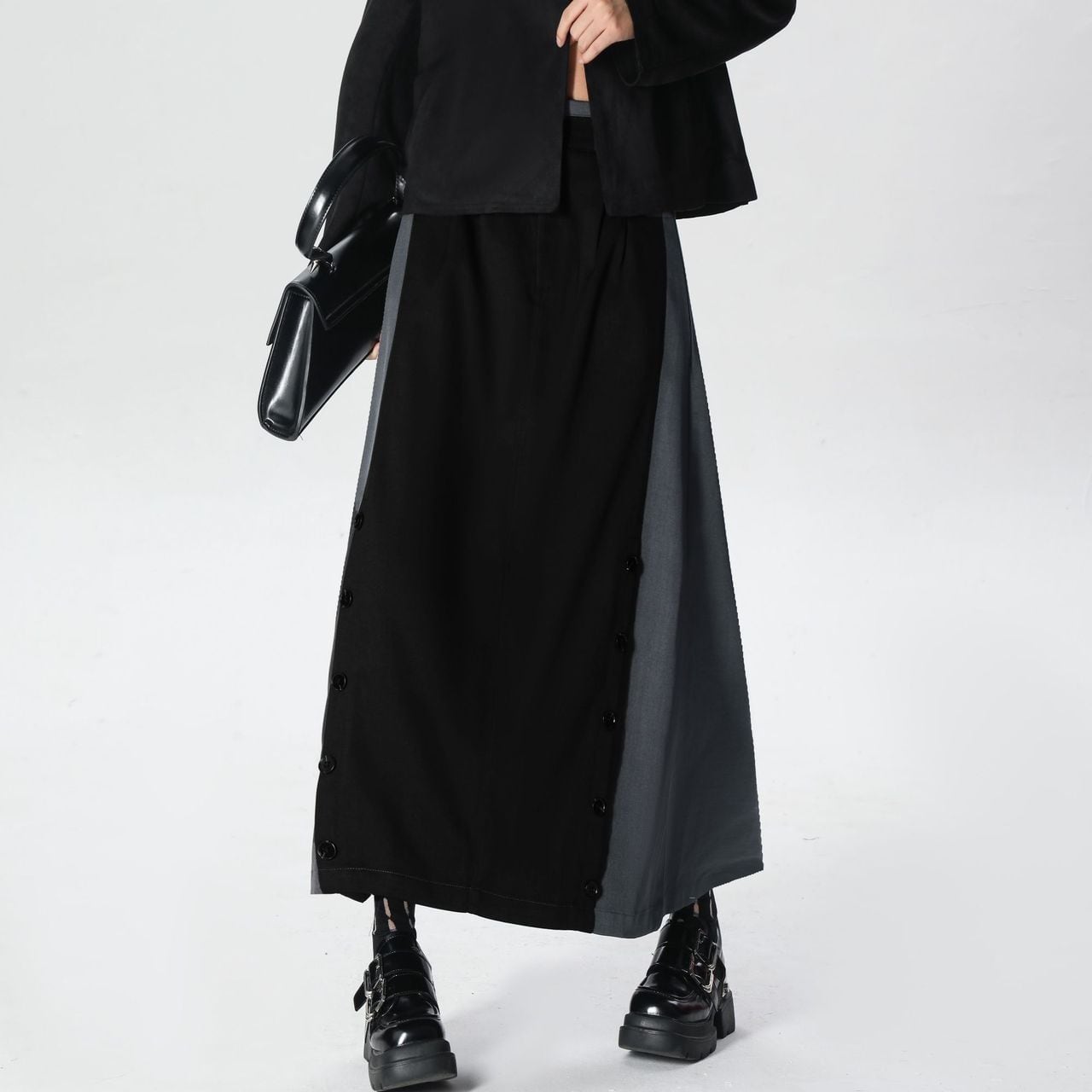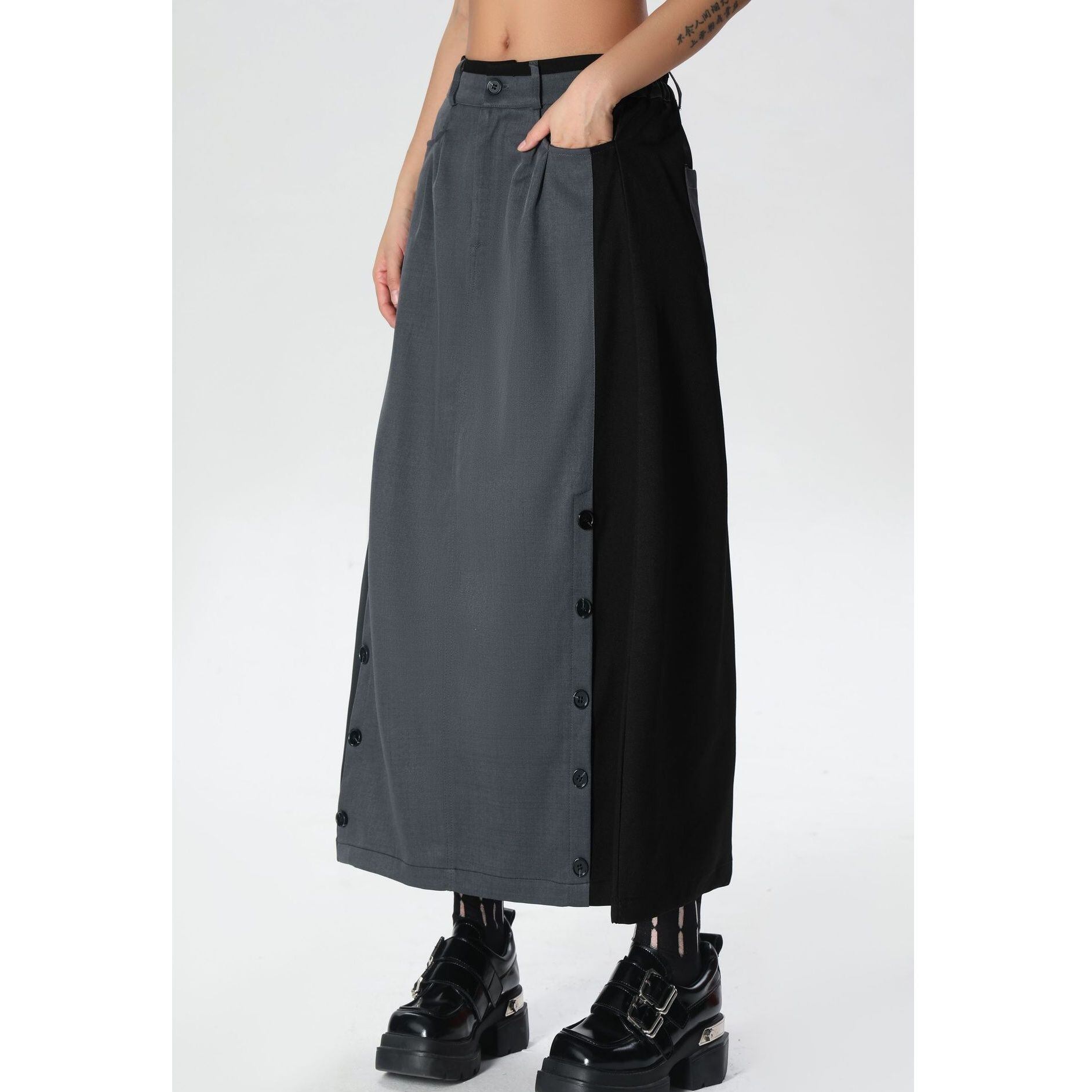 ブラックとグレーのコントラストスティッチがお洒落な、ロング丈のデザインスカートです。スリム目なAラインのシルエットがクールな、都会的な雰囲気のアイテムです。色は2色から選べます。