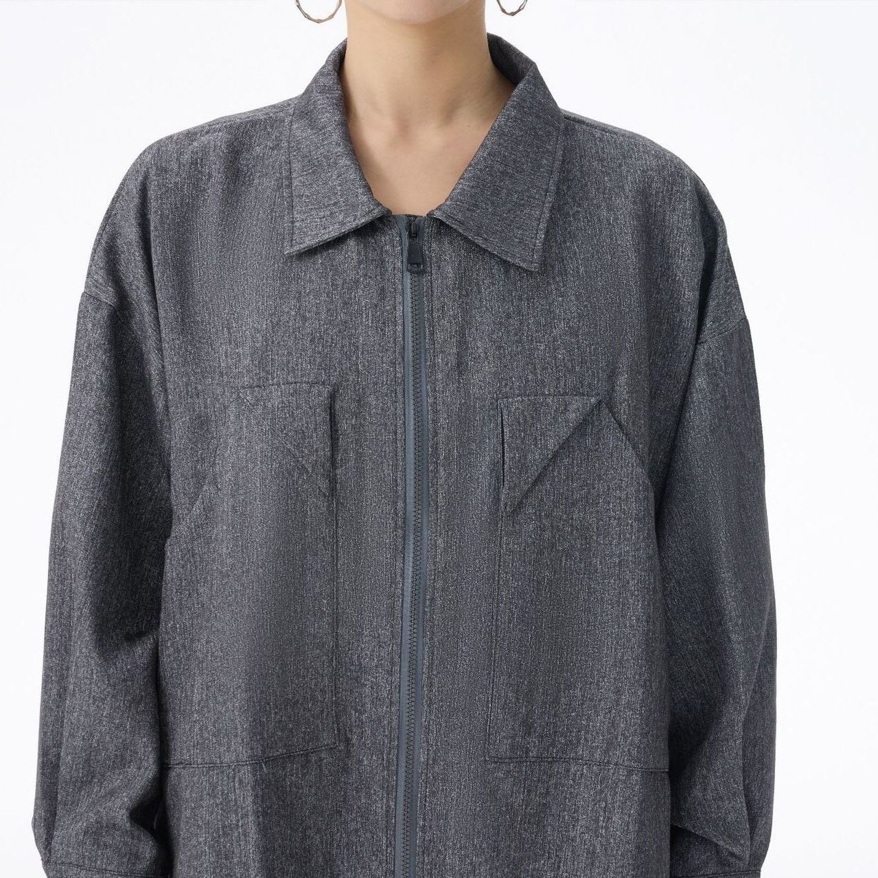 大きなデザインポケットが特徴的な、ポロ襟・長袖・ミドル丈のフルジップ・ウインドブレーカーコートです。ゆったりとしたシルエットとクラシカルなグレーで合わせやすい、シンプルでクールな印象のアイテムです。