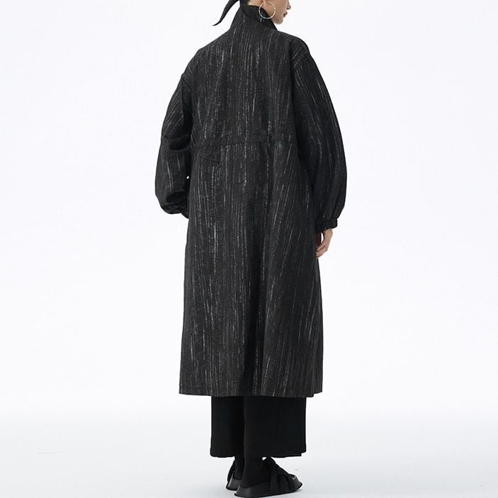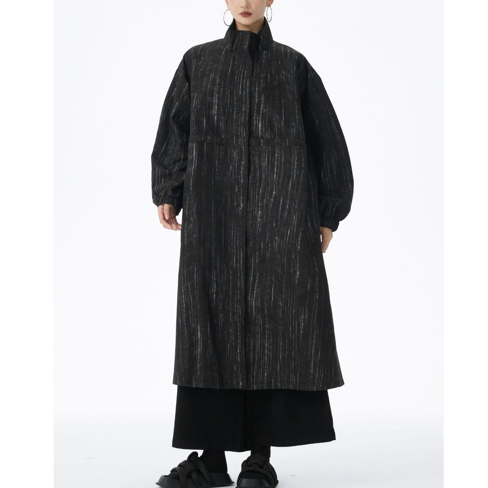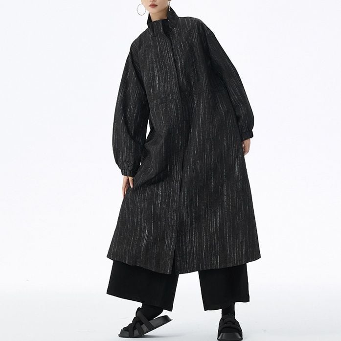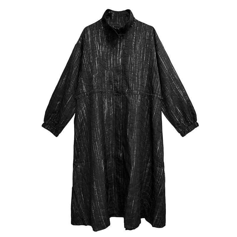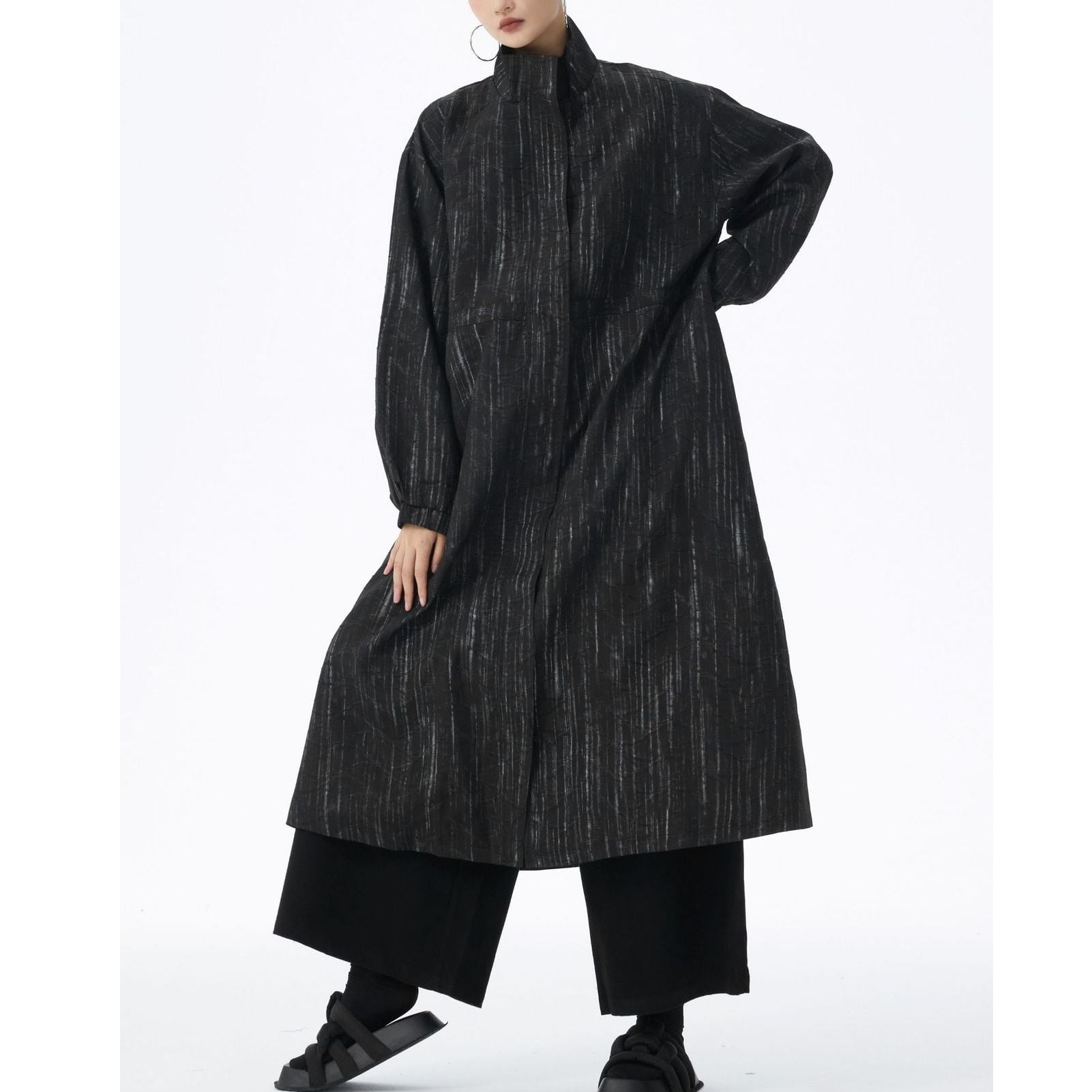 ブラック地の雨のようなストライプがお洒落な、スタンドカラー・長袖・ミドル丈のフルジップ・ウインドブレーカーコートです。ウエストは両サイドにドローコードが付いています。ゆったりとしたシルエットがボディラインをカバーする、クールな印象のアイテムです。