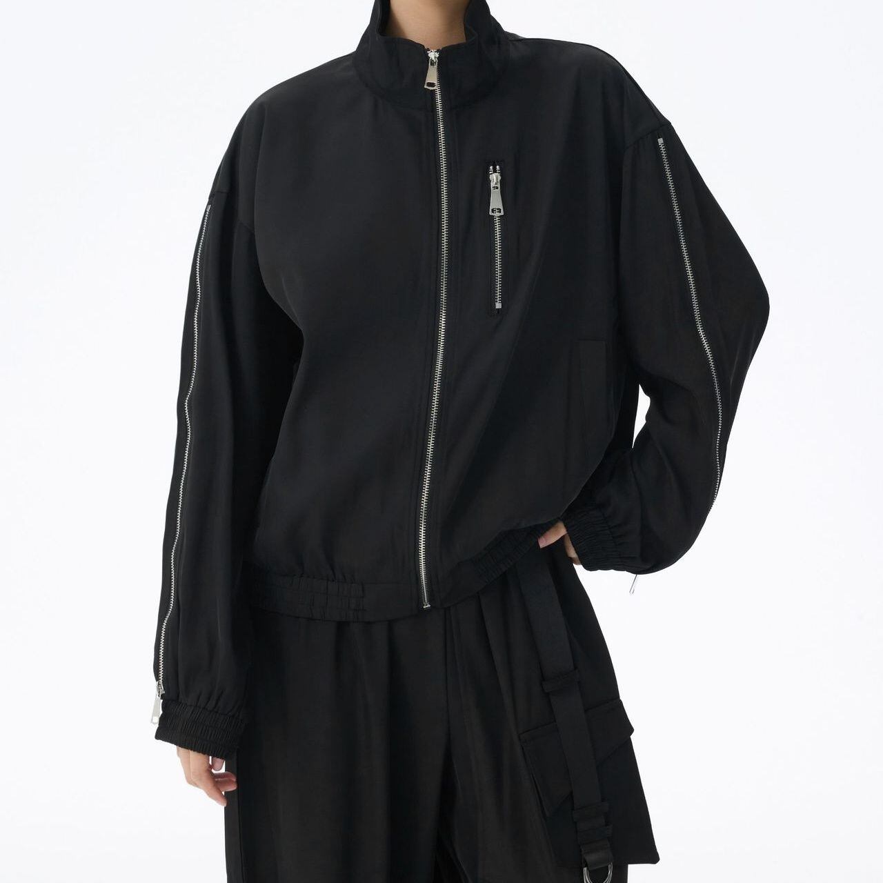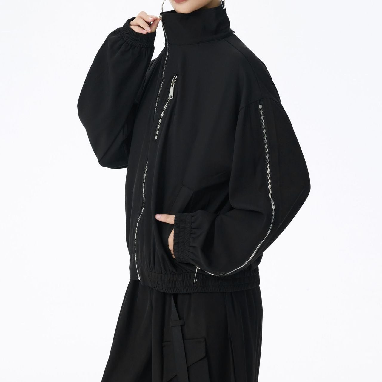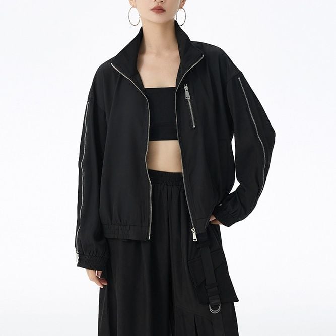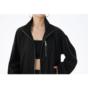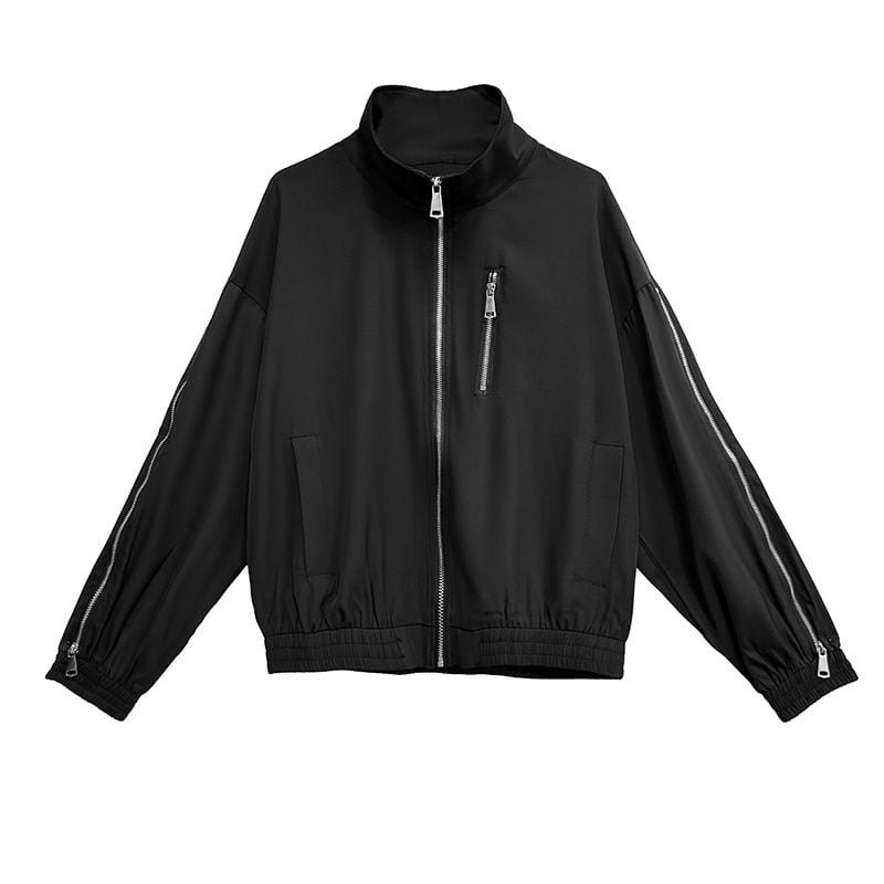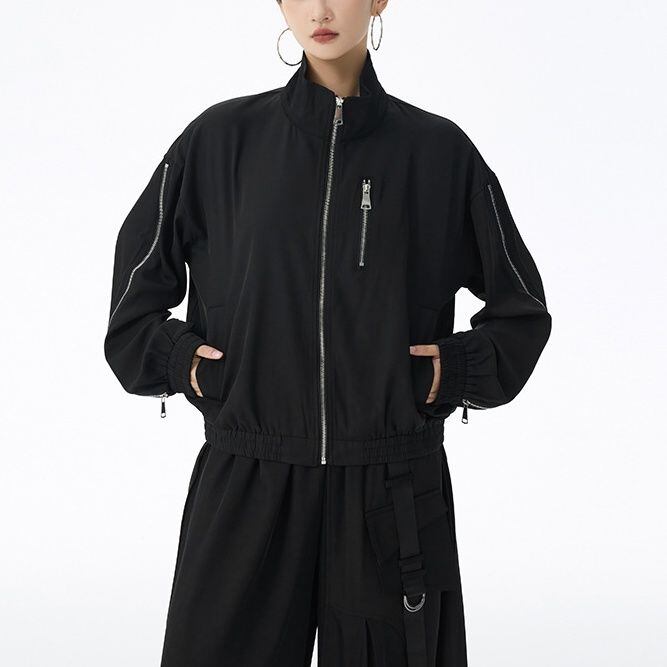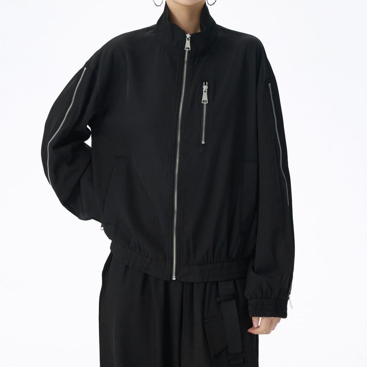 ブラックの単色にシルバーのジップライン飾りがクールな、スタンドカラー・長袖・ショート丈のフルジップジャケットです。袖口と裾にゴムが入った、スポーティで合わせやすいカジュアルアイテムです。