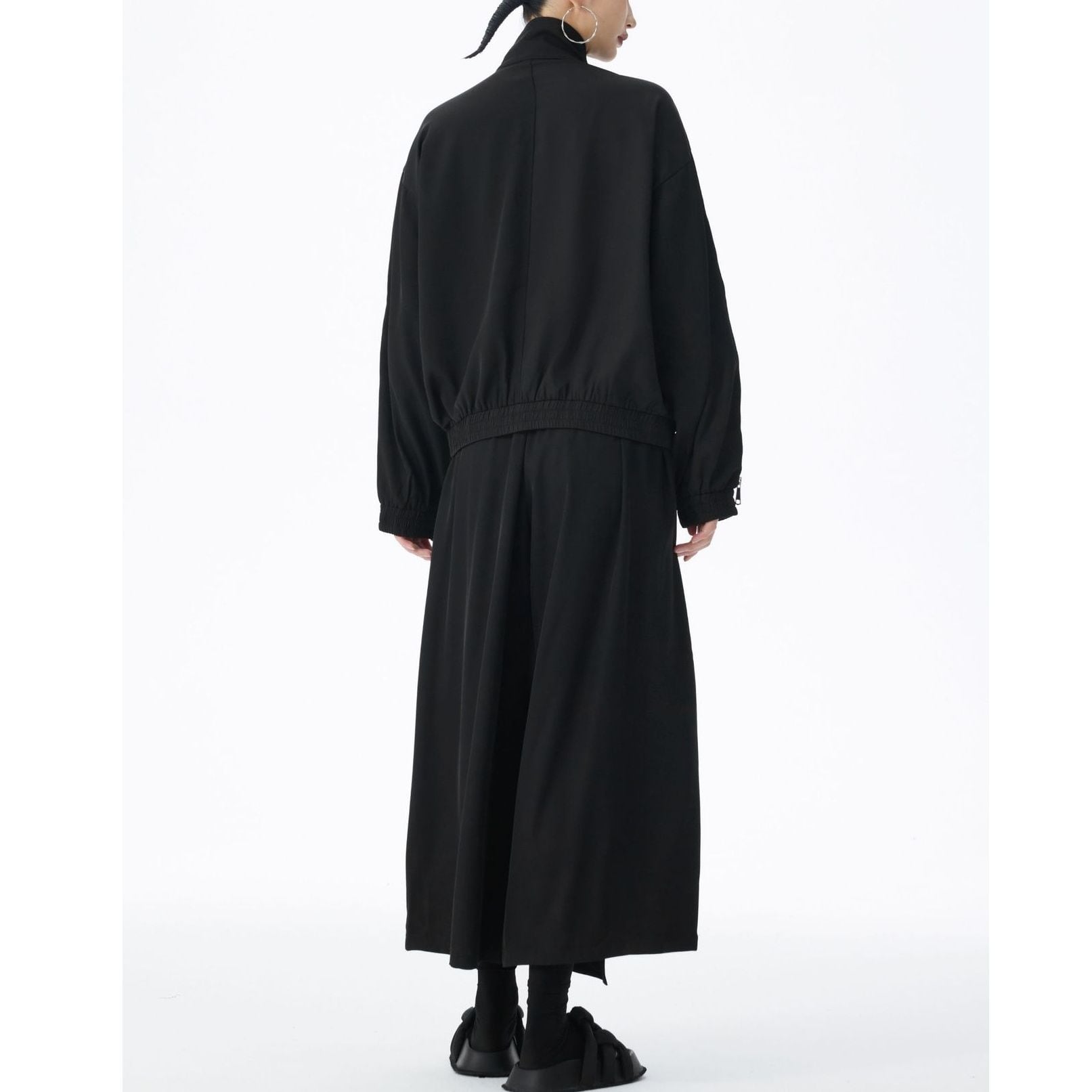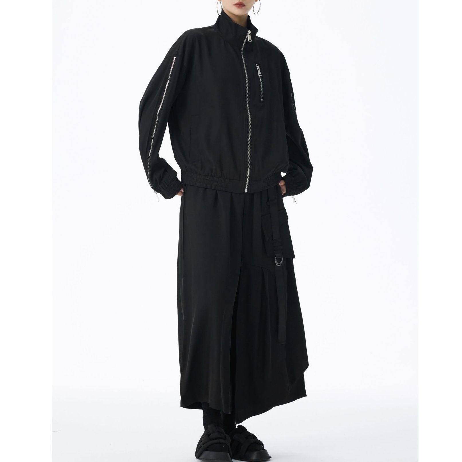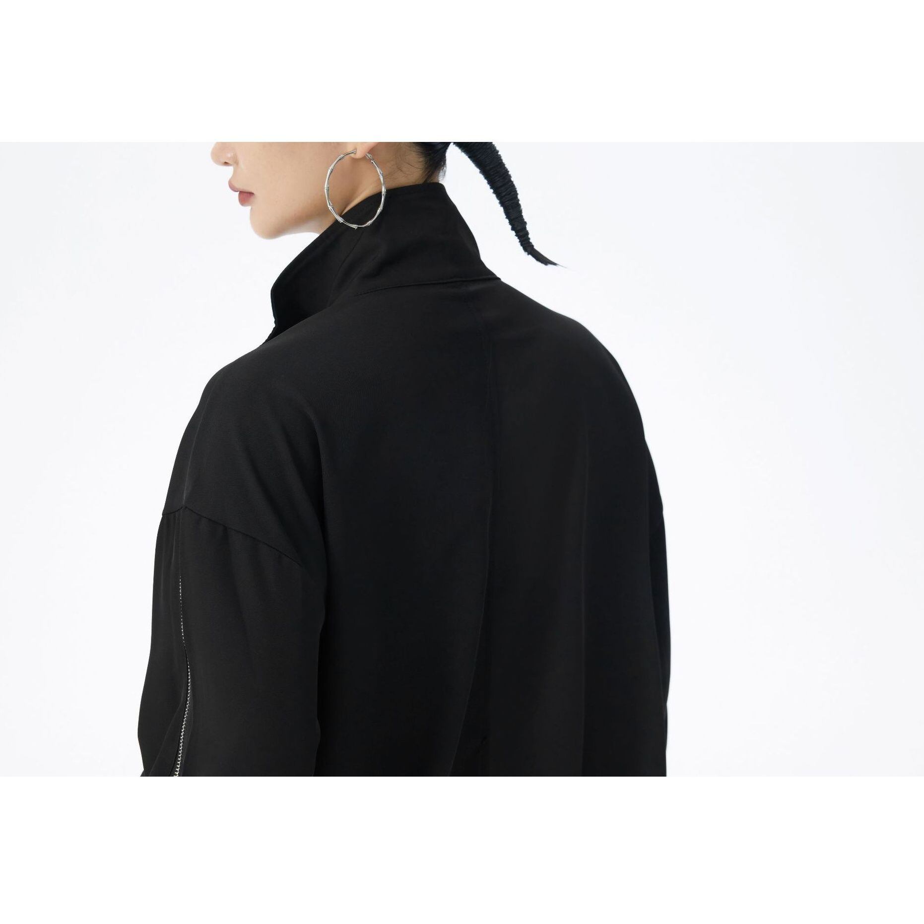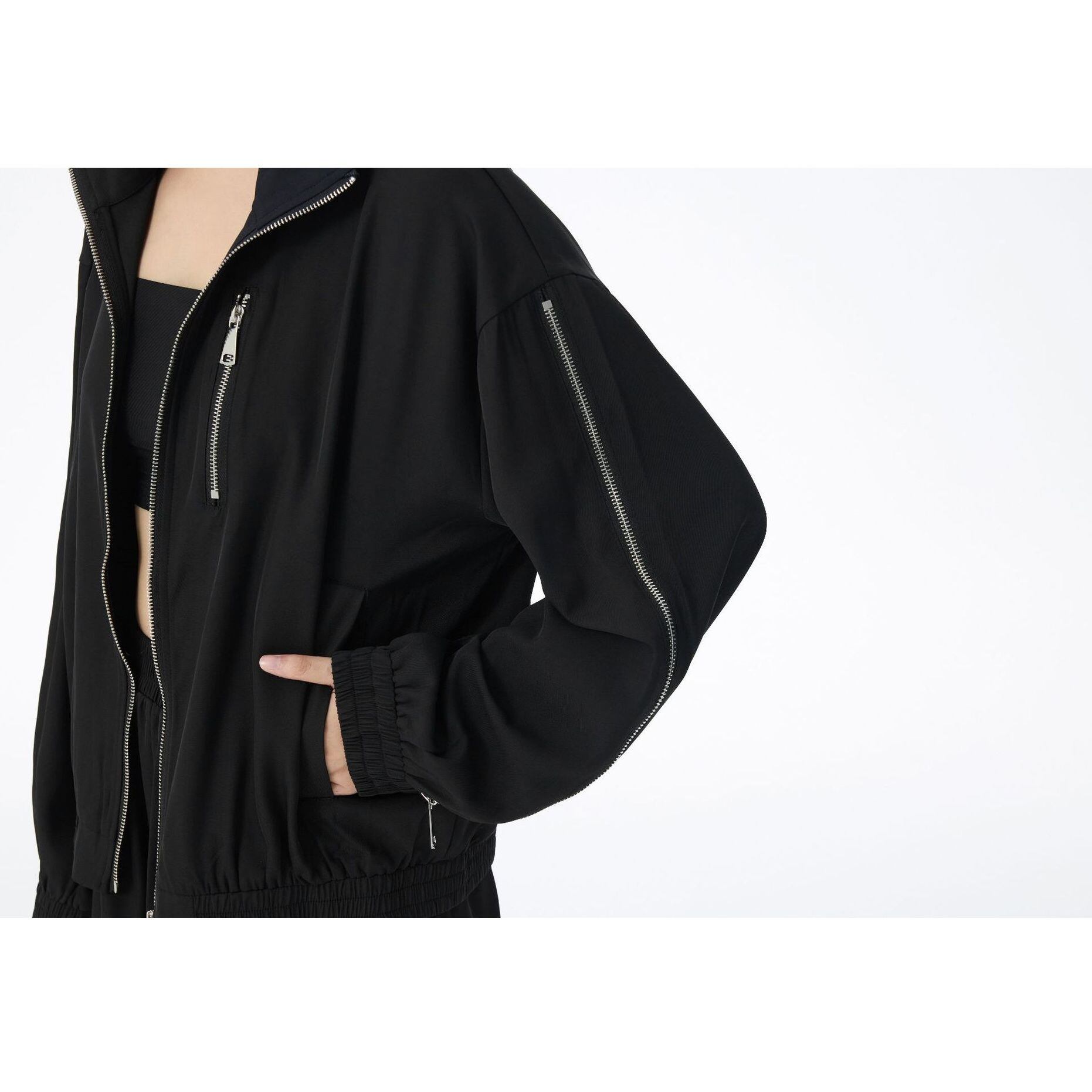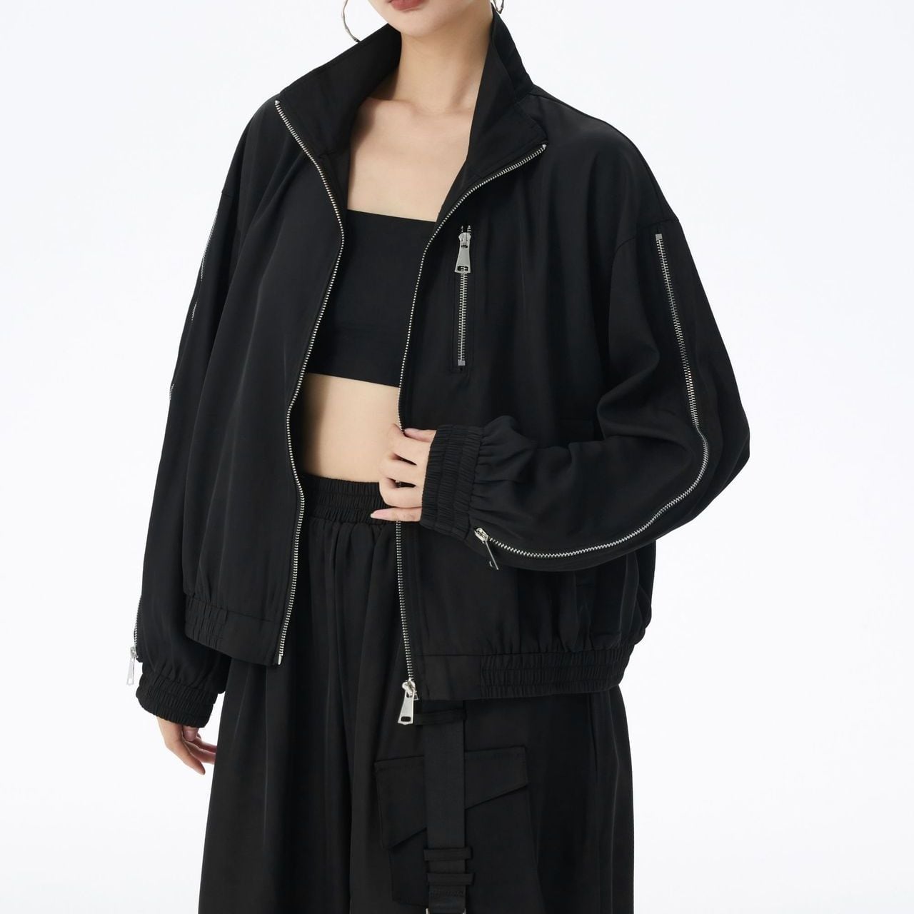 ブラックの単色にシルバーのジップライン飾りがクールな、スタンドカラー・長袖・ショート丈のフルジップジャケットです。袖口と裾にゴムが入った、スポーティで合わせやすいカジュアルアイテムです。