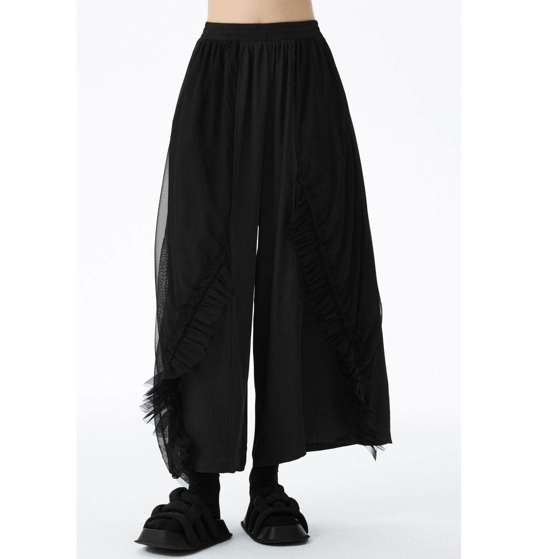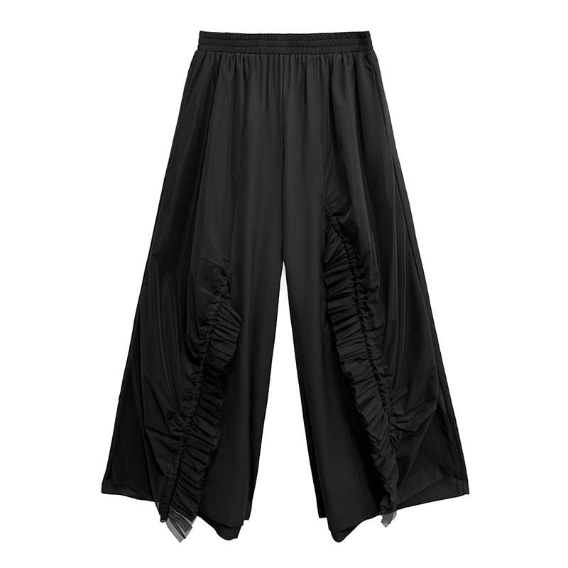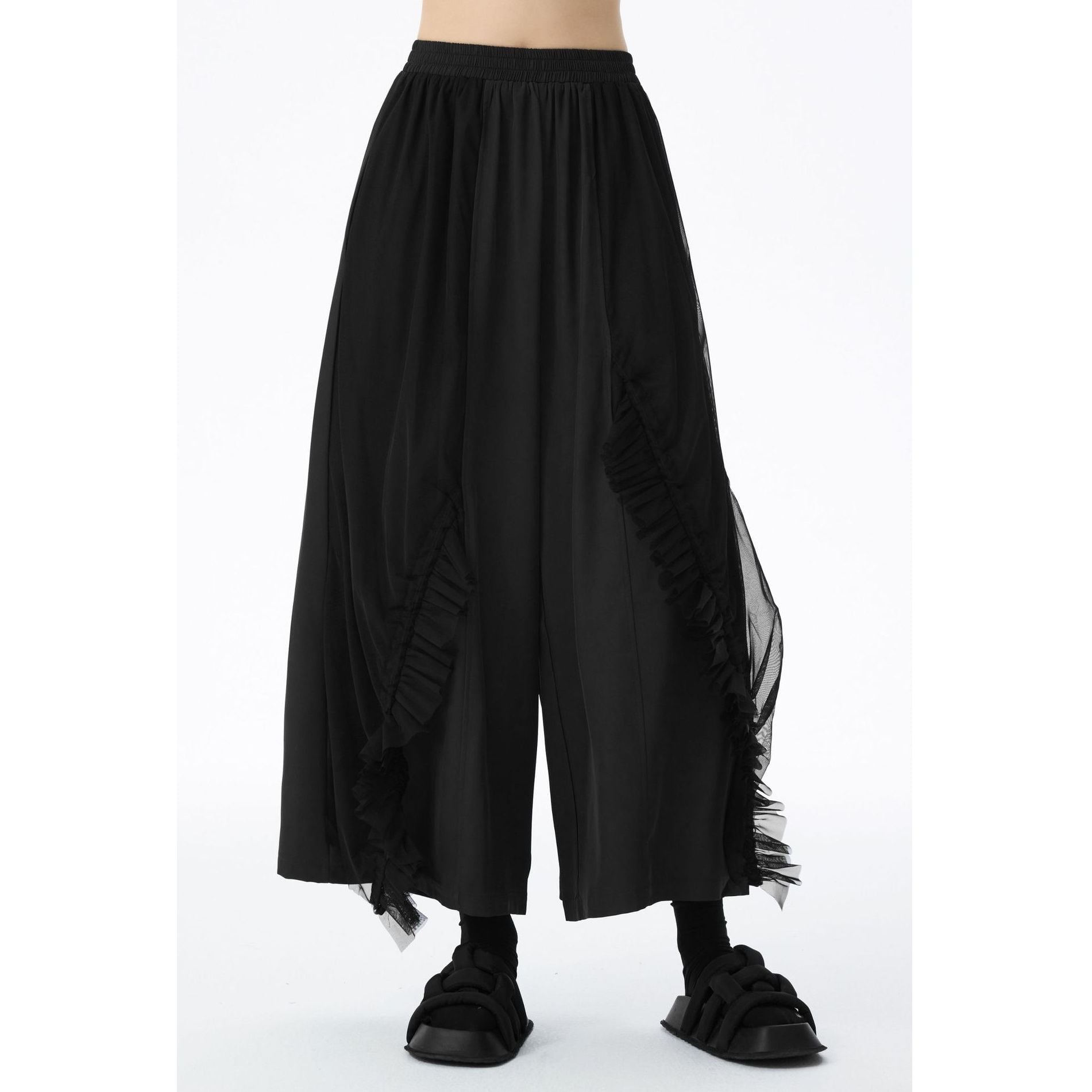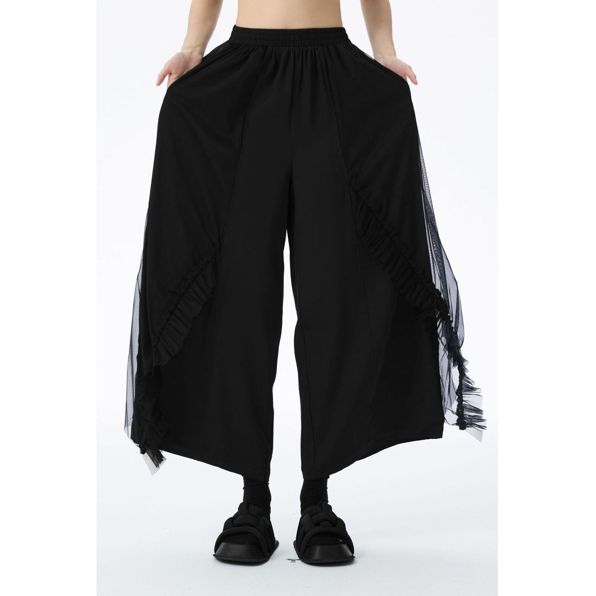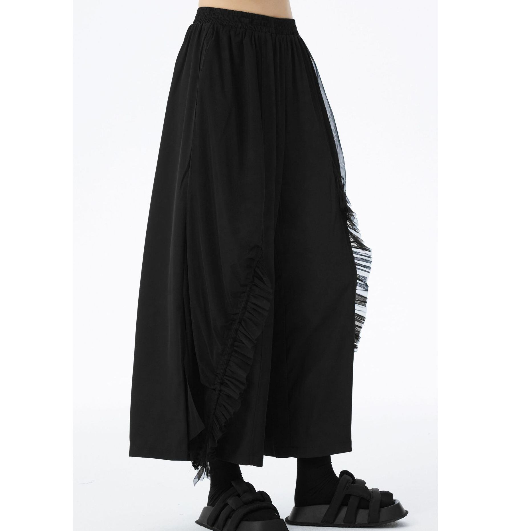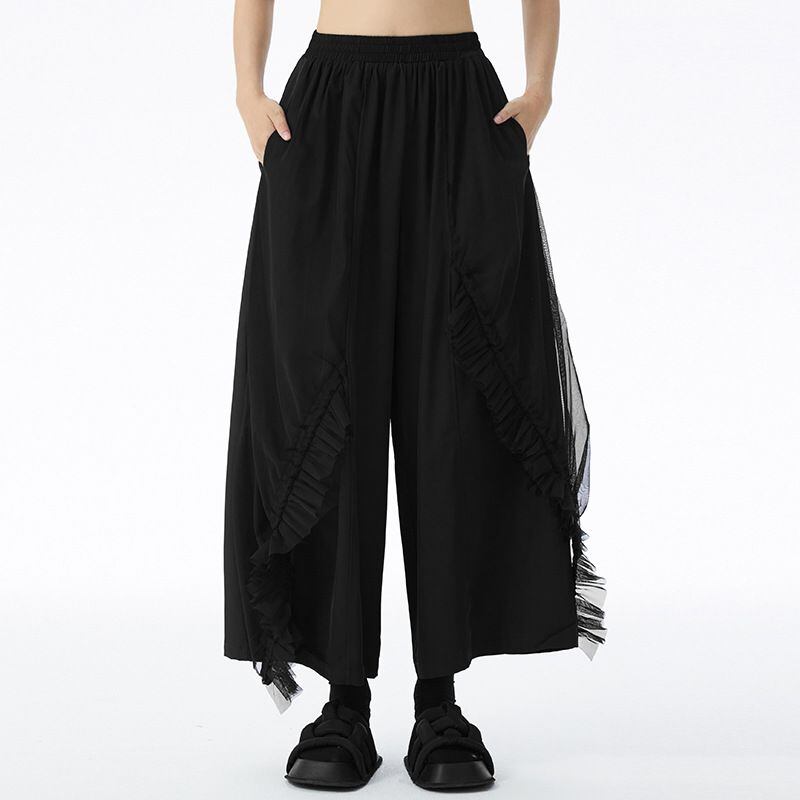 フリルリボンのついたメッシュ素材のレイヤースティッチがお洒落な、ワイドレッグ・クロップドパンツです。ウエストはゴムなので、着脱が簡単で履き心地が良いです。ブラックの単色でコーディネートしやすい、クールな印象のアイテムです。