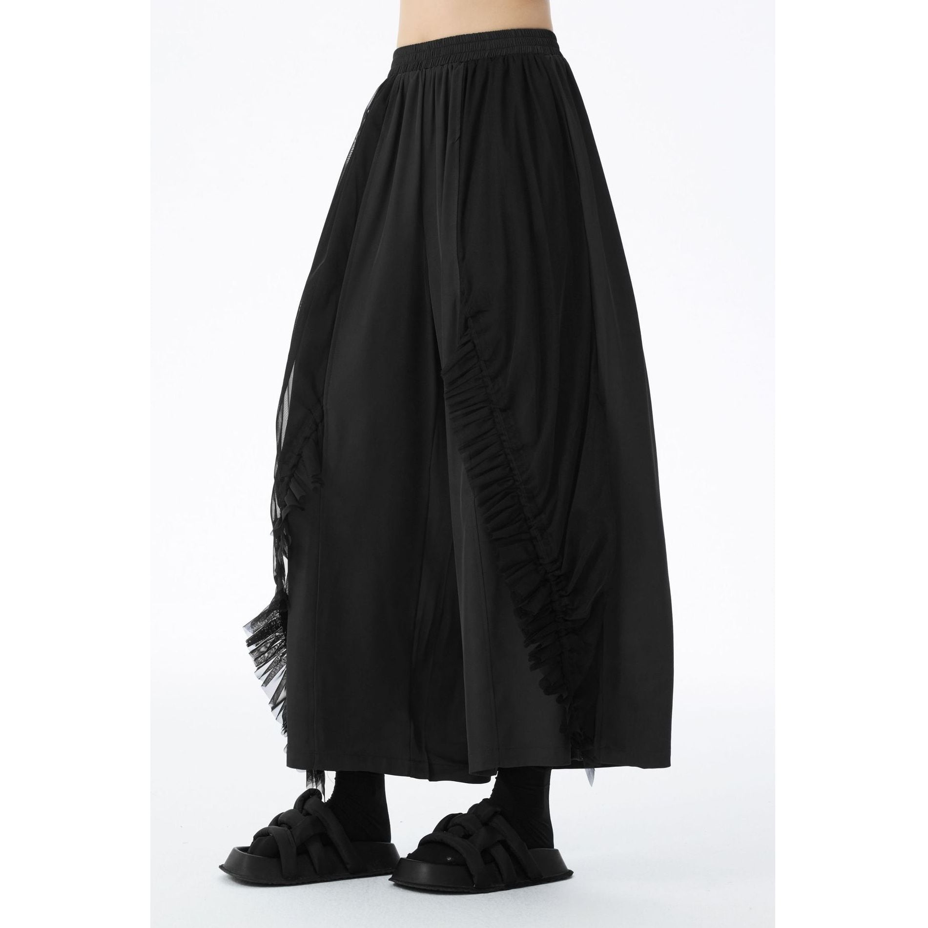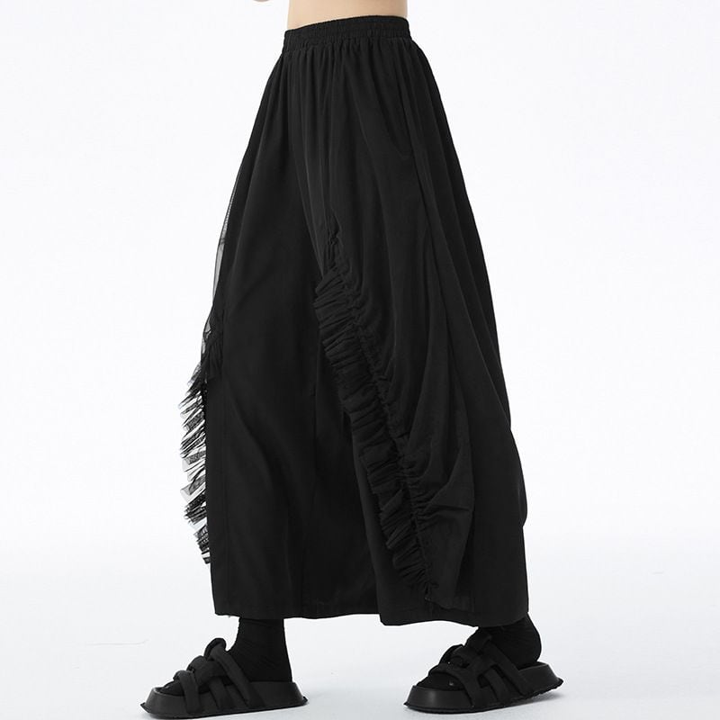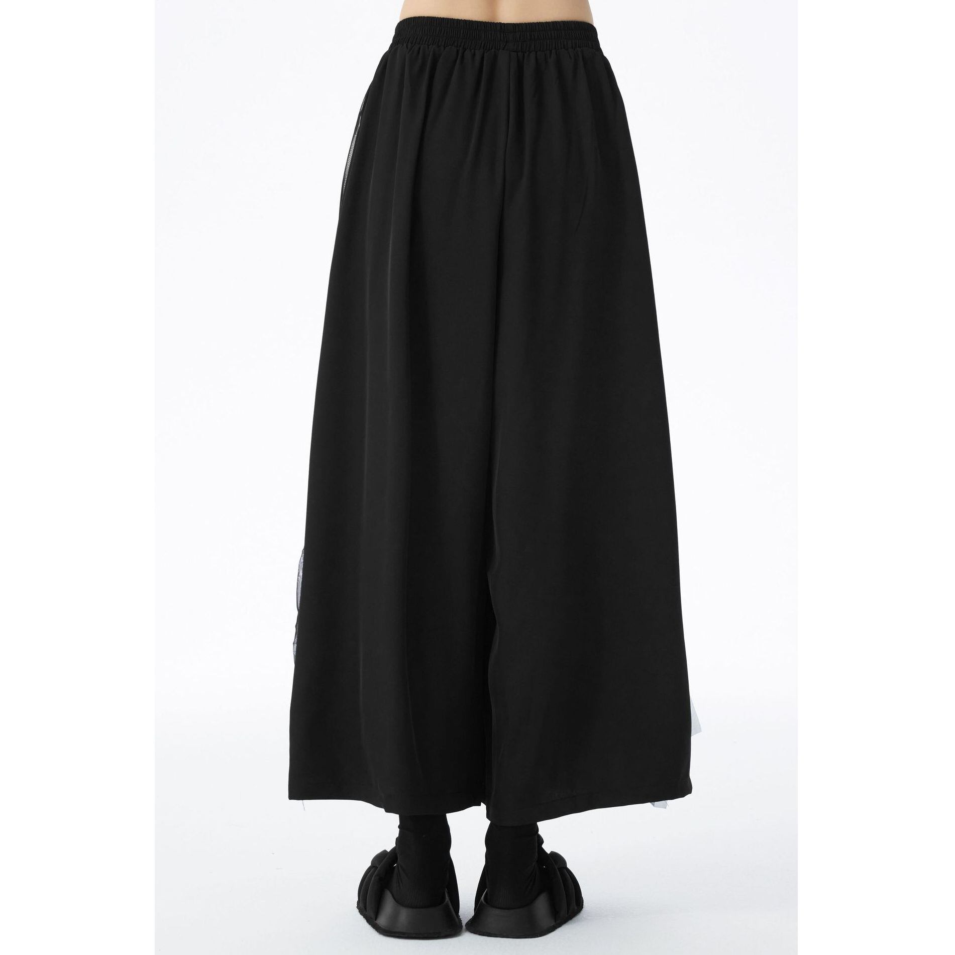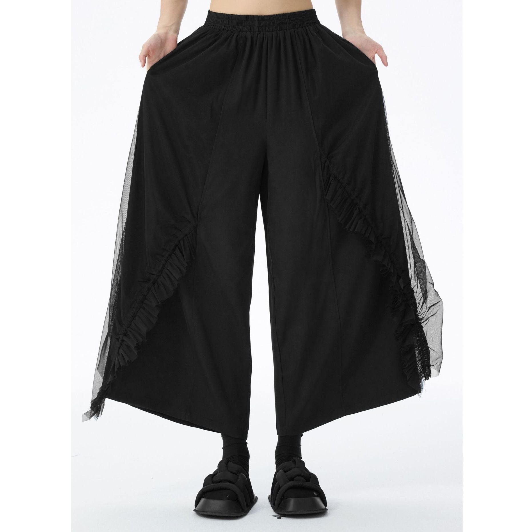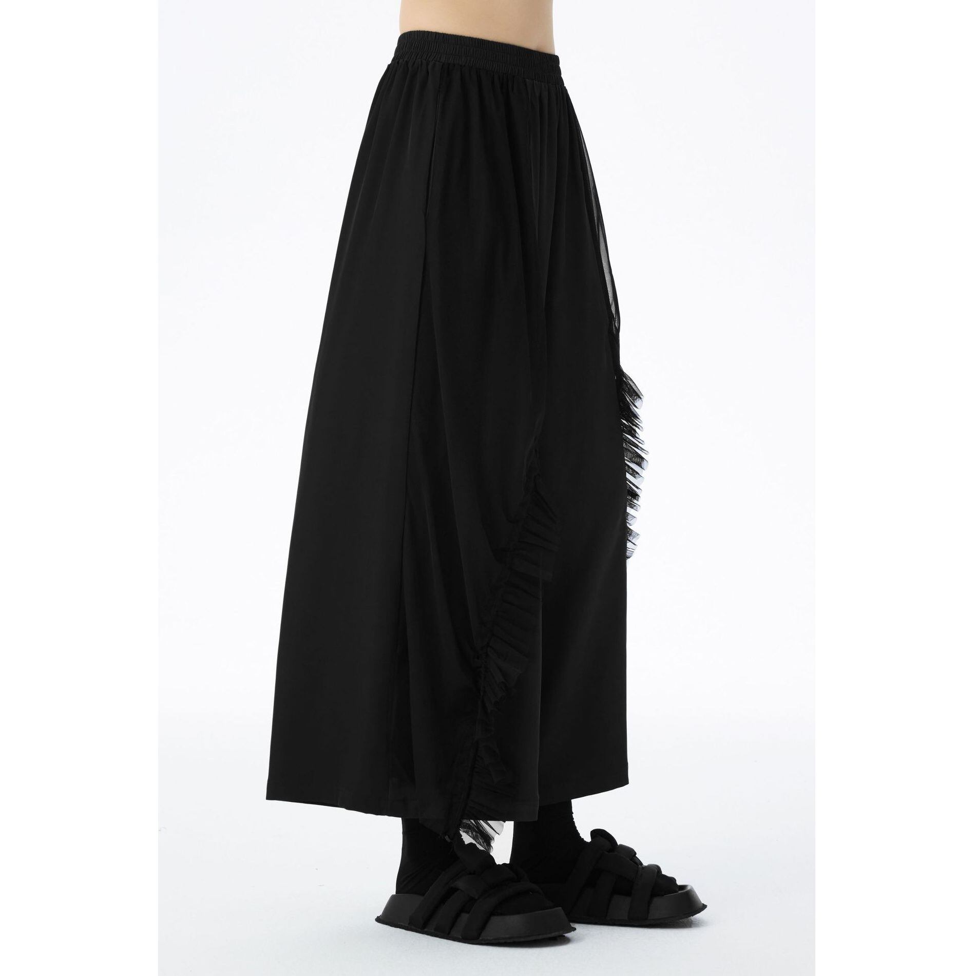 フリルリボンのついたメッシュ素材のレイヤースティッチがお洒落な、ワイドレッグ・クロップドパンツです。ウエストはゴムなので、着脱が簡単で履き心地が良いです。ブラックの単色でコーディネートしやすい、クールな印象のアイテムです。