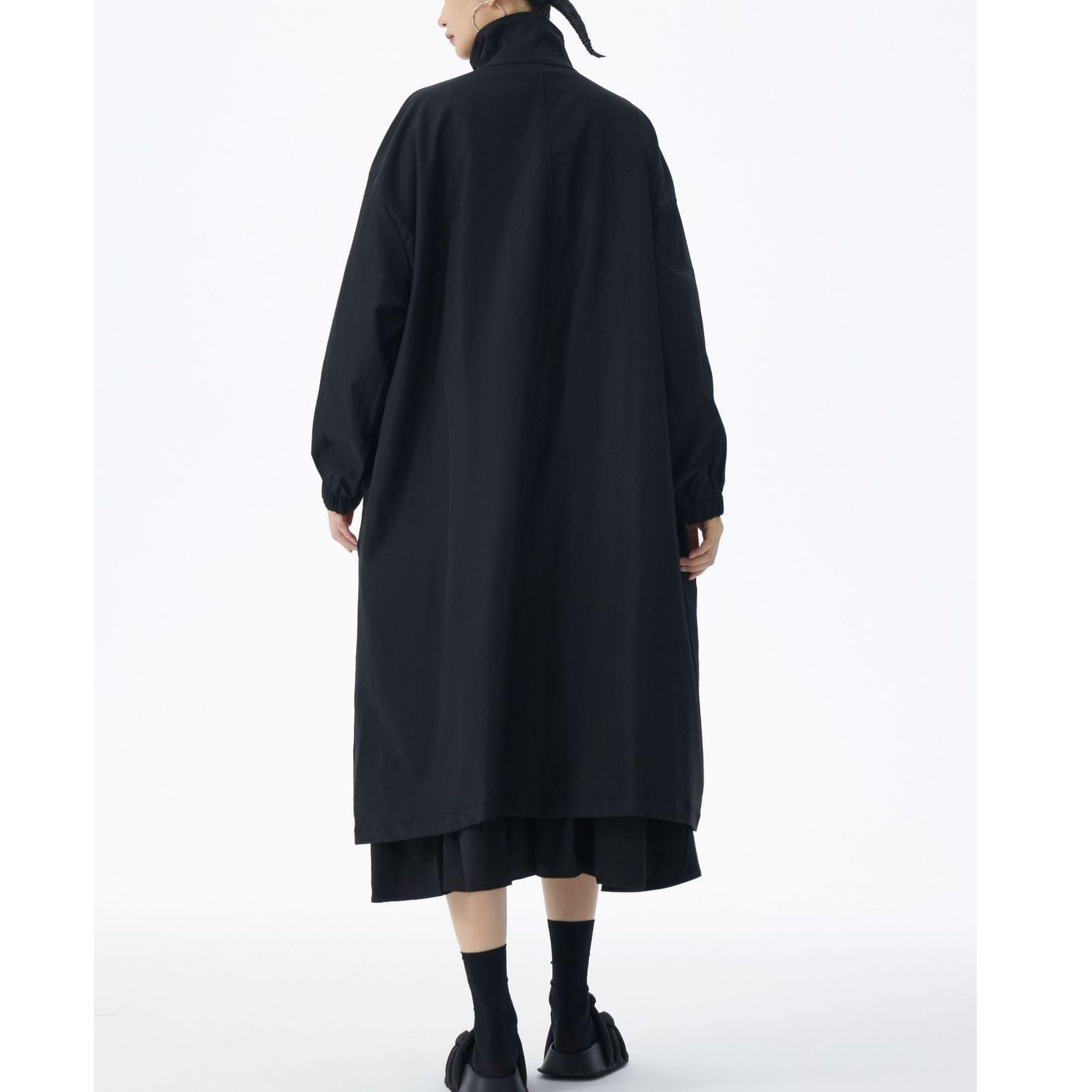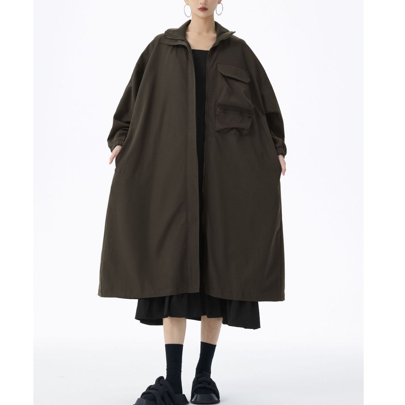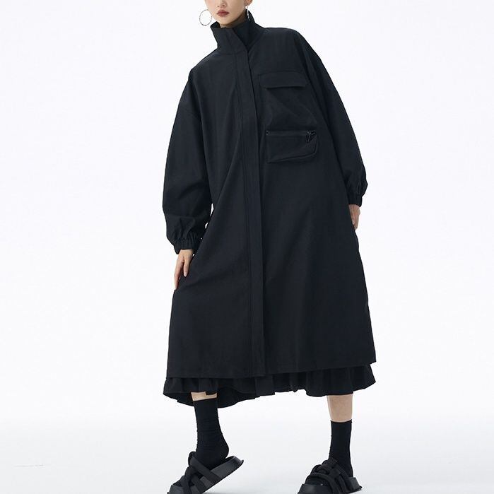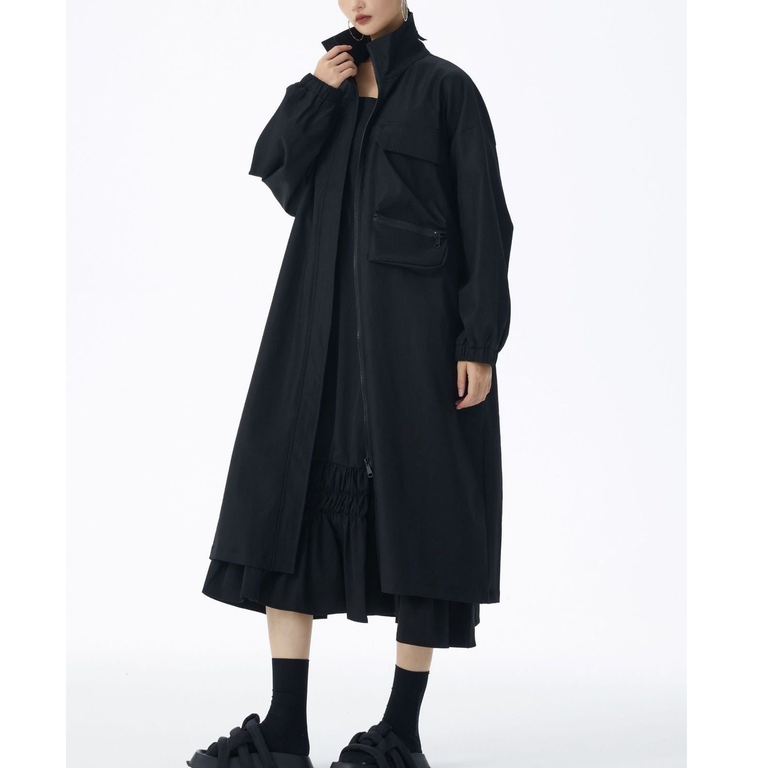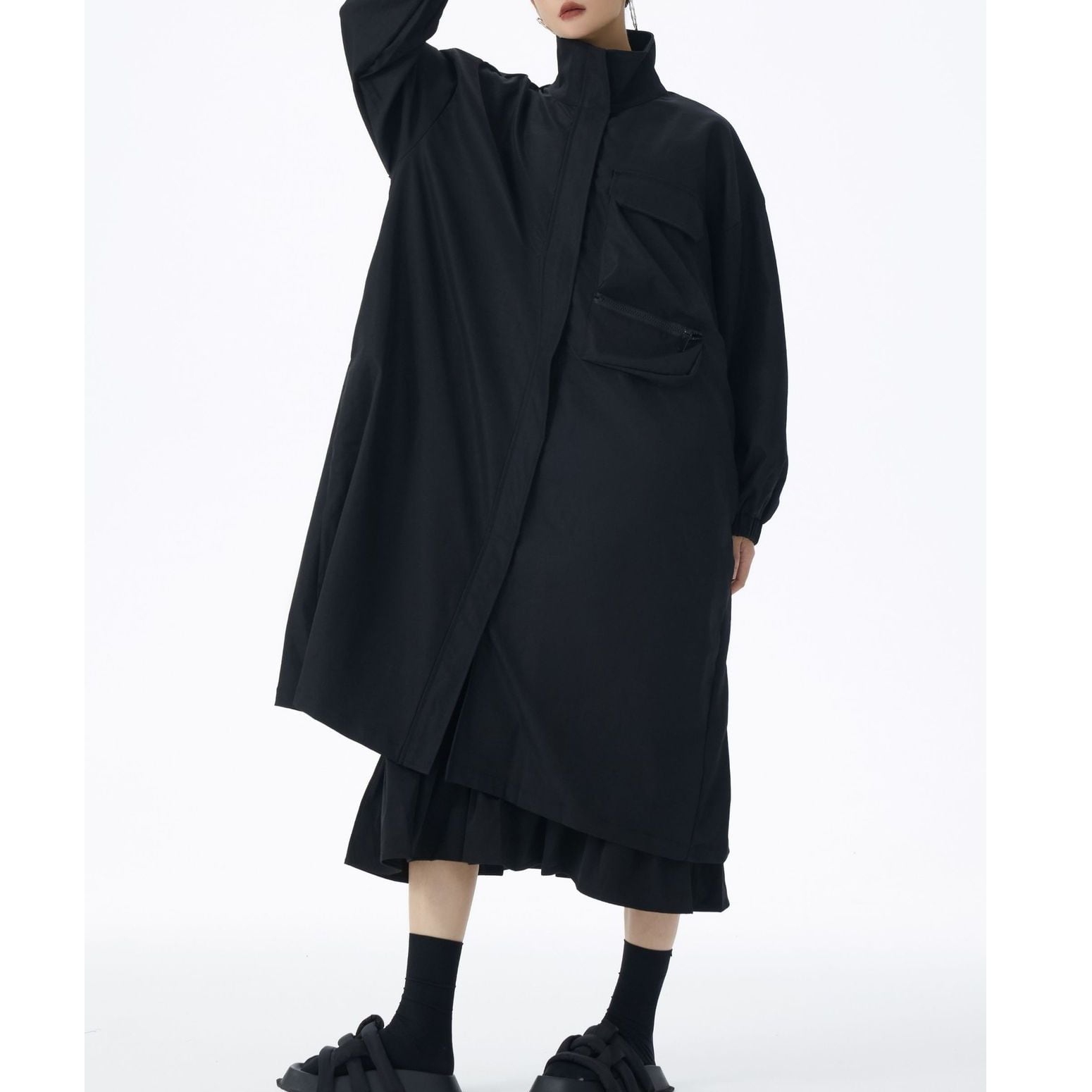 左胸の大きなデザインポケットがアクセントになった、スタンドカラー・長袖・ミドル丈のウインドブレーカーコートです。袖口にゴムの入ったフルジップデザインで、シンプルなシルエットが使いやすいカジュアルなアイテムです。2色から選べます。
