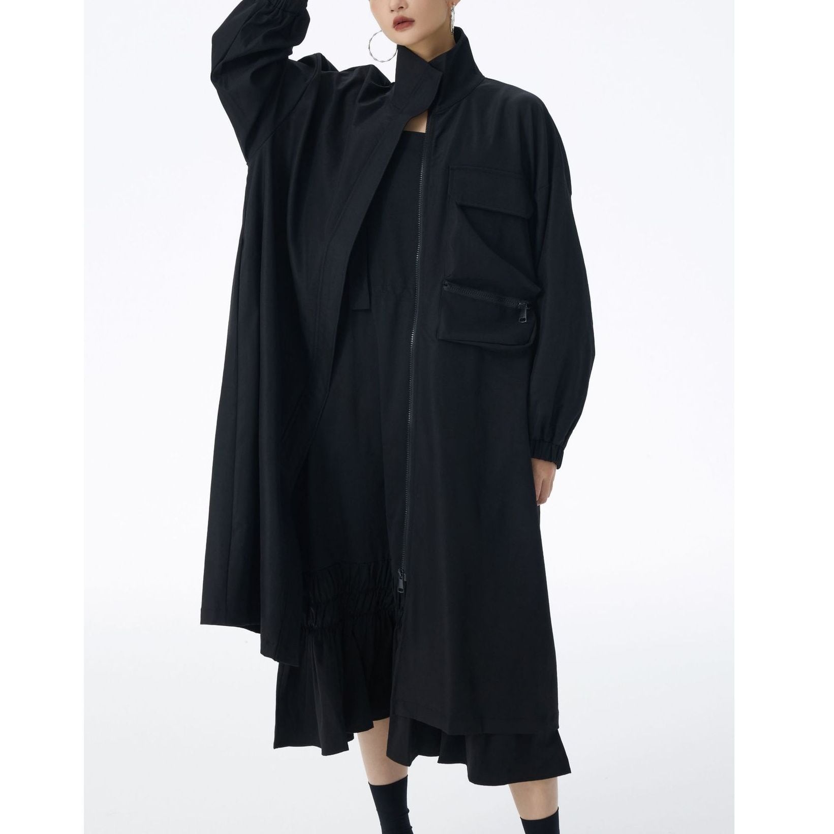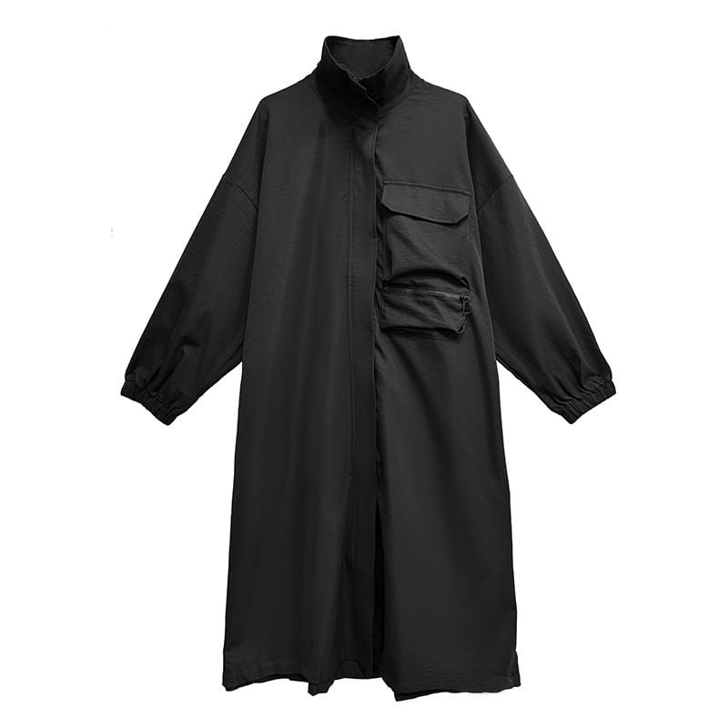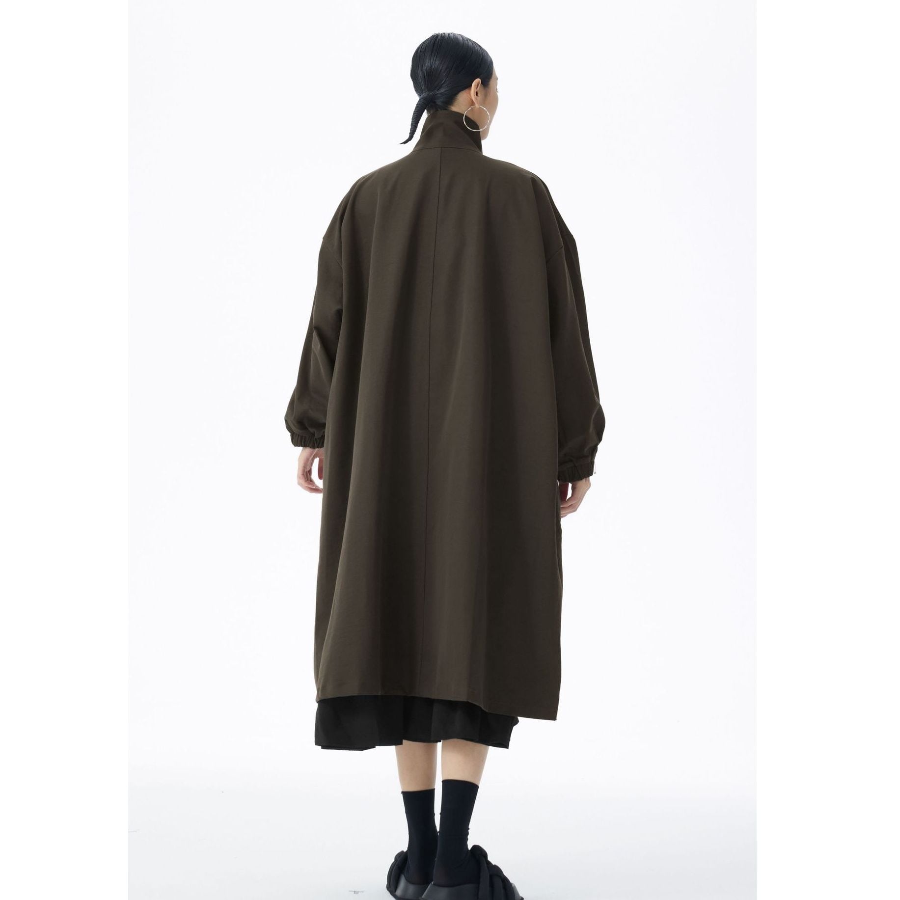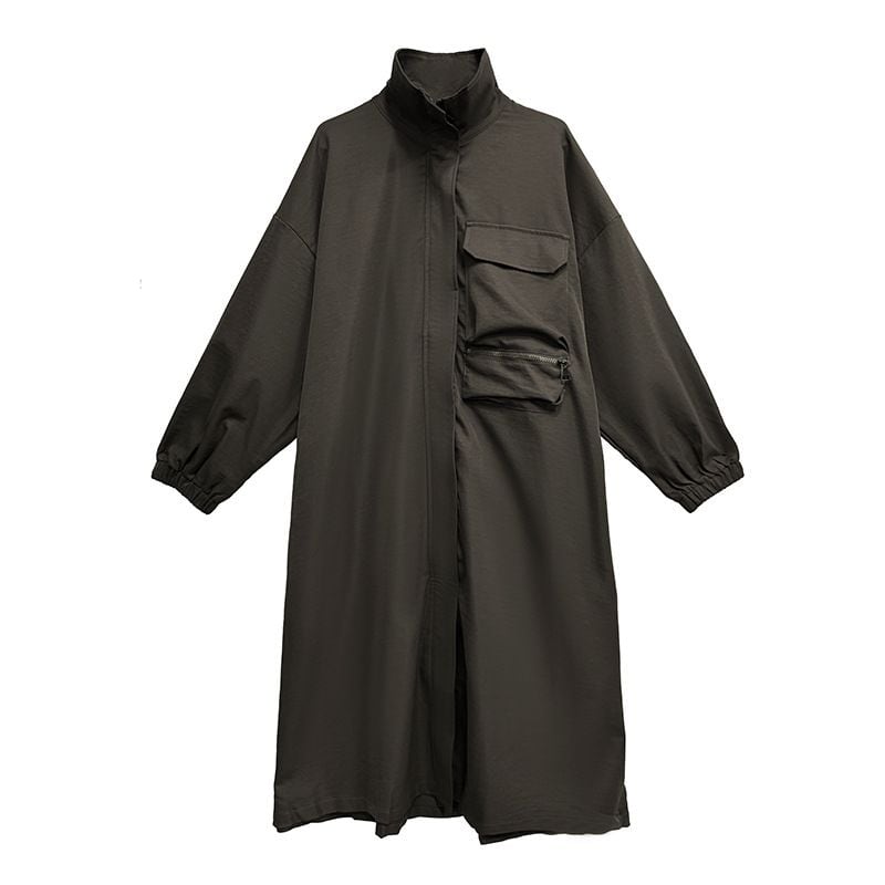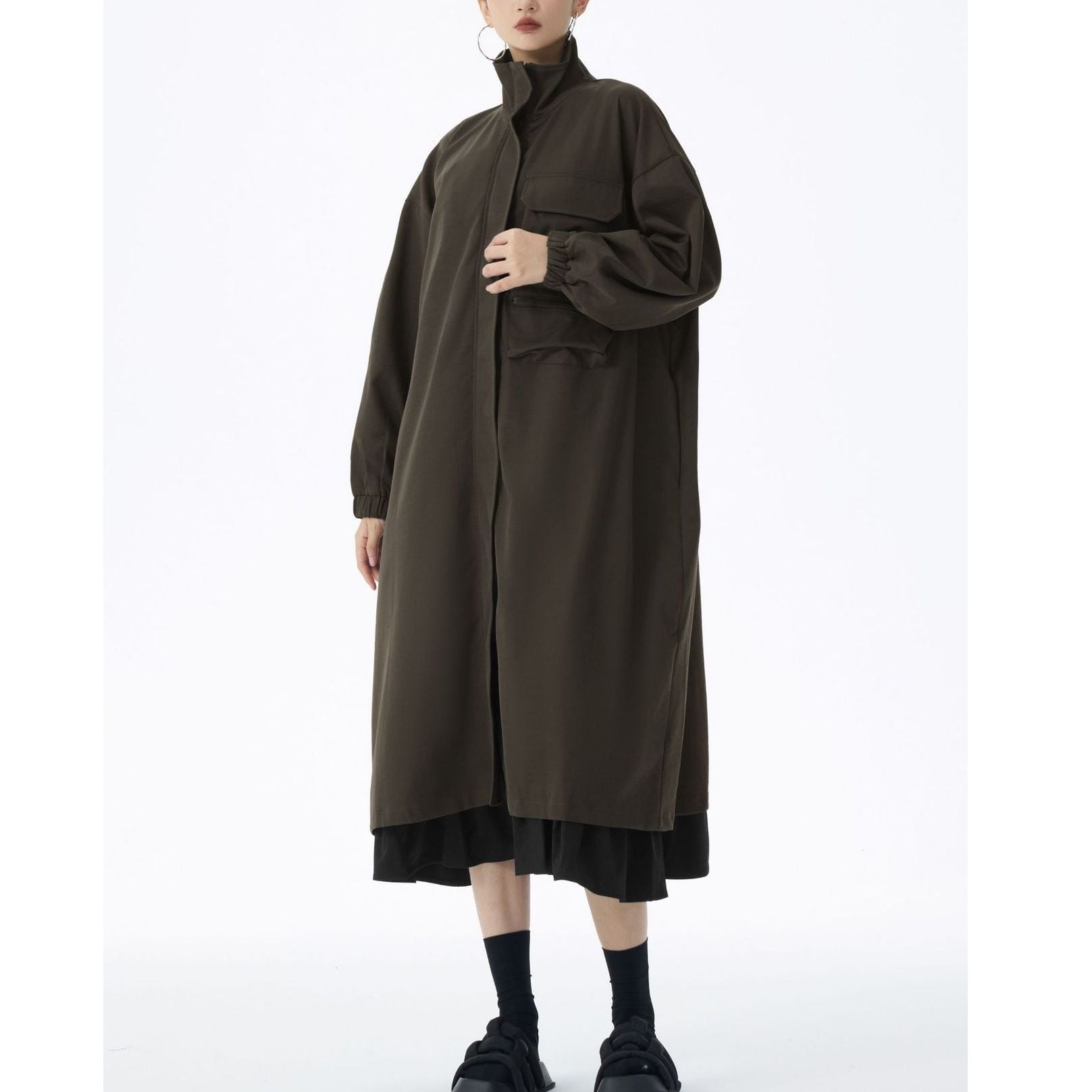 左胸の大きなデザインポケットがアクセントになった、スタンドカラー・長袖・ミドル丈のウインドブレーカーコートです。袖口にゴムの入ったフルジップデザインで、シンプルなシルエットが使いやすいカジュアルなアイテムです。2色から選べます。