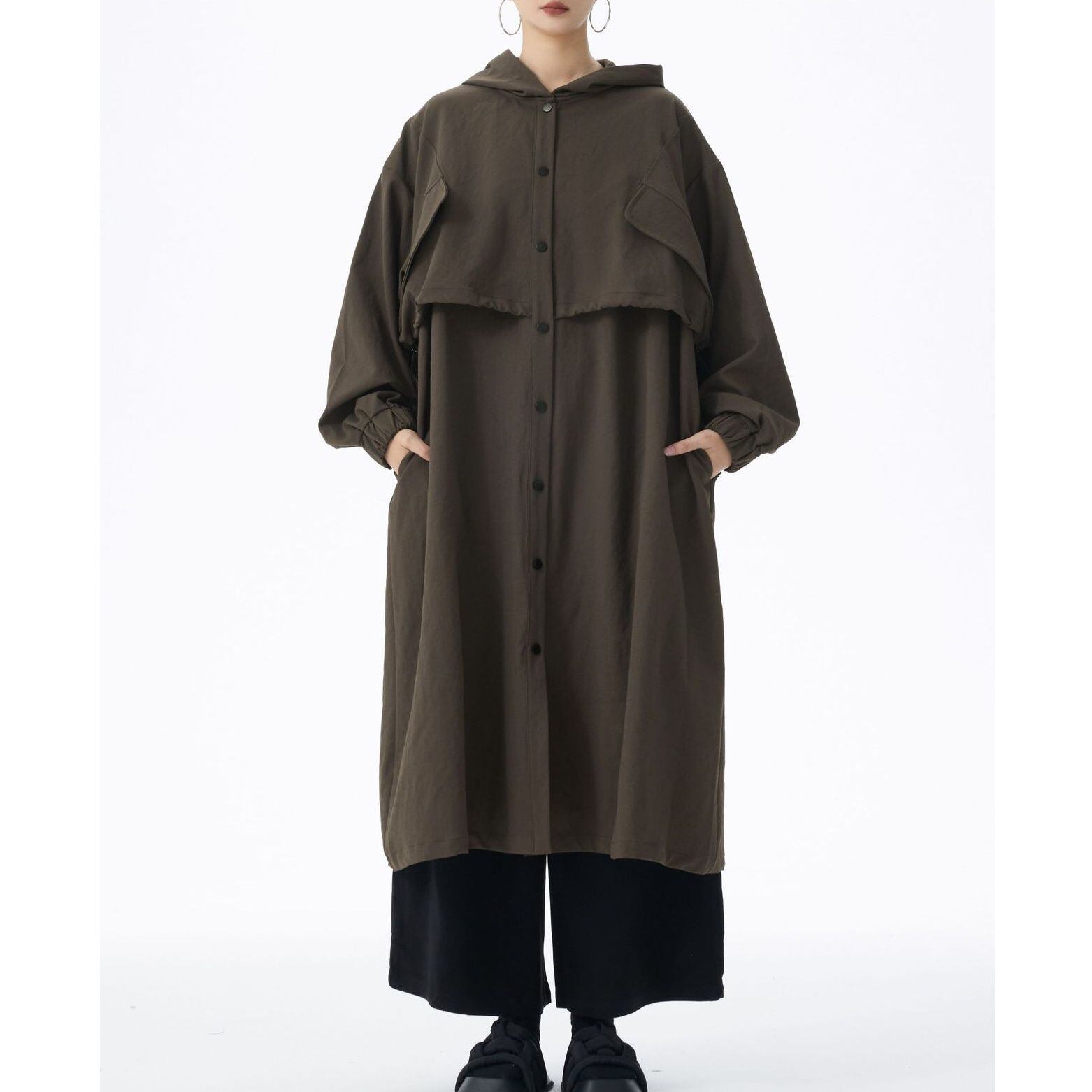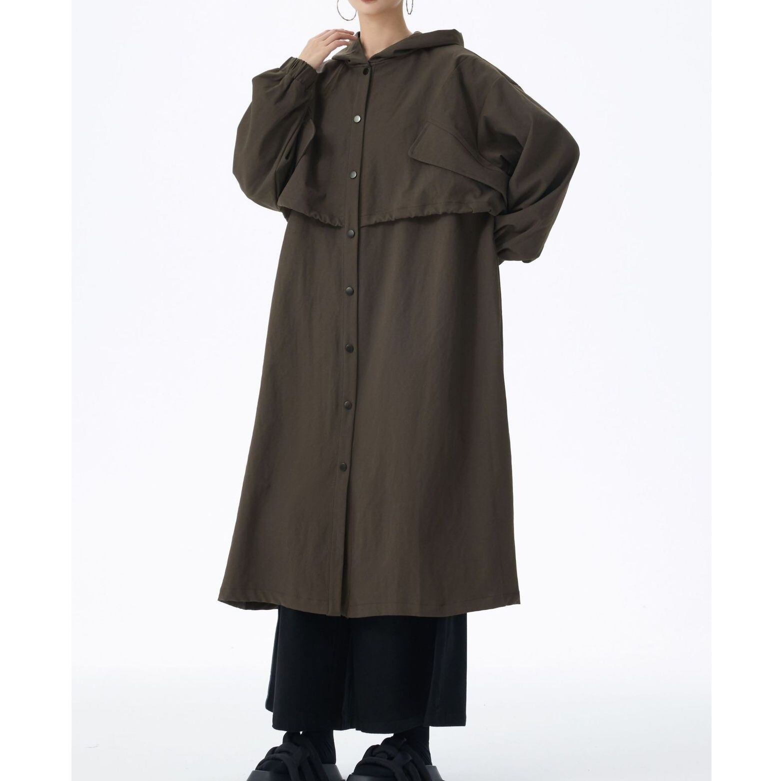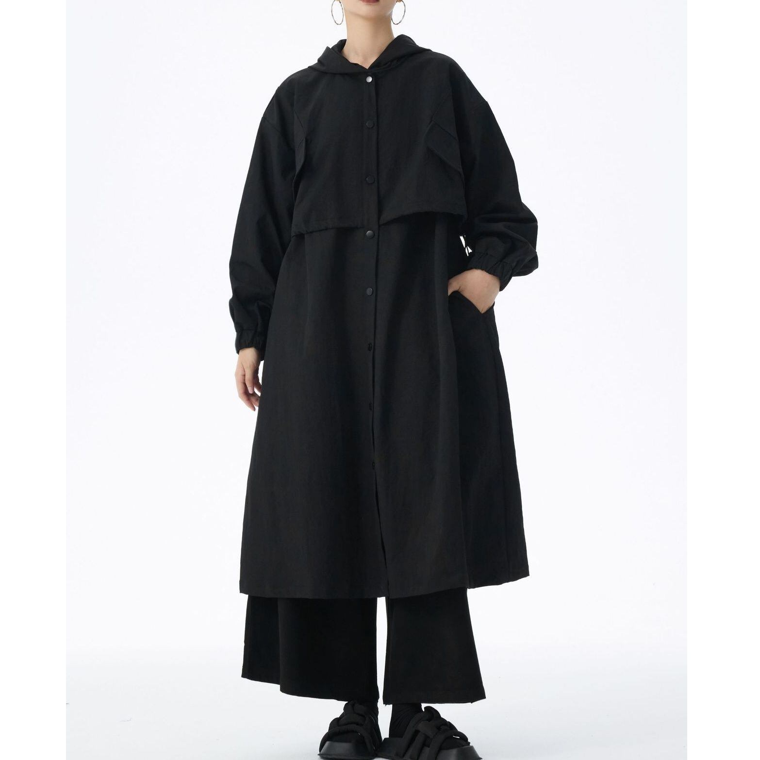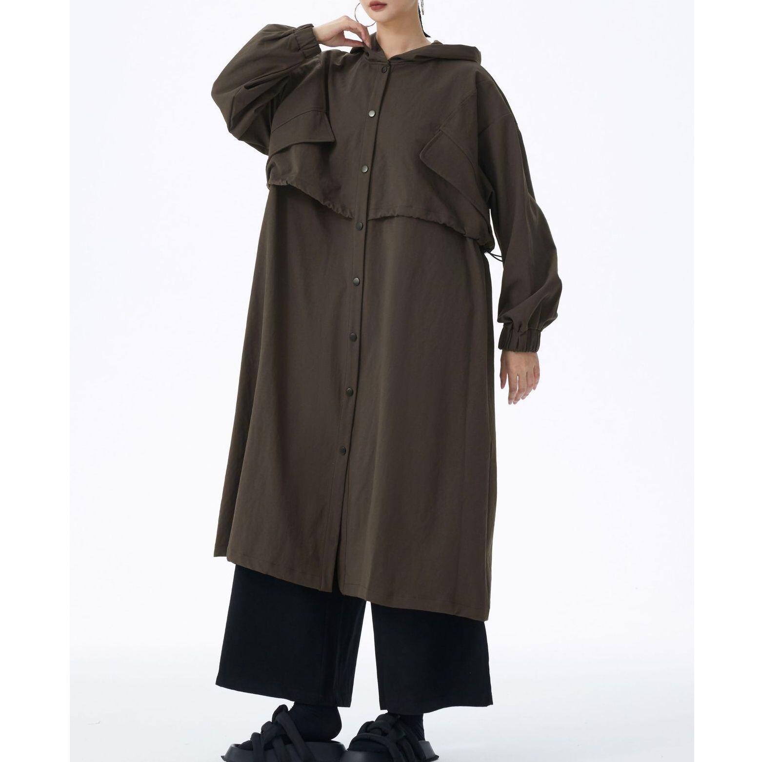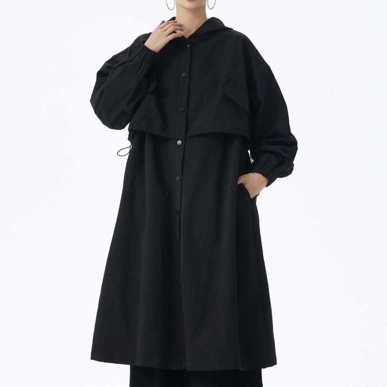 SOLID HOODED DRAWSTRING MIDI WINDBREAKER COAT 2colors M-14705