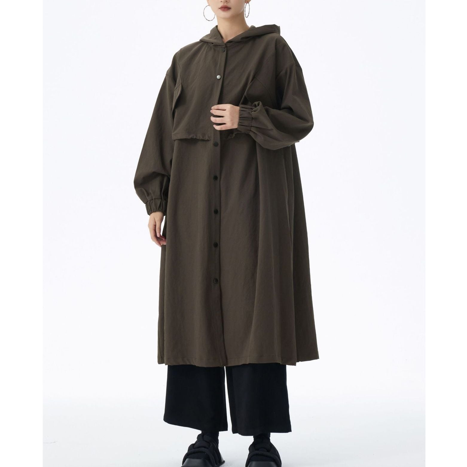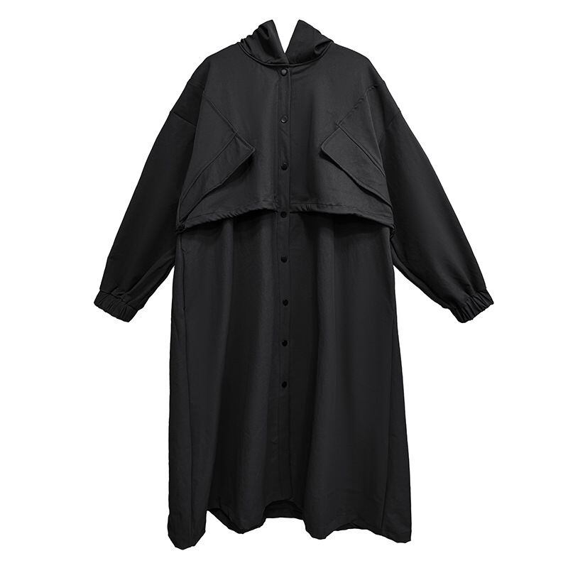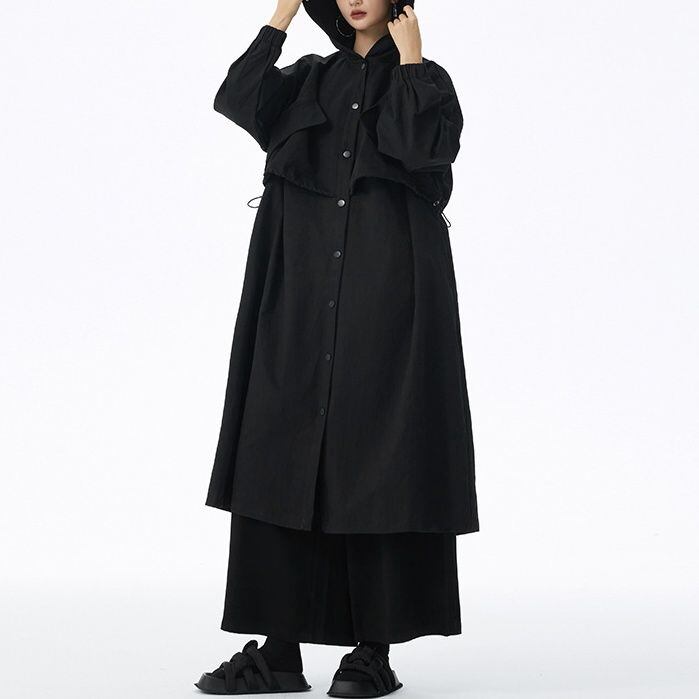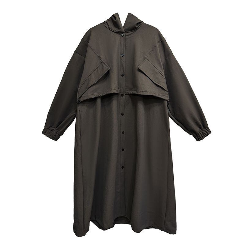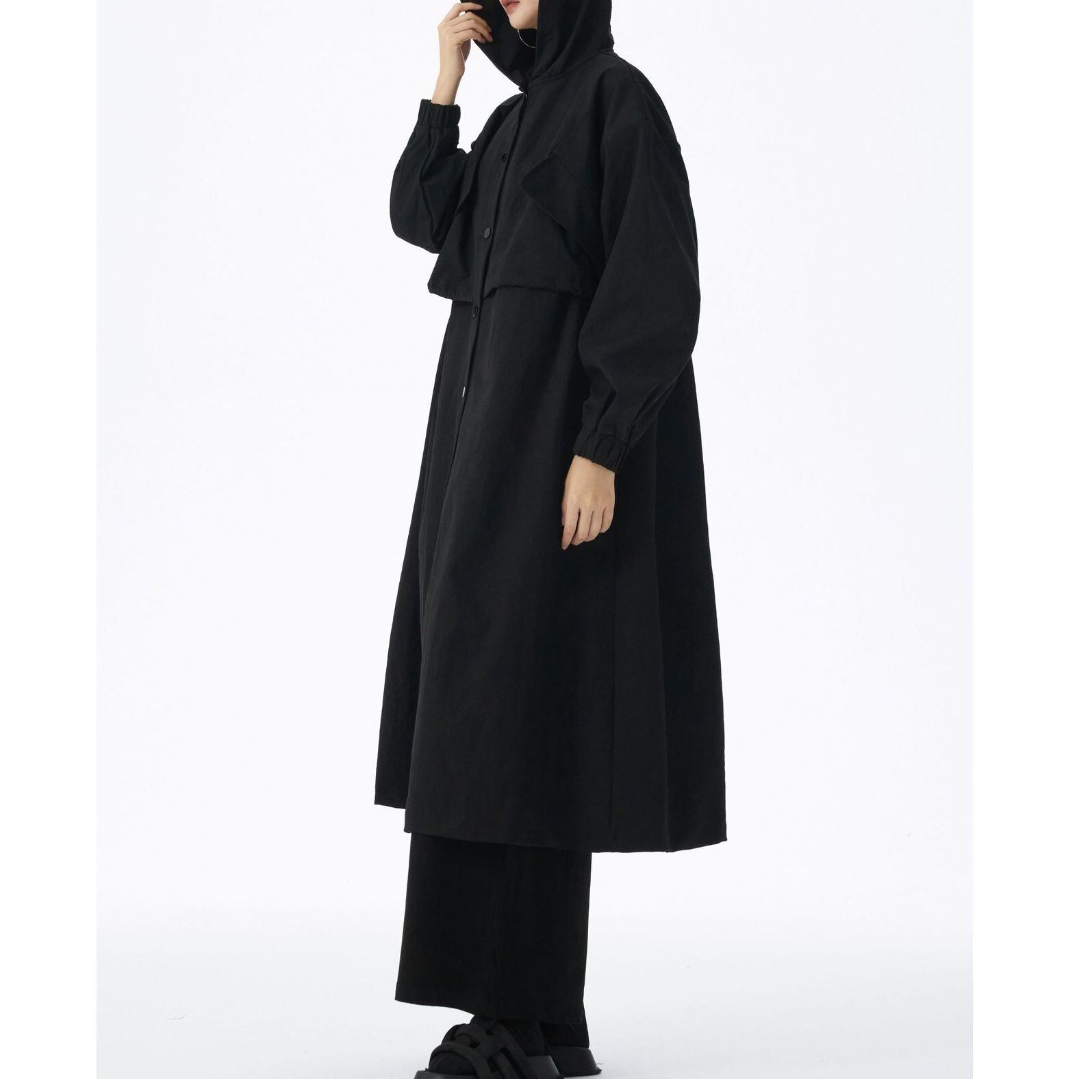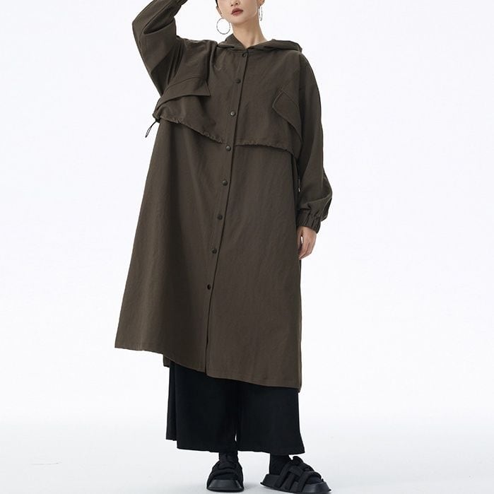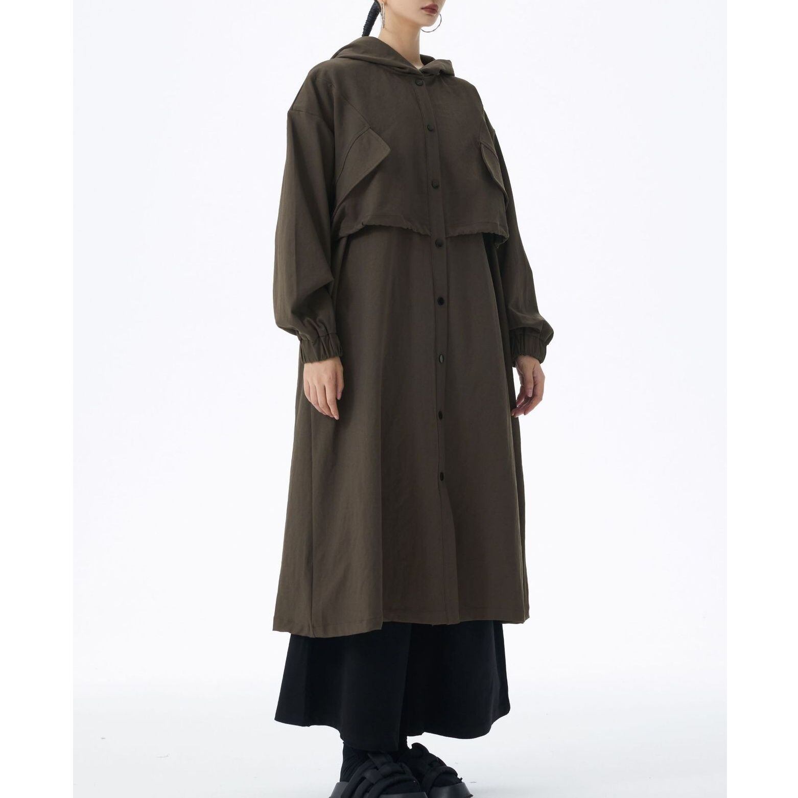 SOLID HOODED DRAWSTRING MIDI WINDBREAKER COAT 2colors M-14705