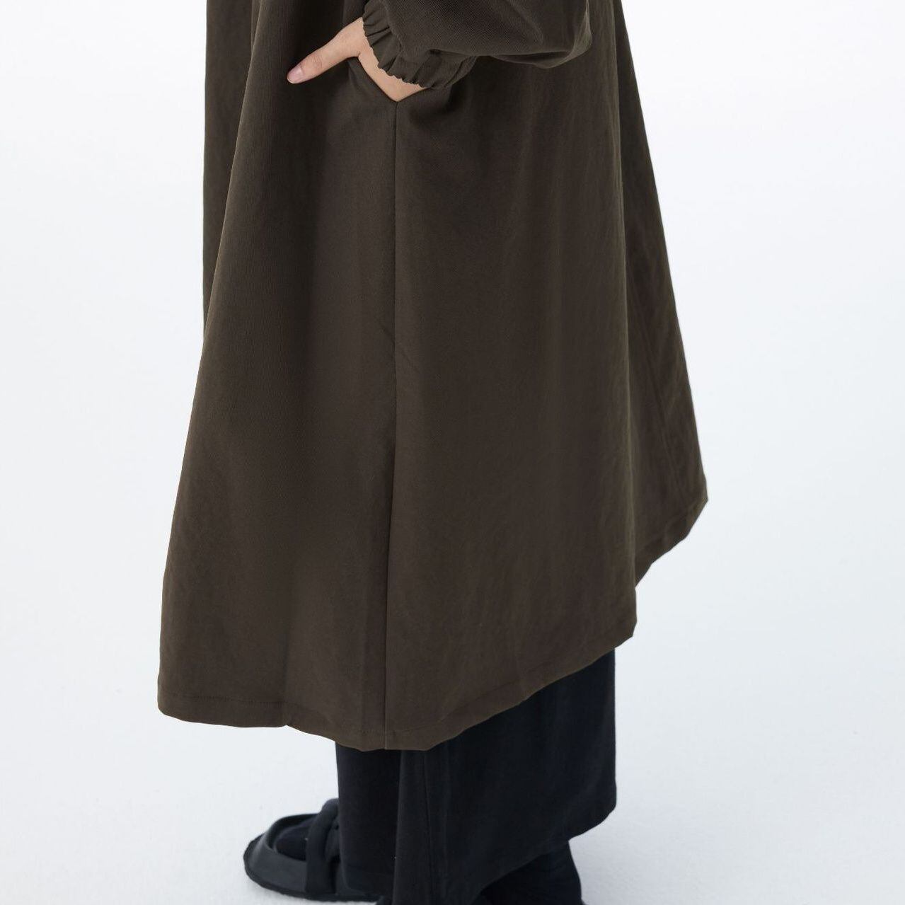 胸下のドローストリングの付いたフラップがお洒落な、フード付き・長袖・ミドル丈のウインドブレーカーコートです。袖口がゴム加工されたボタンダウンのスタイルで、単色のシンプルなシルエットが使いやすいアイテムです。色は2色から選べます。