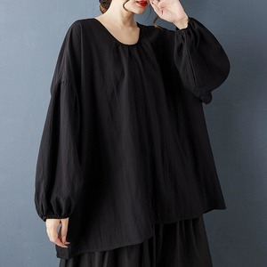 単色のシンプルなデザインが嬉しい、Uネック・長袖・Aラインのプルオーバー・チュニックシャツです。ランタンのように膨らんだ袖やAラインのシルエットがお洒落な、コーディネートしやすいカジュアルアイテムです。パープル・ブラック・ホワイトの3色から選べます。