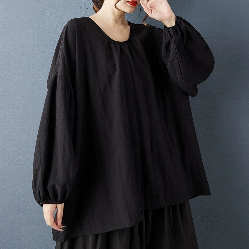 SOLID U-NECK LANTERN SLEEVES A-LINE TUNIC PULLOVER SHIRT 3colors M-14713