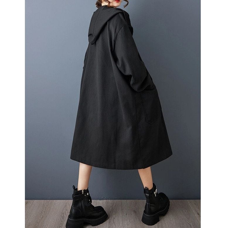 BLACK HOODED A-LINE MIDI CASUAL COAT 1color M-14718