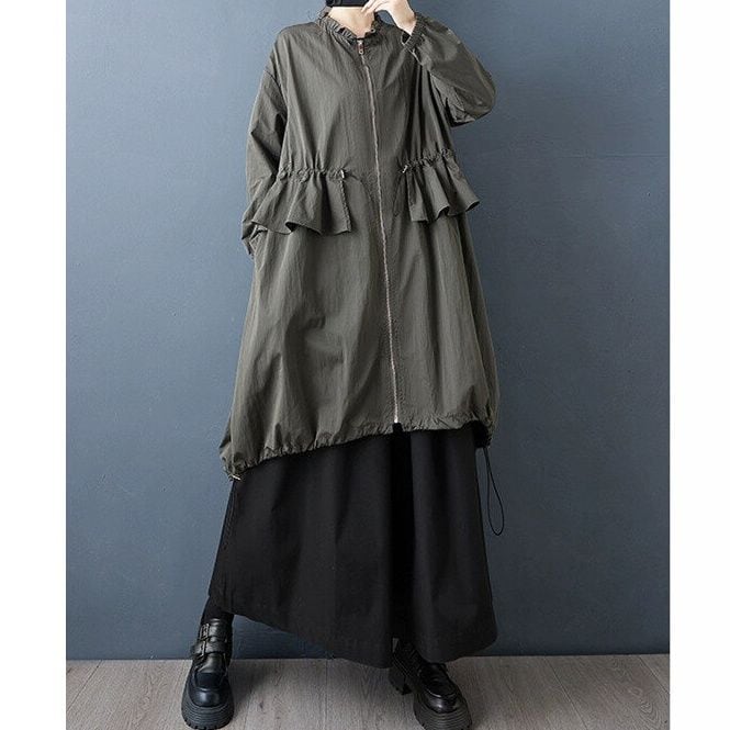 首元やウエストのフリル飾りがガーリーな、スタンドカラー・長袖・ミドル丈のフルジップ・ウインドブレーカーコートです。Aラインの裾はバックが長めになっています。ウエストと裾にドローコードが付いてシルエットを調節できる、単色で合わせやすいアイテムです。ブラックとグレーの2色から選べます。