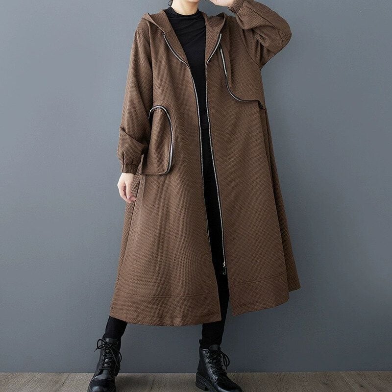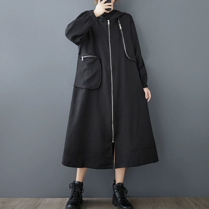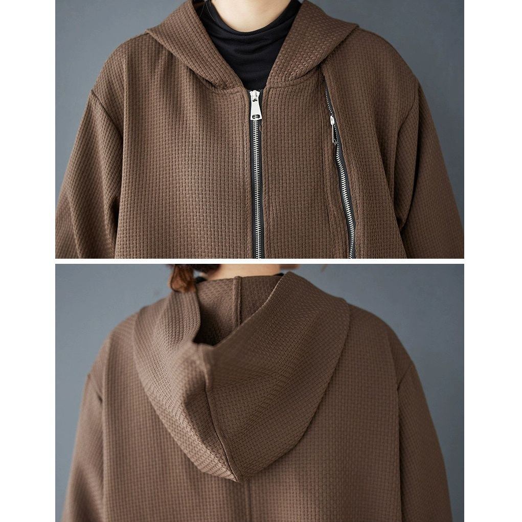 アシンメトリックに配置されたジップ付きの立体デザインポケットがアクセントになった、フード付き・長袖・膝下丈のジャケットコートです。袖口にゴムの入ったワンピースのようなAラインのシルエットがキュートな、秋春に活躍するカジュアルなアイテムです。ブラックとブラウンの2色から選べます。