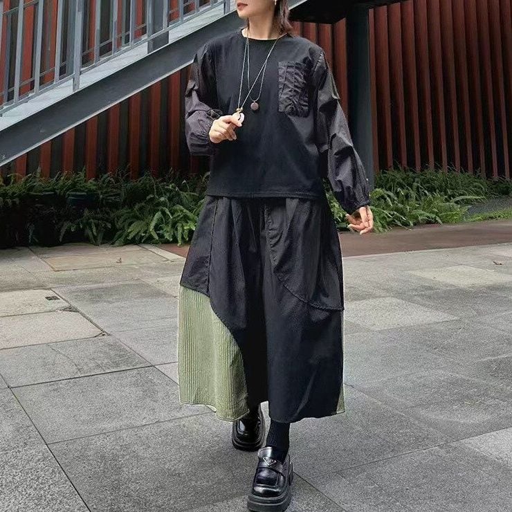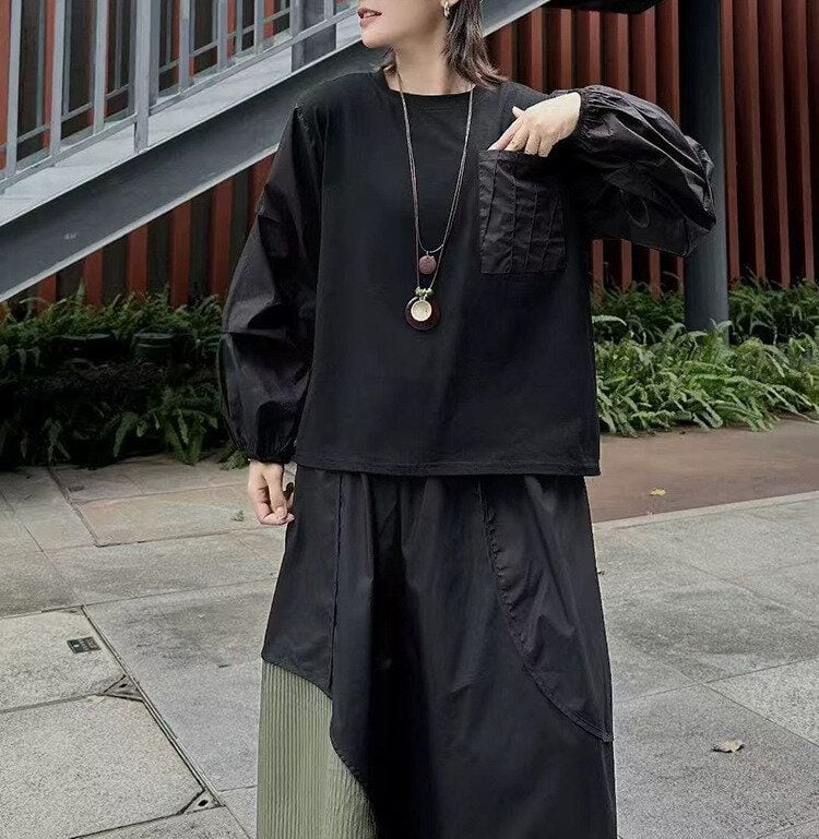 デザインプリーツの作るランタンスリーブやポケットの同色スティッチがお洒落なラウンドネック・長袖・プルオーバーシャツと、ブラックにストライプスティッチのコントラストがお洒落なスカートです。上下別売りです。トップスは3色から選べます。
