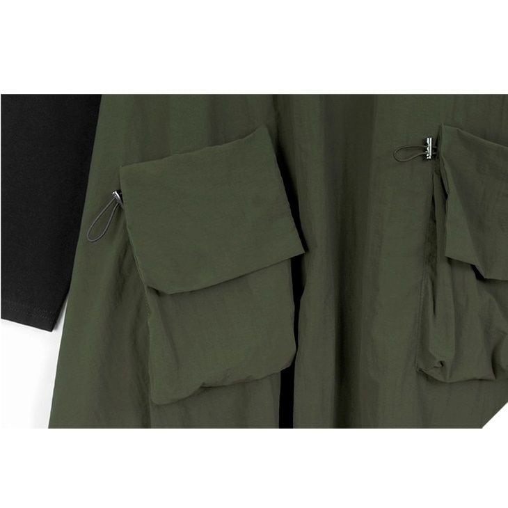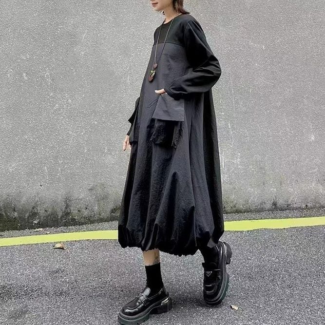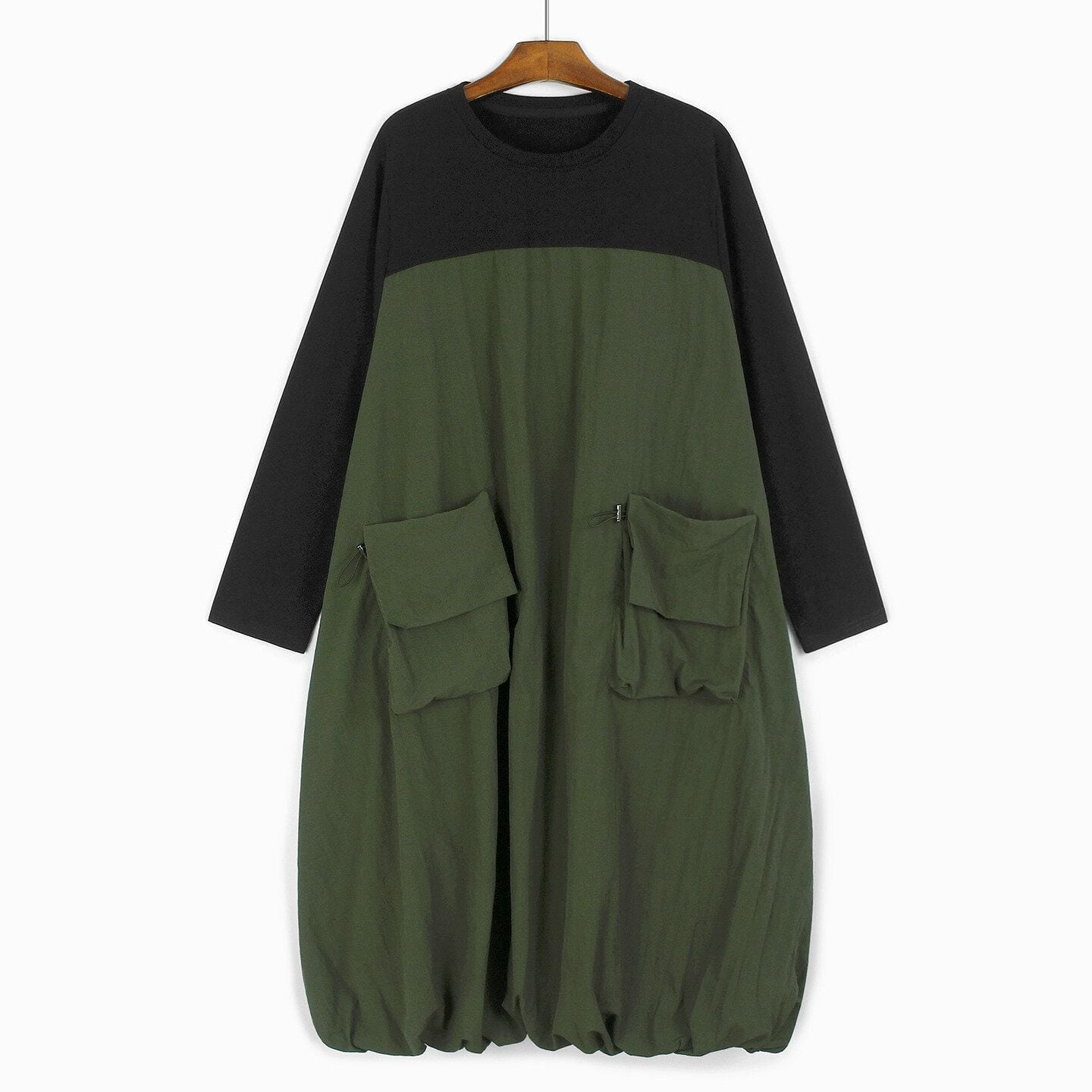 立体的なデザインポケットにバルーンスカートがキュートな、ラウンドネック・長袖・ミドル丈のワンピースです。胸上の切り返しで色や素材が変わるコントラストデザインで、ふんわりしたシルエットが魅力的なカジュアルアイテムです。2色から選べます。