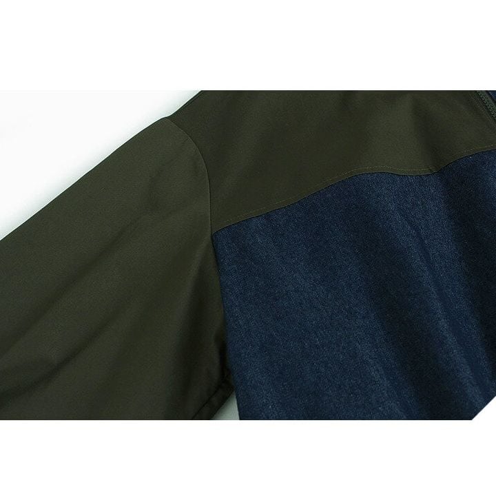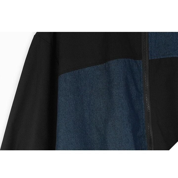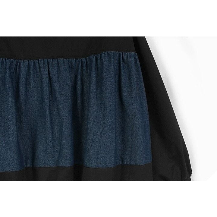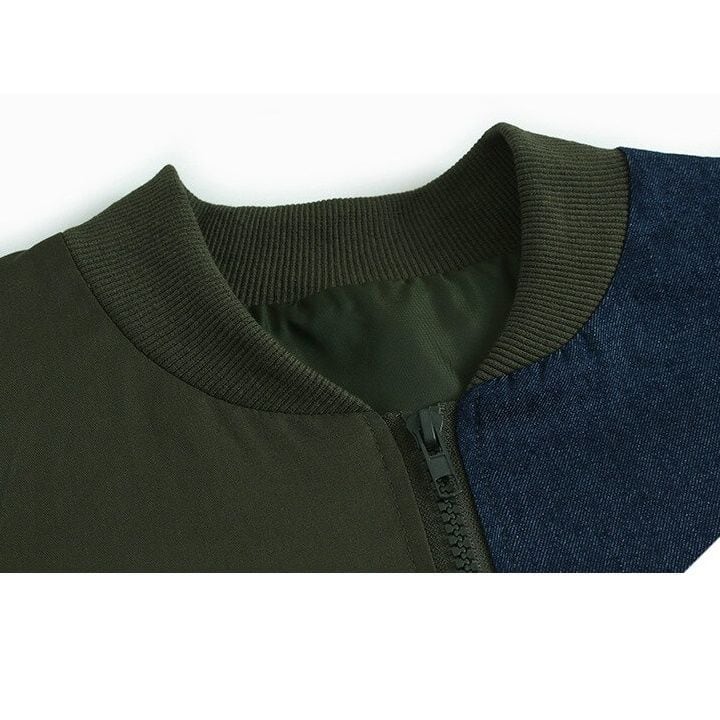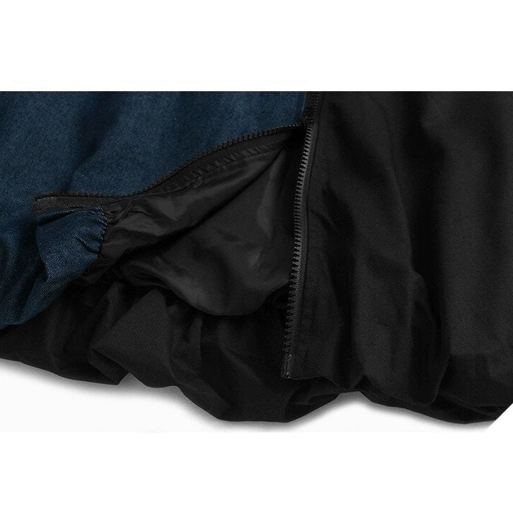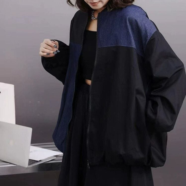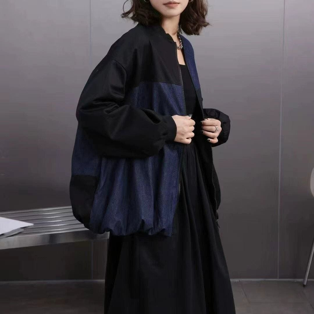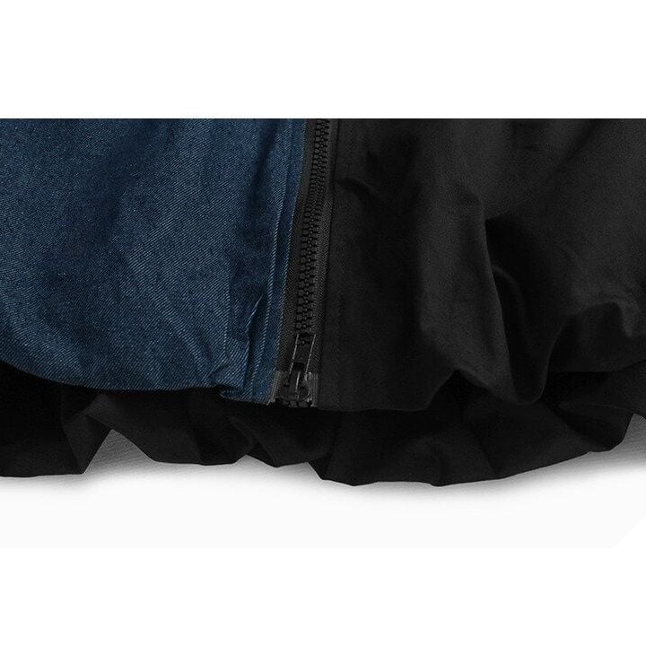 ブルーデニムとのコントラストスティッチデザインがクールな、ベースボールカラー・長袖・フルジップジャケットと、ブラックのワイドレッグパンツです。バルーン状になった裾がキュートなトップスは、ブラックとアーミーグリーンの2色から選べます。