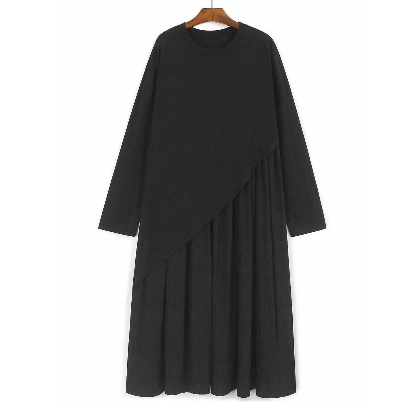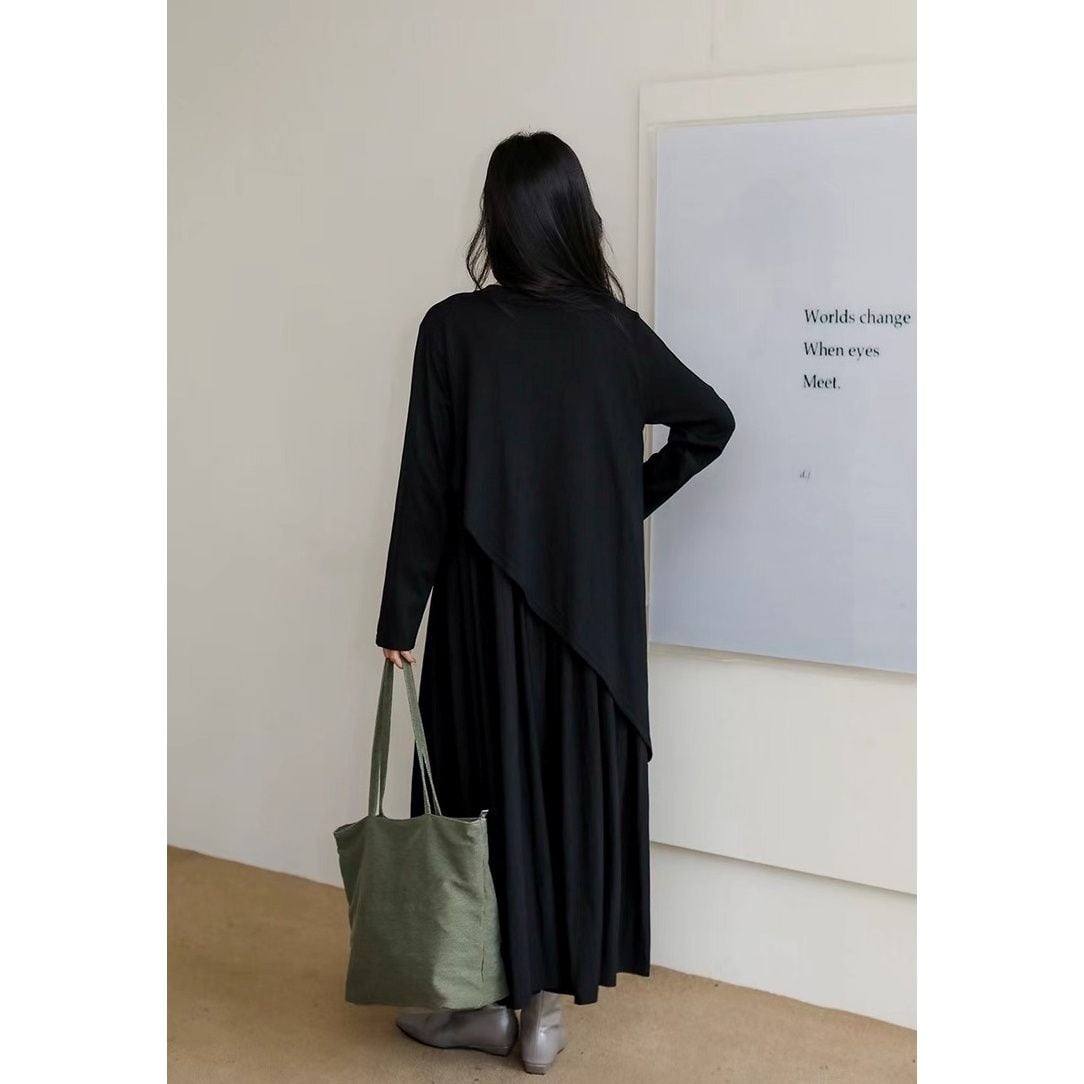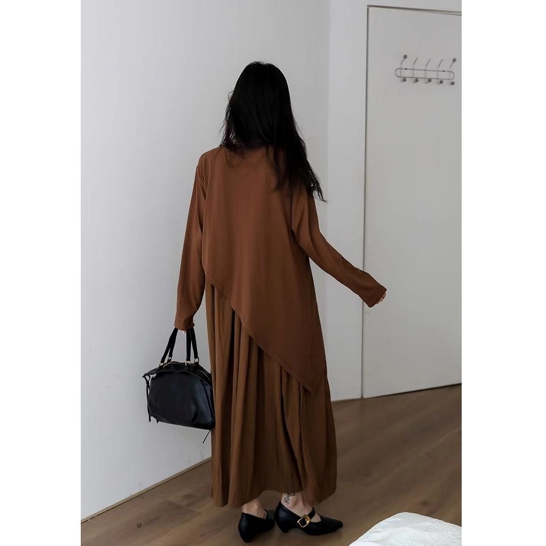 アシンメトリックなフェイクツーピースデザインがお洒落な、ラウンドネック・長袖・ロング丈のプルオーバーワンピースです。単色で小物アレンジが利く、エレガントでリラックスした印象のアイテムです。ブラックとブラウンの2色から選べます。