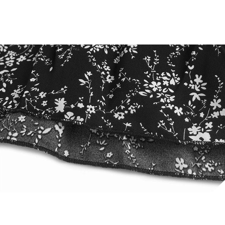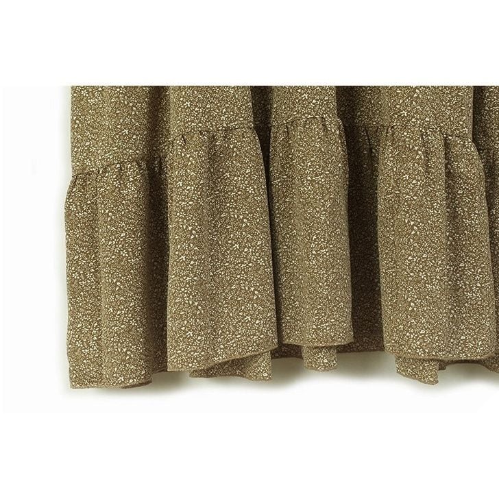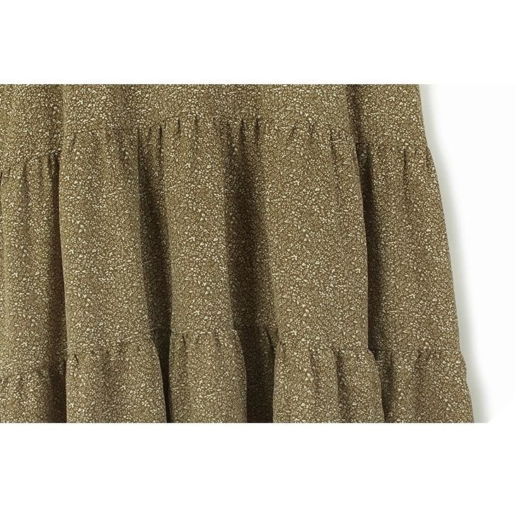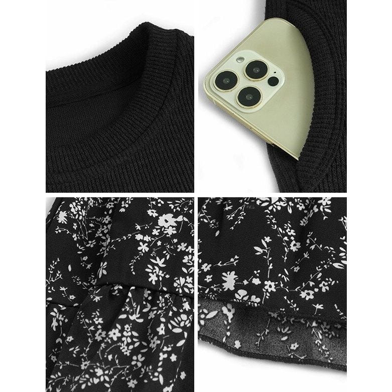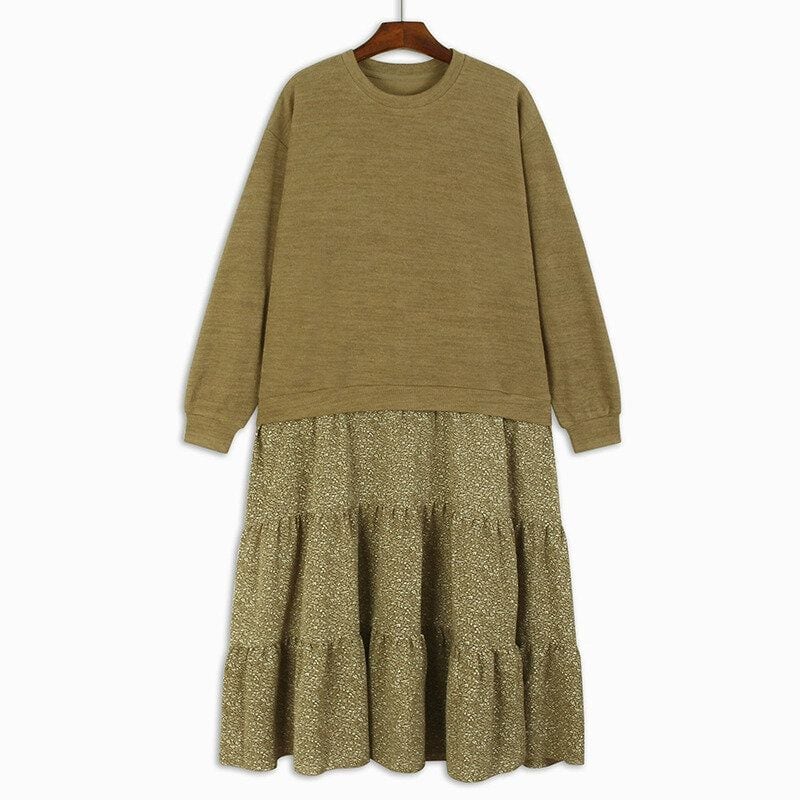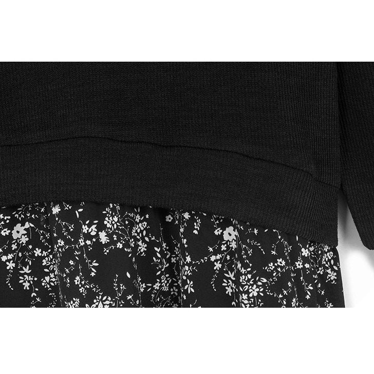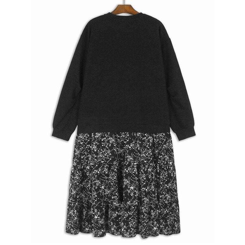 スウェットとボタニカル柄のスカートを合わせたフェイクツーピースデザインがお洒落な、ラウンドネック・長袖・ミドル丈のプルオーバーワンピースです。落ち着いた色味で小物や差し色アレンジが利く、ゆったりとしたシルエットのカジュアルアイテムです。ブラックとキャメルの2色から選べます。