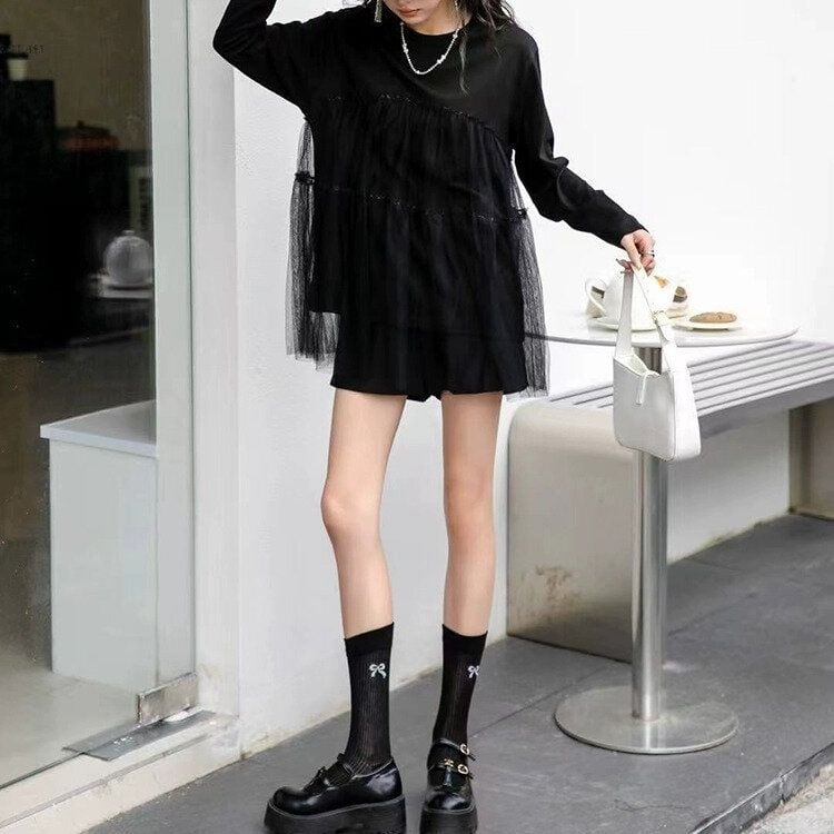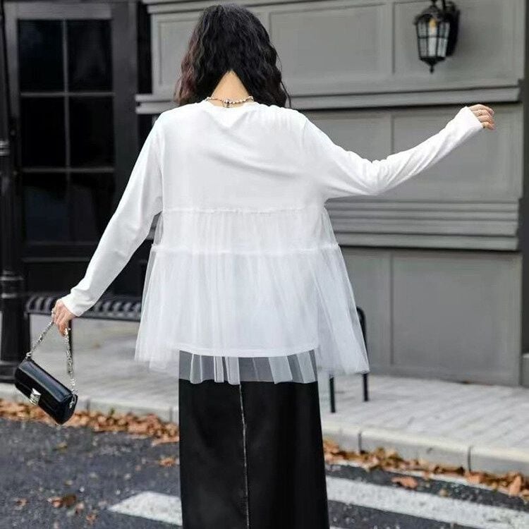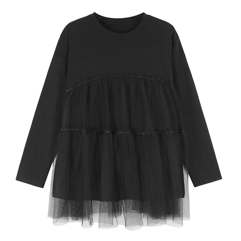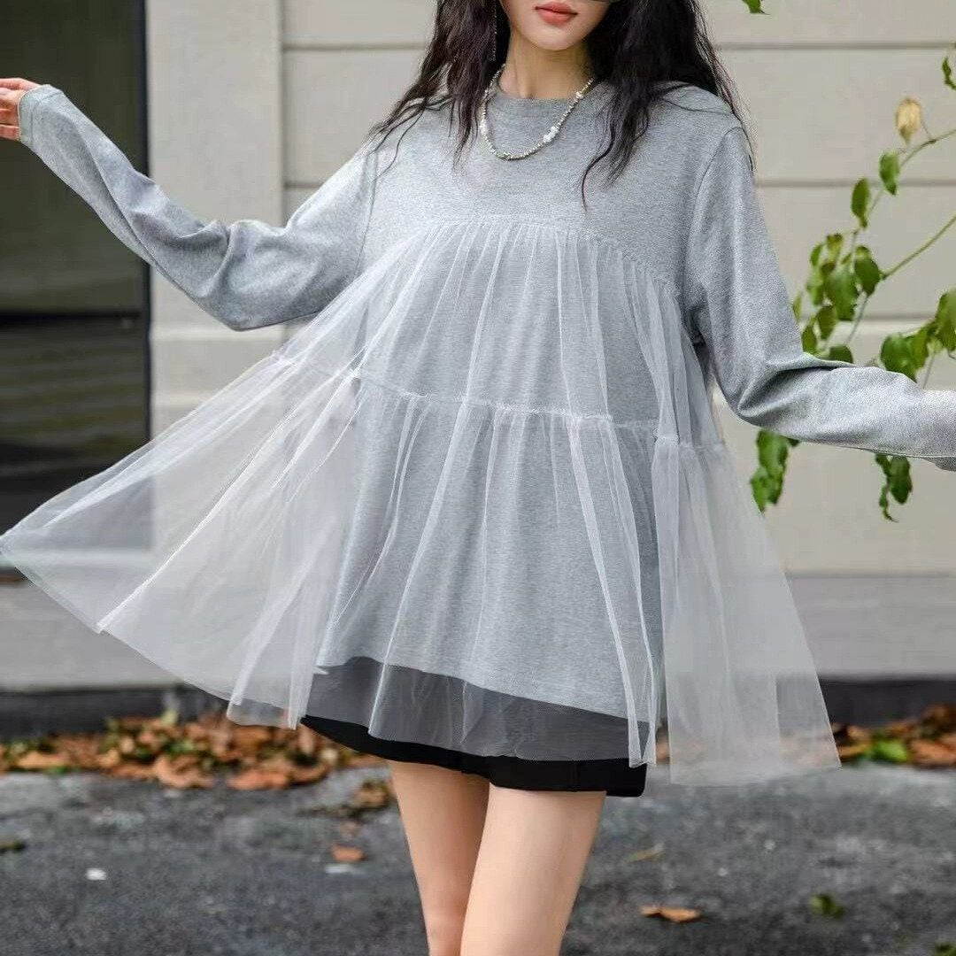 同色のメッシュのチュチュの様なスティッチがキュートな、ラウンドネックのロングスリーブTシャツです。単色でコーディネートしやすい、ガーリーな印象のカジュアルアイテムです。ブラック・グレー・ホワイトの3色から選べます。