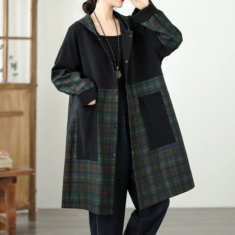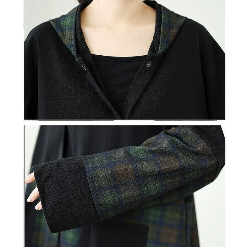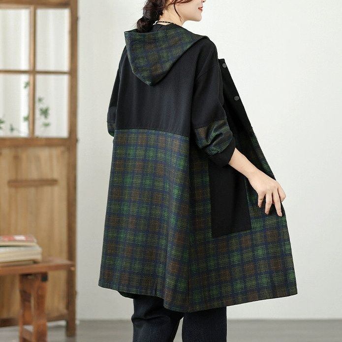 ブラックとレトロなチェック柄生地とのコントラストスティッチデザインがお洒落な、フード付き・長袖・ミドル丈のジャケットコートです。ひかえめなAラインのシルエットとスナップボタンで使いやすい、クールな印象のカジュアルアイテムです。
