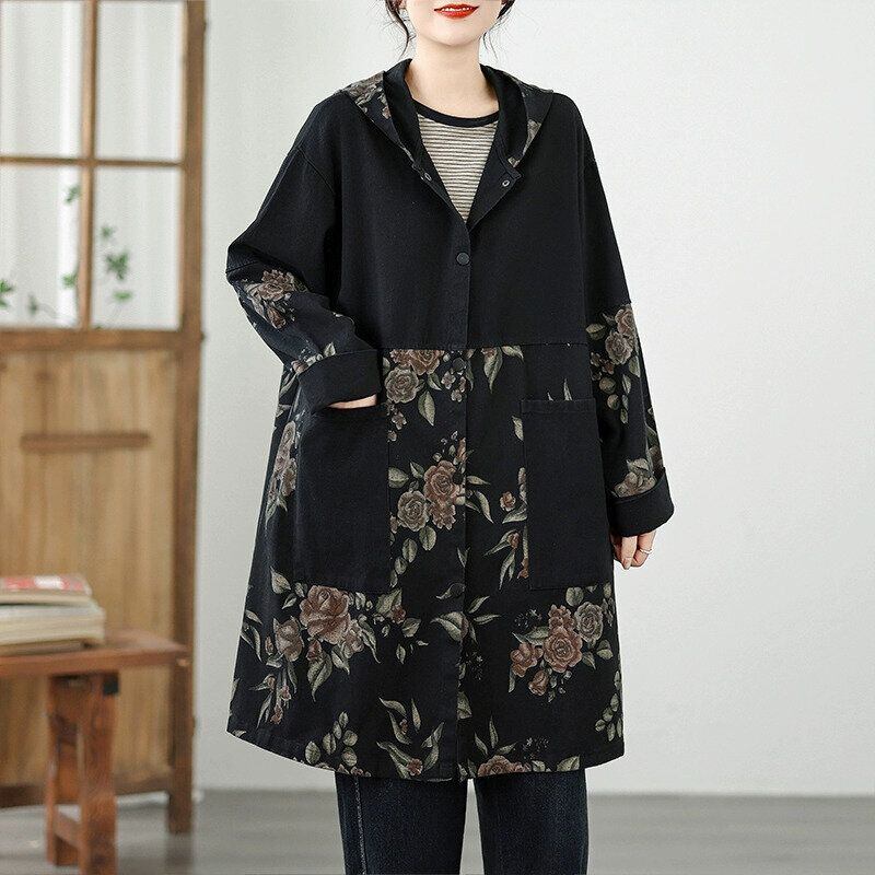 BLACK FLOWER PRINT STITCH HOODED MIDI JACKET COAT 1color M-14825