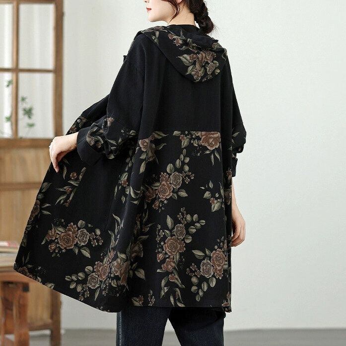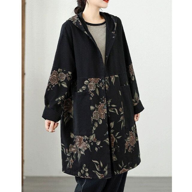 ブラックと美しい花柄生地とのコントラストスティッチデザインがお洒落な、フード付き・長袖・ミドル丈のジャケットコートです。ひかえめなAラインのシルエットとスナップボタンで使いやすい、クールな印象のカジュアルアイテムです。