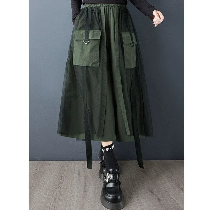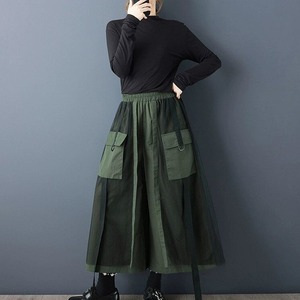 ブラックメッシュのレイヤードや長く垂れたストラップの付いたデザインポケットが目を惹く、ワイドレッグ・クロップド・カジュアルパンツです。ウエストはゴムなので、着脱が簡単で履き心地が良いです。コーティネートのアクセントになる、スカートのようなシルエットが美しいアイテムです。2色から選べます。