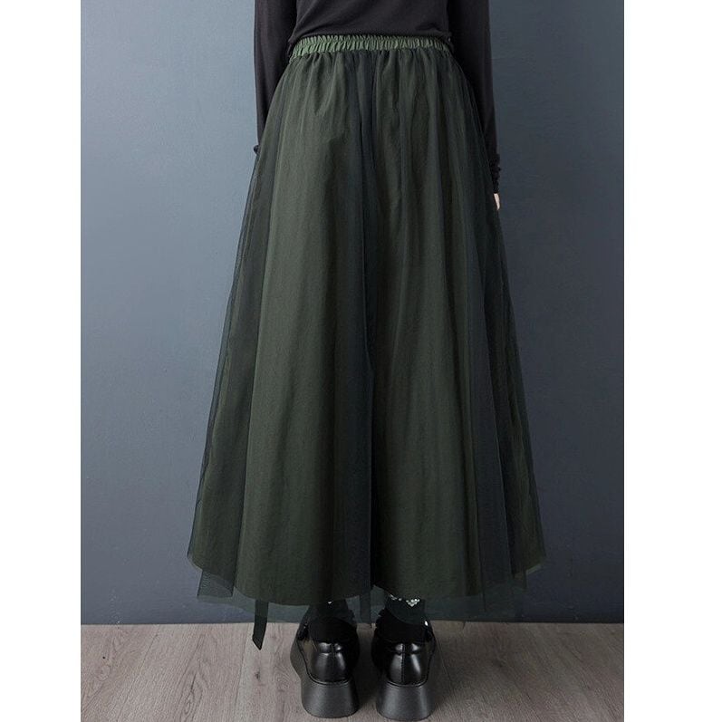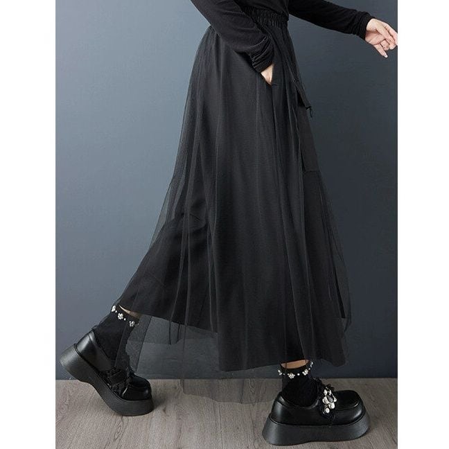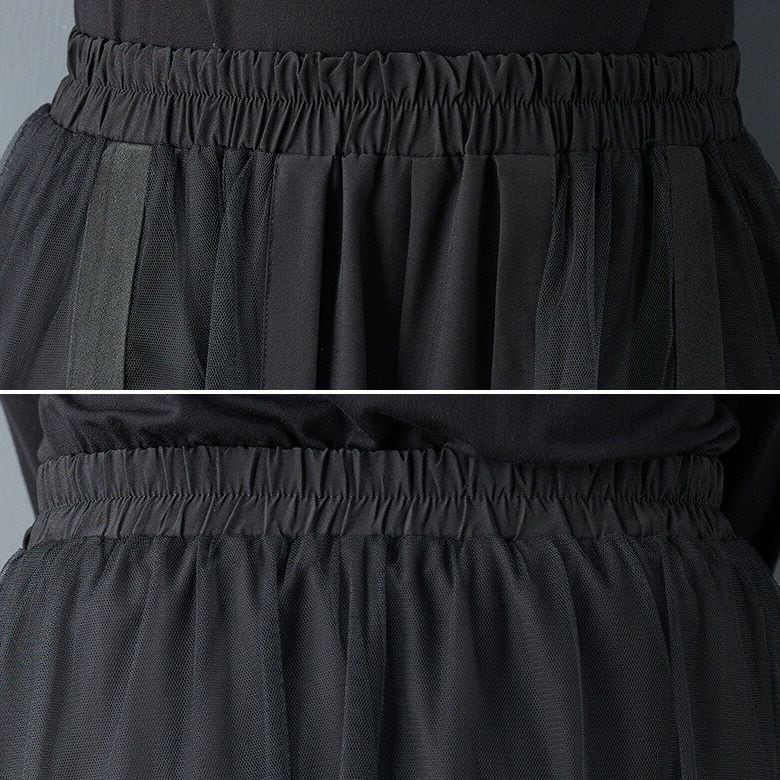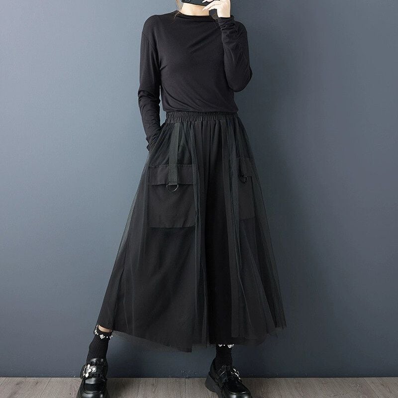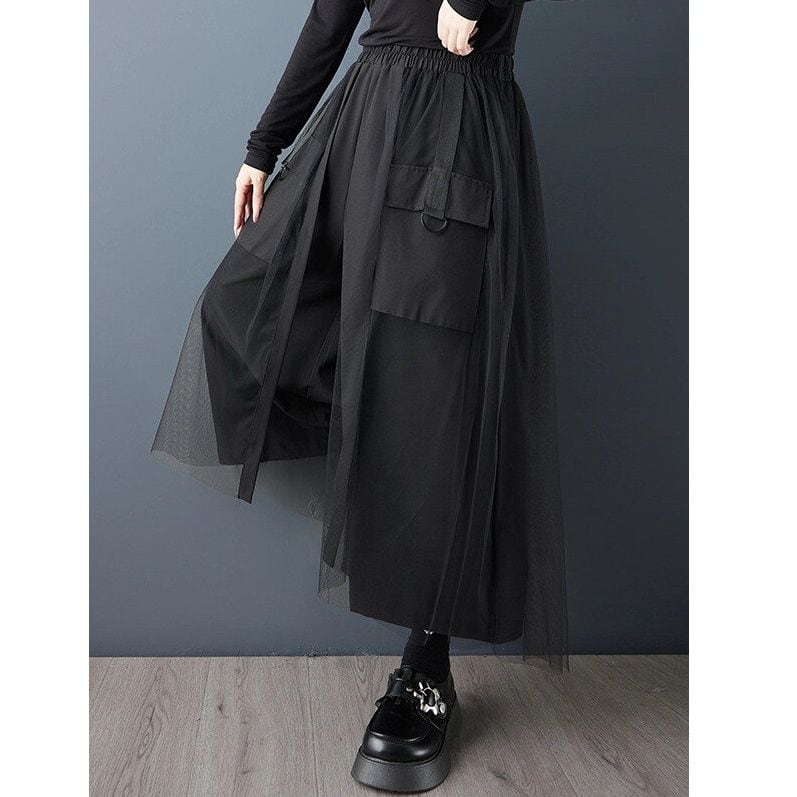 BLACK MESH LAYERED ELASTIC WAIST A-LINE WIDE LEG CROPPED PANTS 2colors M-14826