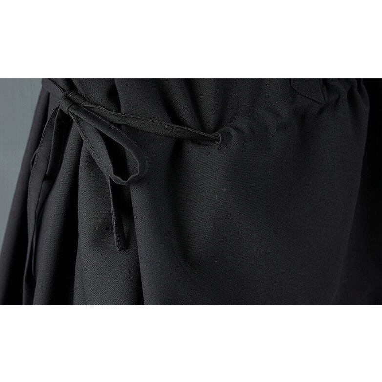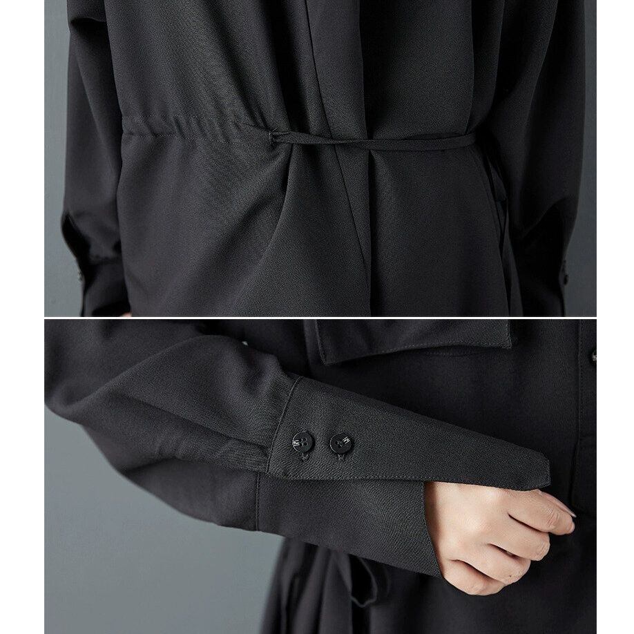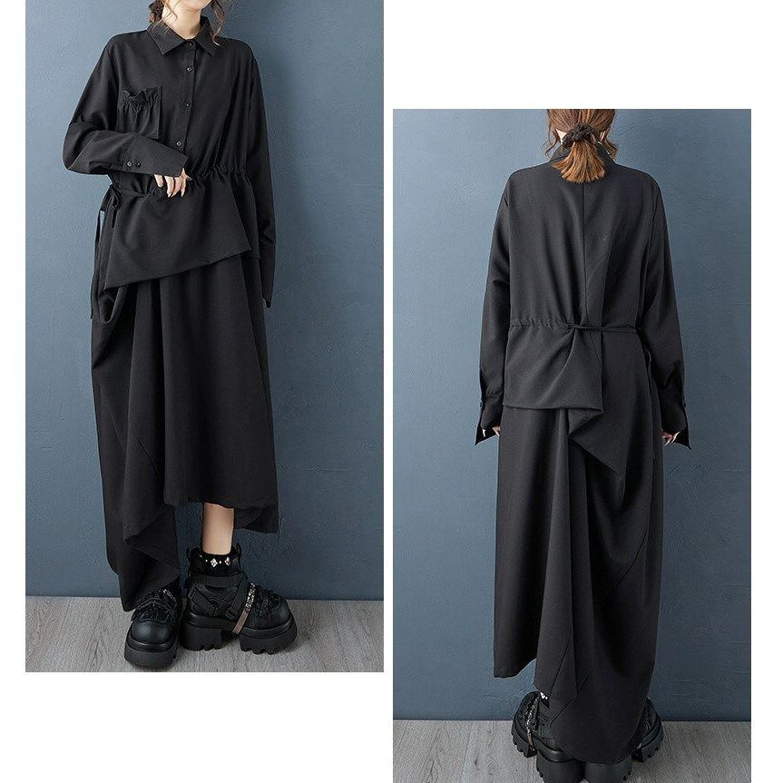 アシンメトリックなデザインが目を惹く、ポロ襟・ハーフボタン・長袖・ロング丈のシャツワンピースです。小物やアクセサリーなどのアレンジが利く、オールブラックです。ドローストリングやプリーツが作り出す、特徴的なシルエットが魅力のモード系アイテムです。