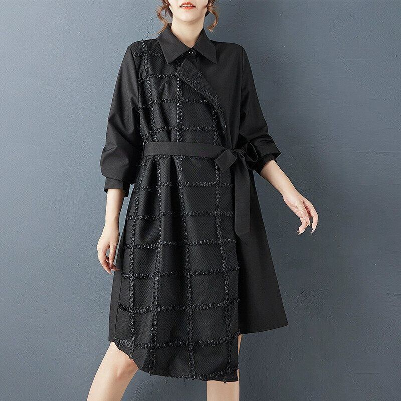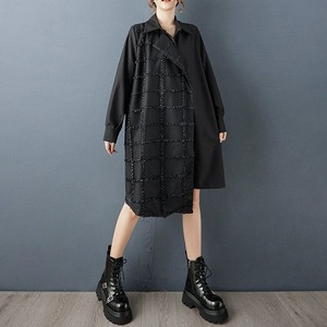 アシンメトリックなデザインが目を惹く、ブラックのポロ襟・長袖・ミニ丈のシャツワンピースです。ウエストをリボンベルトで結ぶとコートのようになるシルエットがキュートな、パーティやイベントでも活躍するアイテムです。