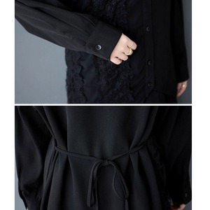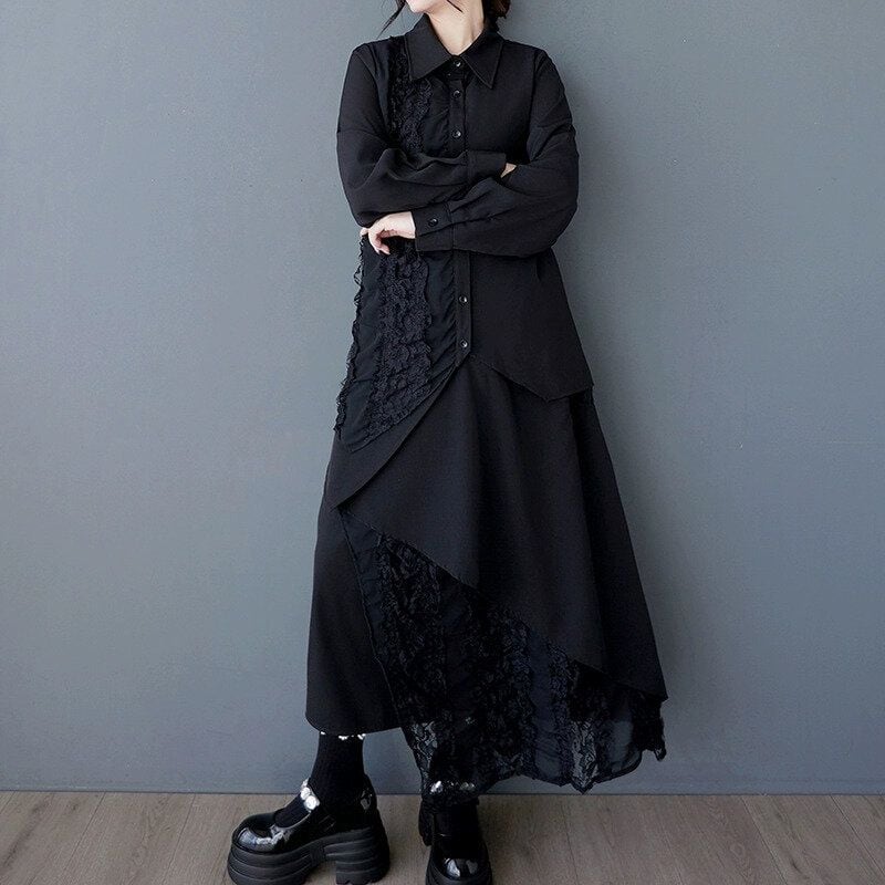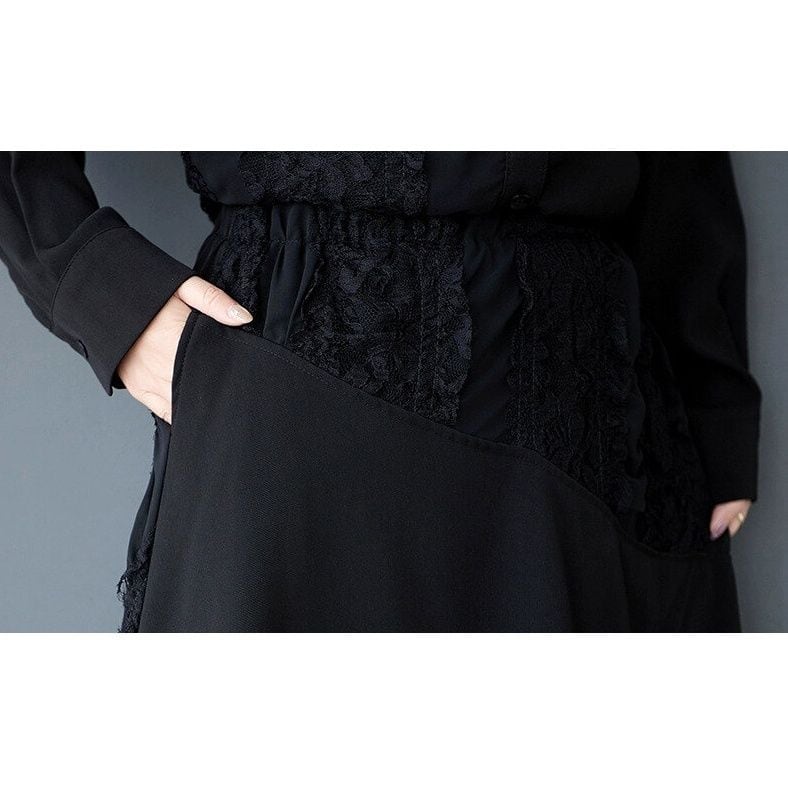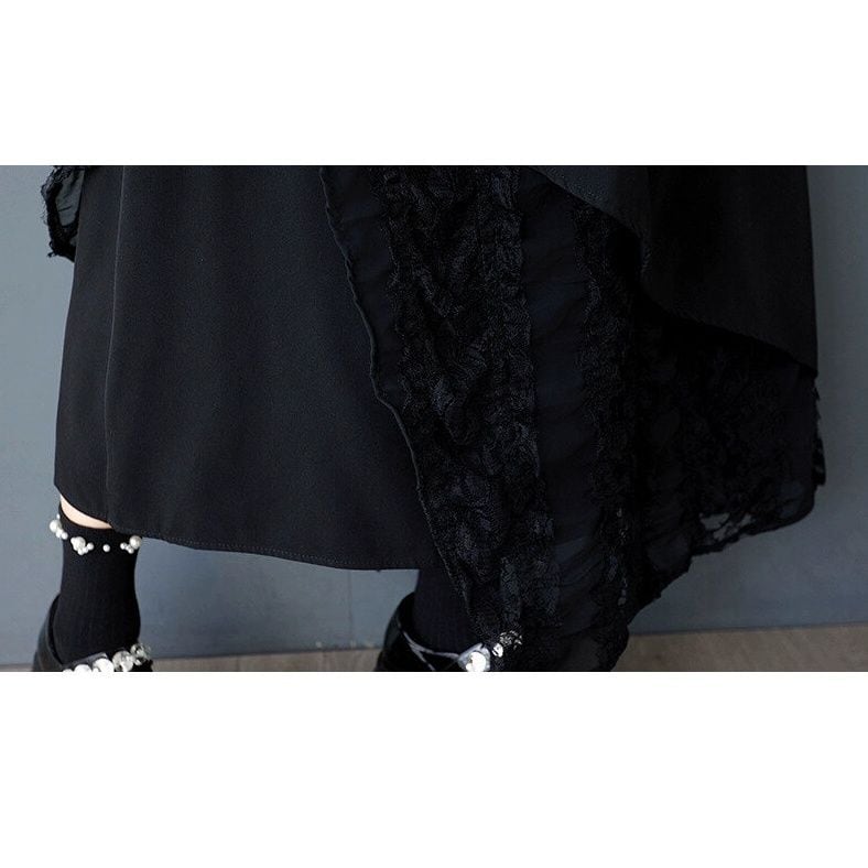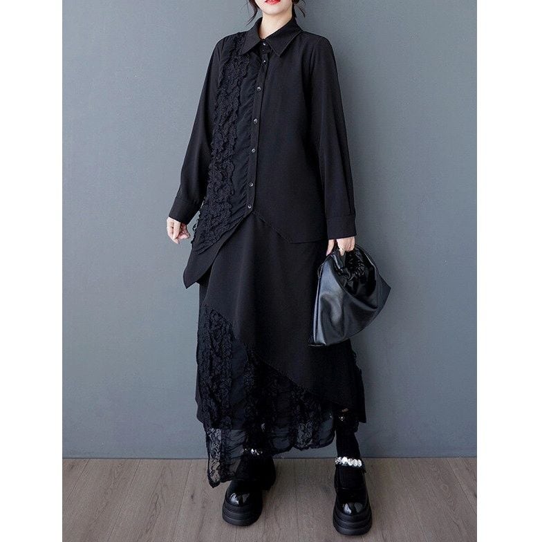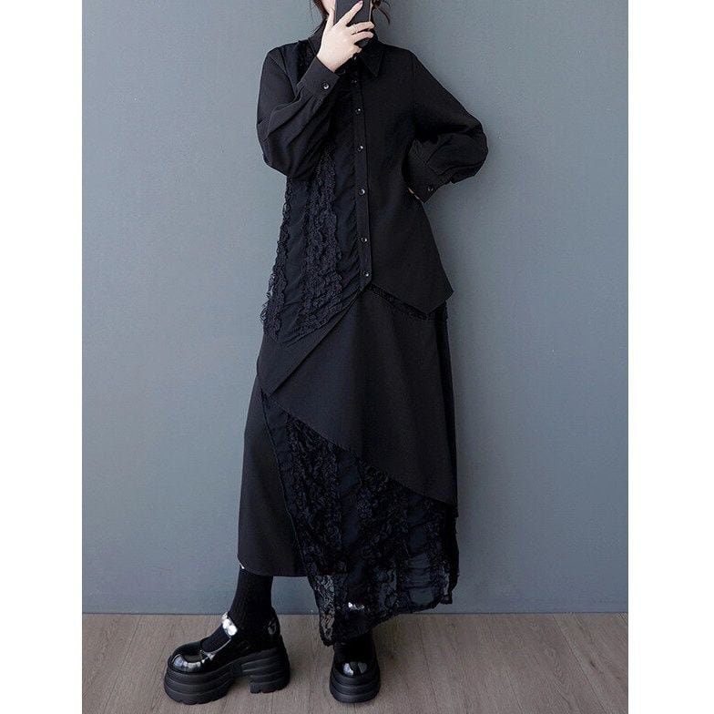 レースのスティッチが美しいアシンメトリックなシルエットが目を惹く、ポロ襟・長袖・イレギュラーヘムのデザインシャツとロングスカートのセットアップです。スカートはウエストがゴムなので、着脱が簡単で履き心地が良いです。オールブラックの、クールとガーリーがミックスした印象のアイテムです。