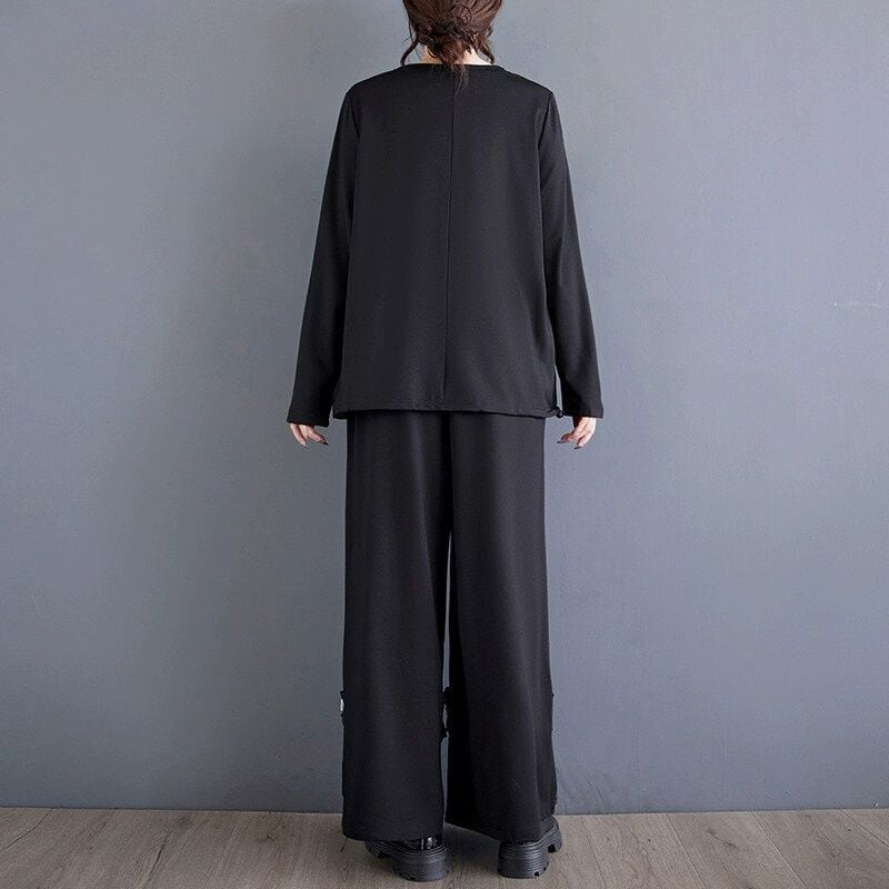 BLACK DESIGN LONG SLEEVES T-SHIRT & WIDE LEG PANTS SET 2pieces 1color M-14835