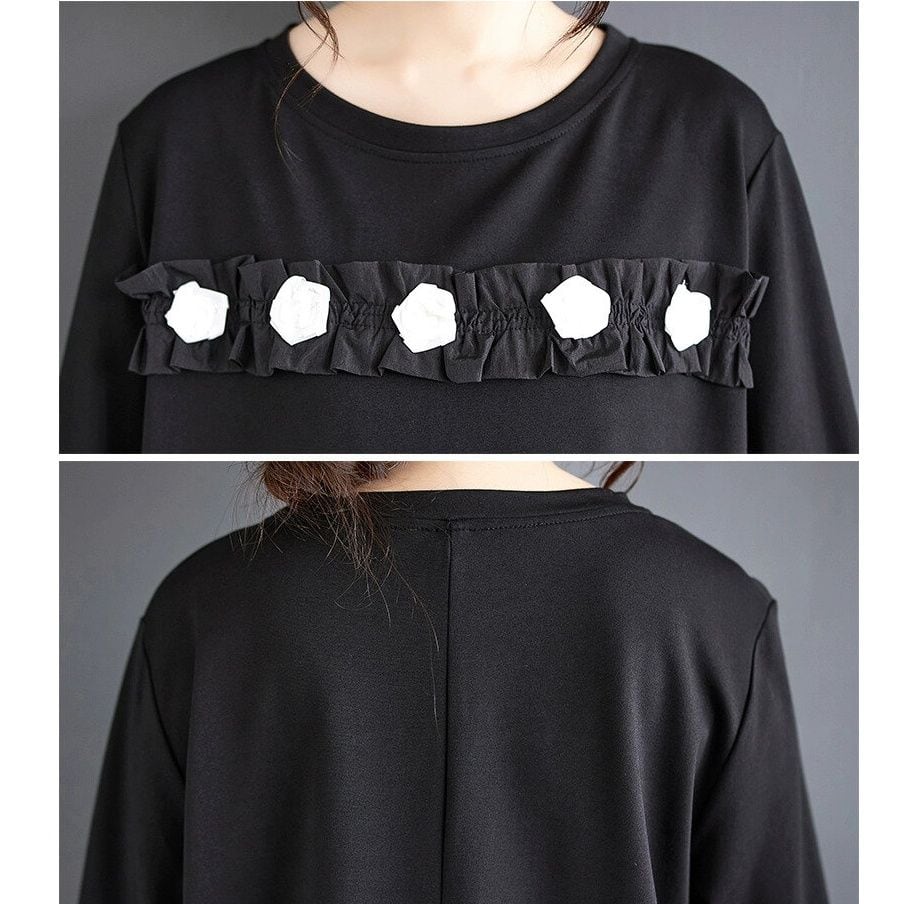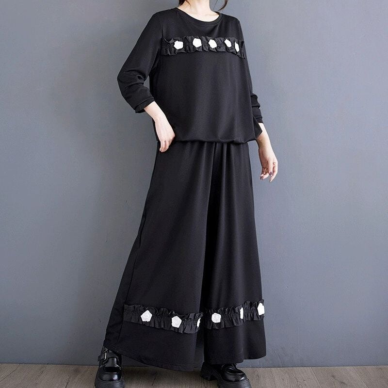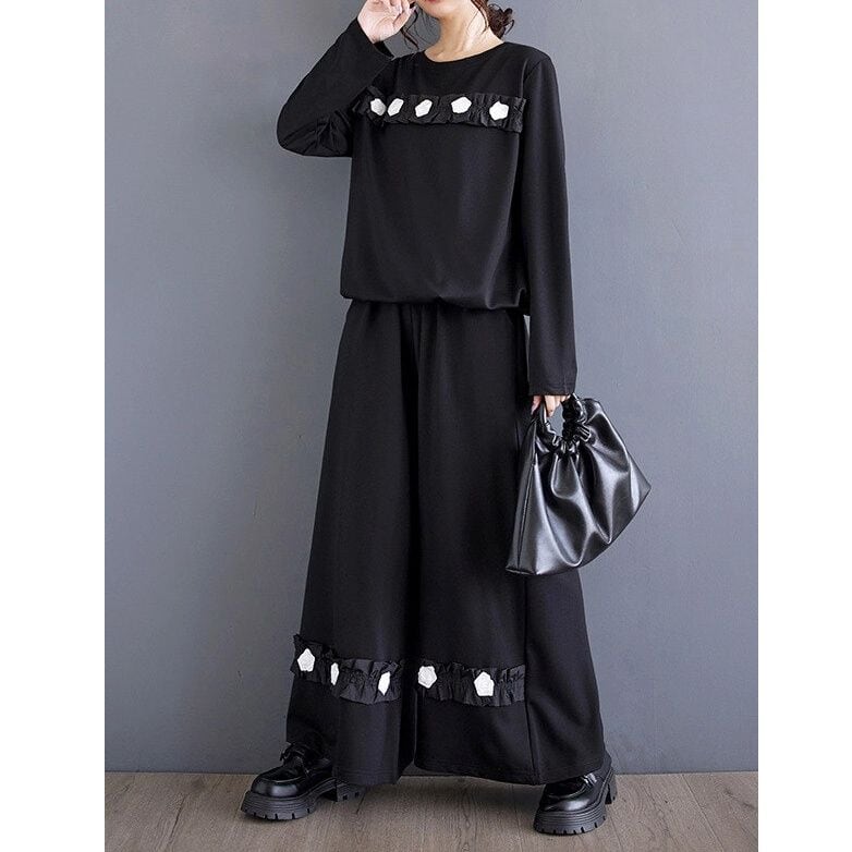 白いお花のモチーフが並んだフリルリボンのラインがキュートな、ブラックのロングスリーブTシャツとワイドレッグパンツのセットアップです。トップスは裾にドローコードが付いています。パンツはウエストがゴムで、ロングスカートのようなAラインが魅力的なアイテムです。