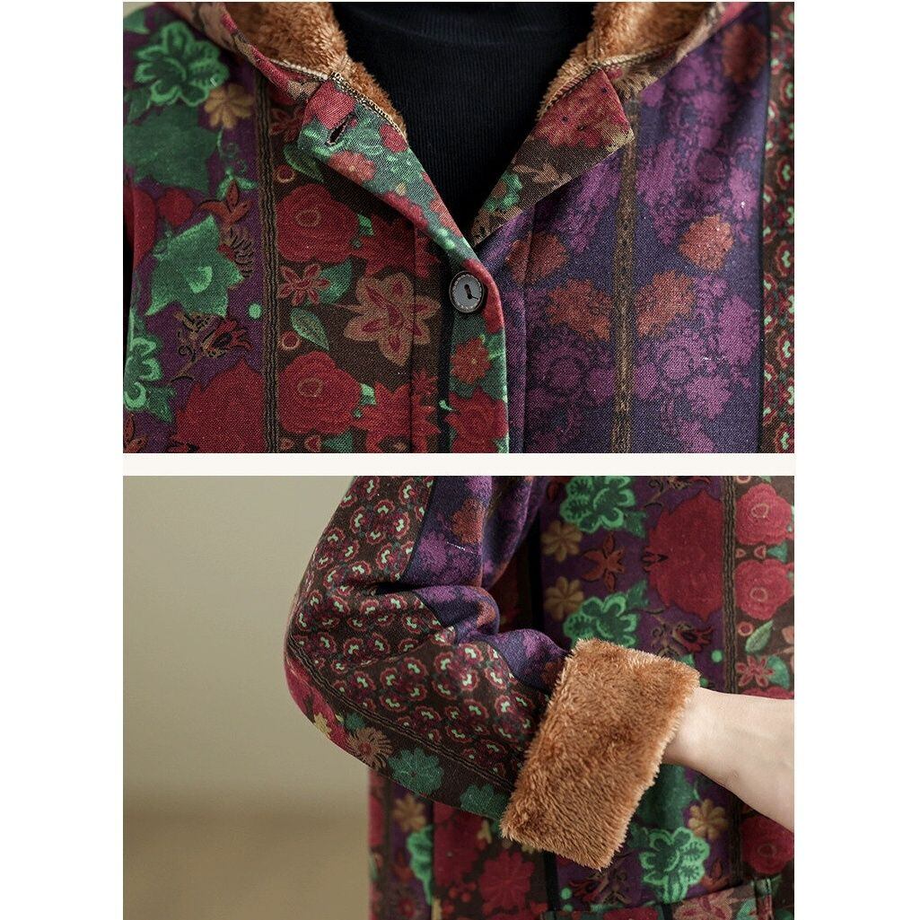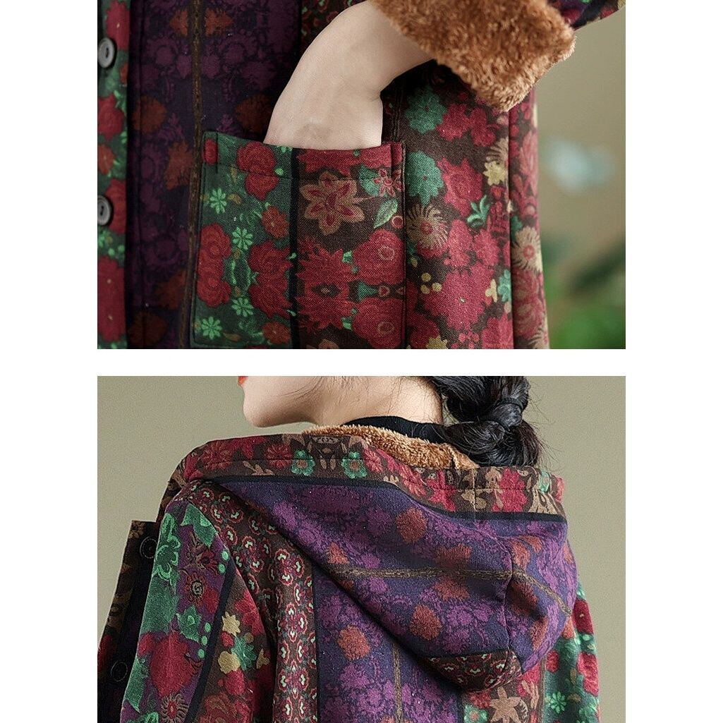 パープルやワインレッドのレトロな花柄素材が目を惹く、フード付き・長袖・膝下丈のジャケットコートです。ブラウンの毛布のようなライニングが暖かな、Aラインシルエットの美しいアイテムです。