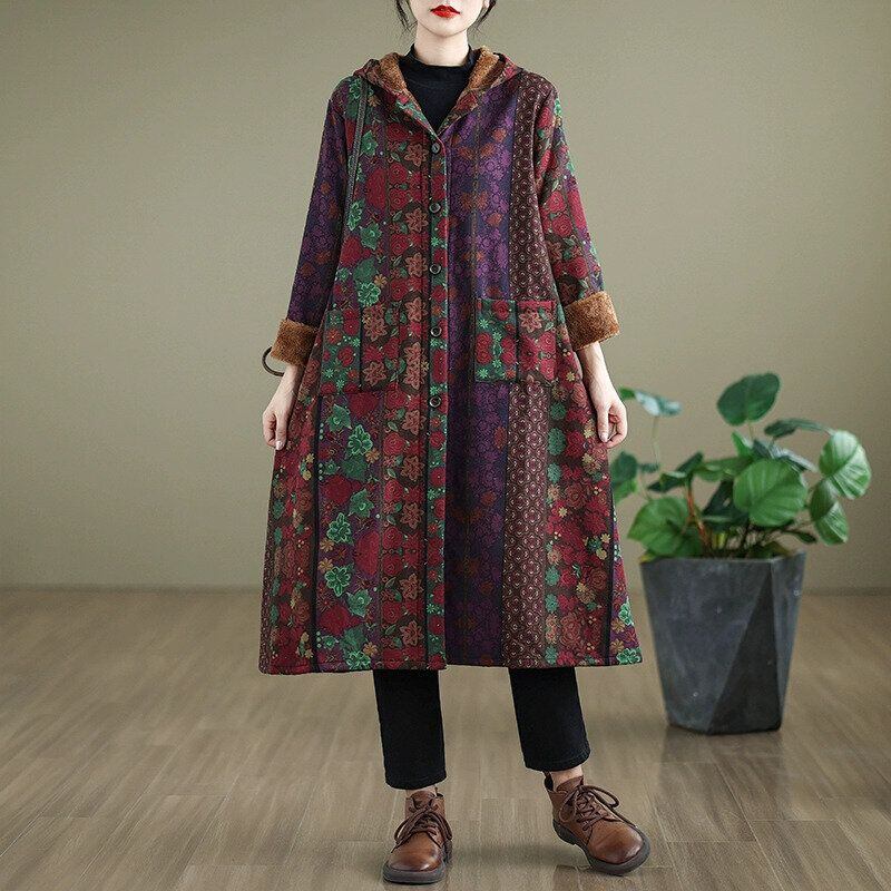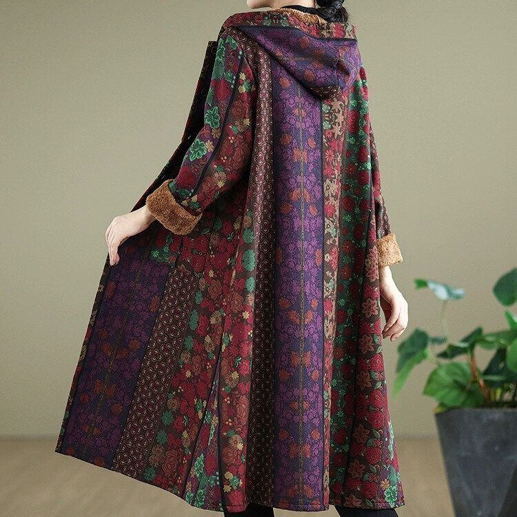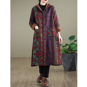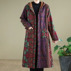 RETRO PRINT HOODED A-LINE LONG WARM LINING COAT 1color M-14841