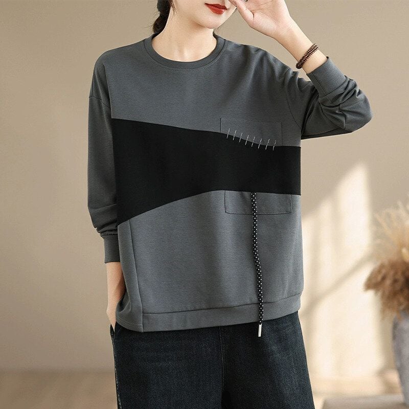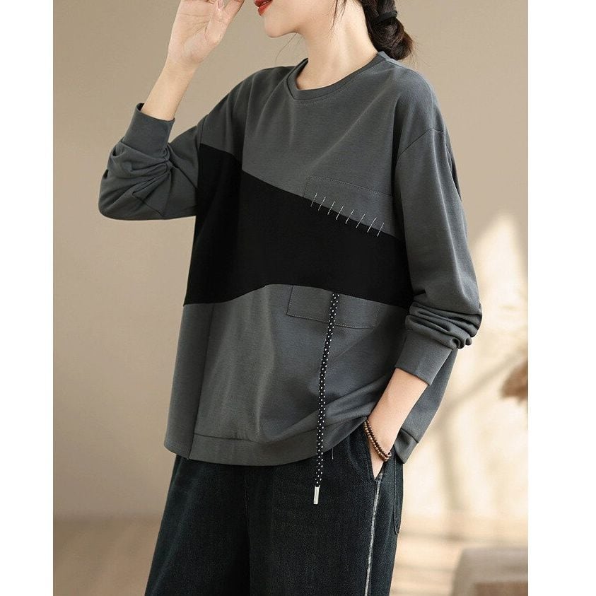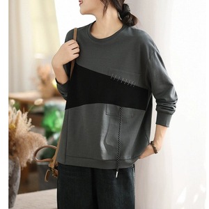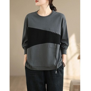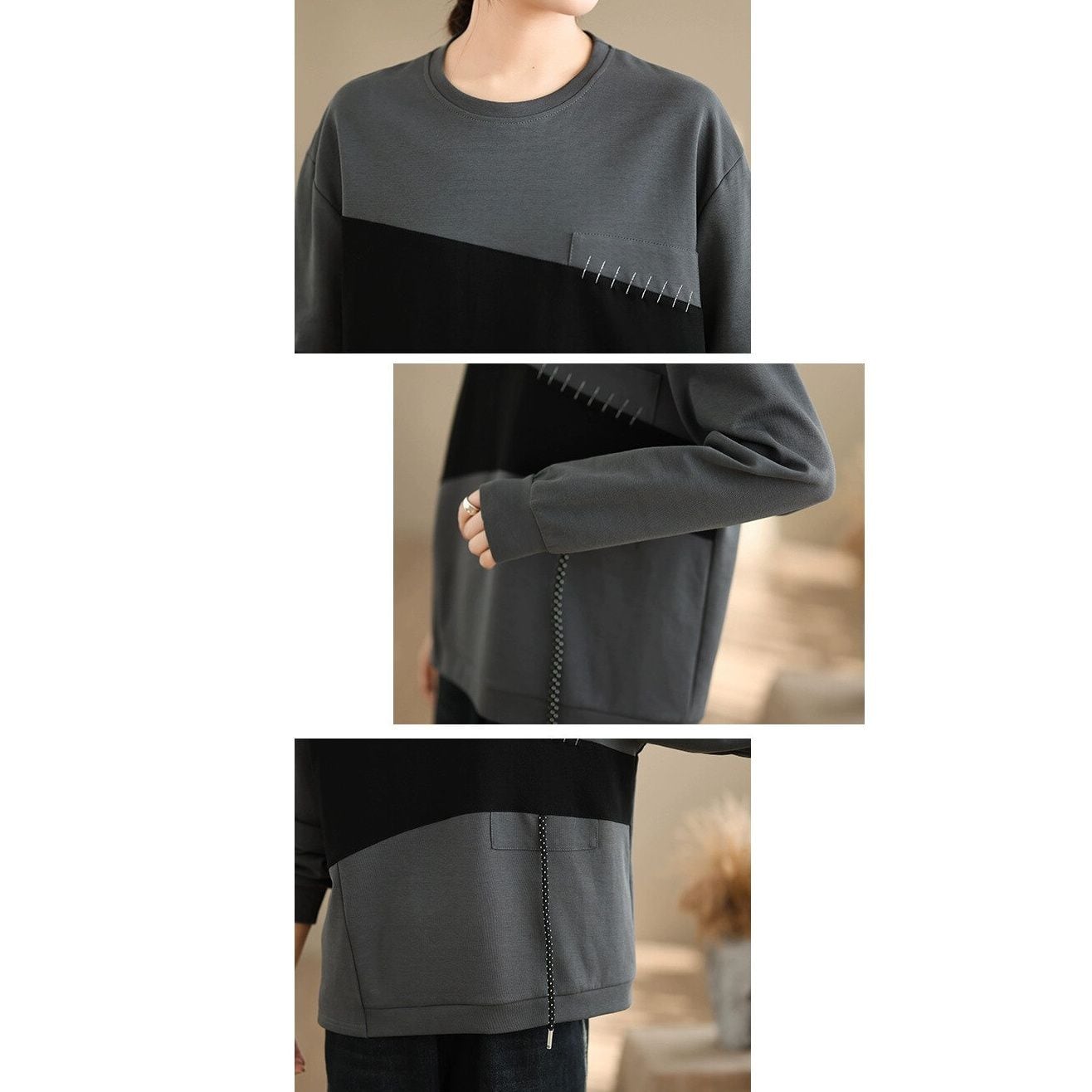 胸を横切るイレギュラーなコントラストスティッチが目を惹く、ラウンドネックのスウェットシャツです。スティッチ跡や紐の飾りが特徴的な、落ち着いた色味で合わせやすいカジュアルアイテムです。ブラックとグレーの2色から選べます。