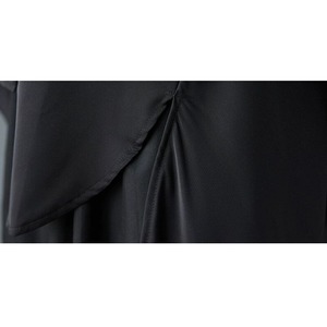 アシンメトリックなデザインがお洒落な、ポロ襟・長袖・イレギュラーヘムのチュニックシャツです。フロントに比べてバックが長めのAラインシルエットで、オールブラックがクールな印象のアイテムです。