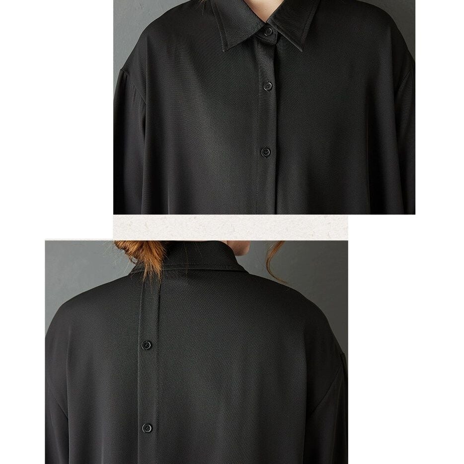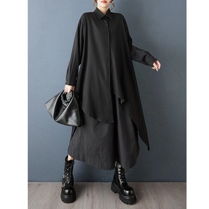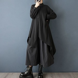 アシンメトリックなデザインがお洒落な、ポロ襟・長袖・イレギュラーヘムのシャツワンピースです。バックのボタンラインや斜めの裾のラインが特徴的な、ドレープの美しいオールブラックのアイテムです。