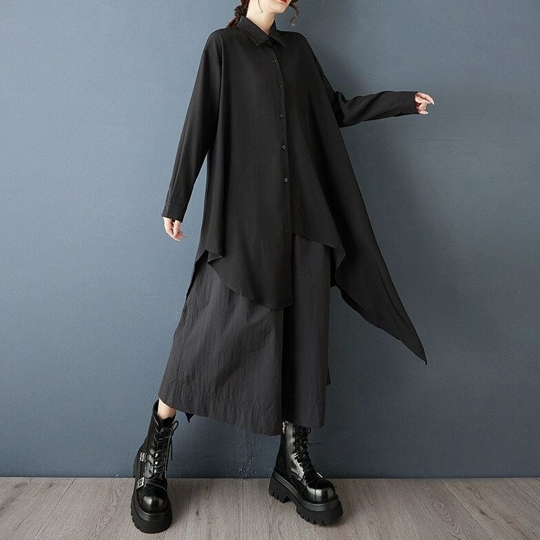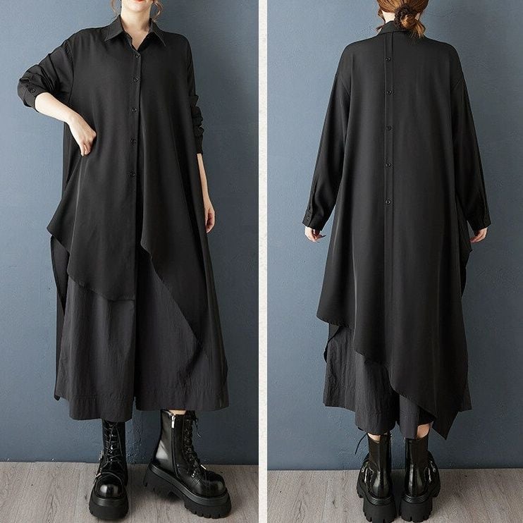 BLACK ASYMMETRIC A-LINE MIDI SHIRT DRESS 1color M-14847