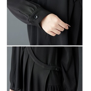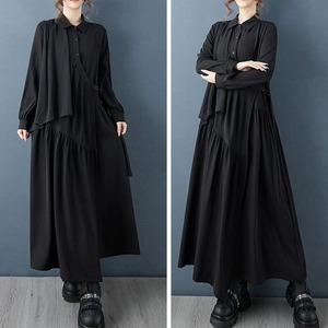 アシンメトリックなデザインがお洒落な、ポロ襟・長袖・ロング丈のシャツワンピースです。フラップやギャザーで作られたシルエットが美しい、オールブラックでアクセサリーなどの小物アレンジが利くアイテムです。