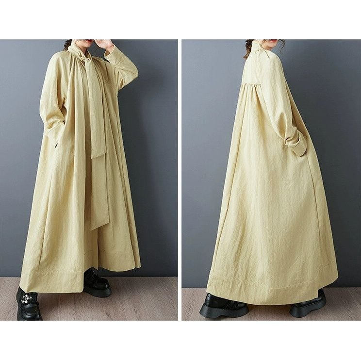 長くアレンジの利くボウタイがお洒落な、単色・長袖・マキシ丈のシャツワンピースです。ギャザーが作り出すAラインのシルエットが美しい、上品でエレガントな印象のアイテムです。ブラックとアプリコットイエローの2色から選べます。