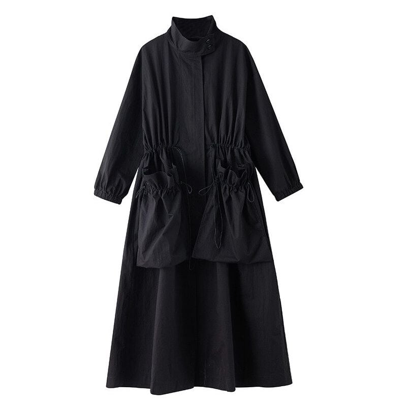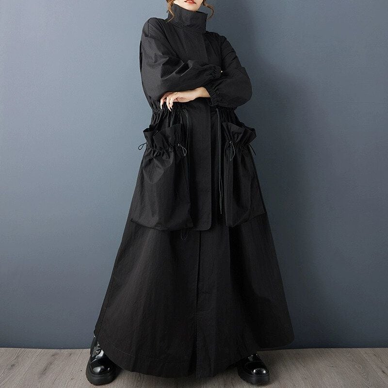 巾着袋のような大きなポケットがキュートな、スタンドカラー・長袖・マキシ丈のウインドブレーカーコートです。袖口がゴム加工されたAラインシルエットで、ウエストにドローコードが付いたフルジップデザインです。オールブラックでバッグなどのアレンジが利く、クールな印象のアイテムです。